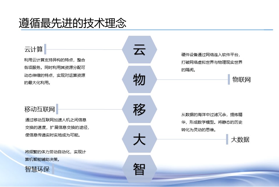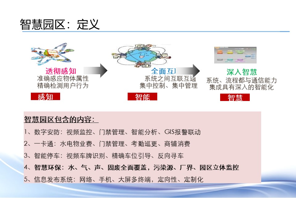 1、数字安防:视频监控、门禁管理、智能分析、GIS报警联动 2、一卡通:水电物业费、门禁管理、考勤巡更、商铺消费 3、智能停车:视频车牌识别、精确车位引导、反向寻车 4、智慧环保:水、气、声、固废全面覆盖,污染源、厂界、园区立体监控 5、信息发布系统:网络、手机、大屏多终端,定向性、定制化