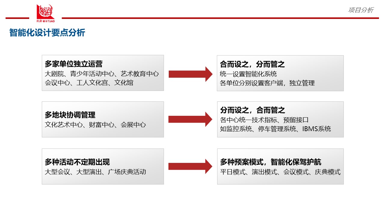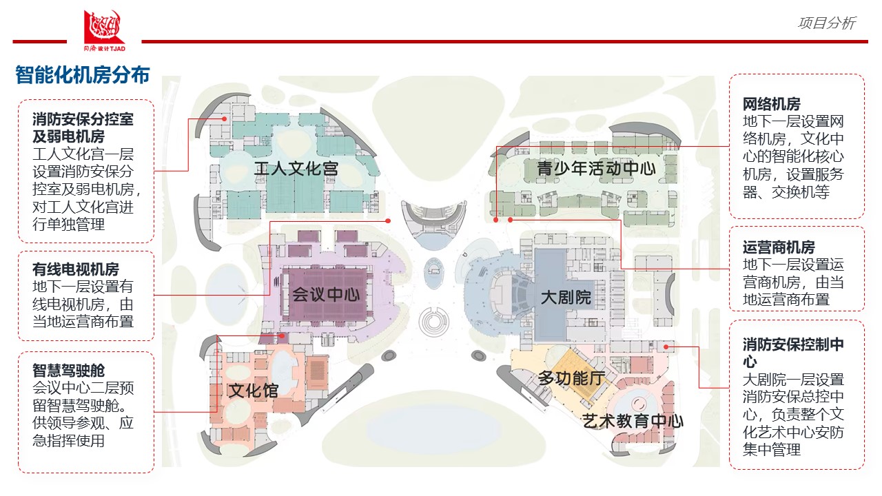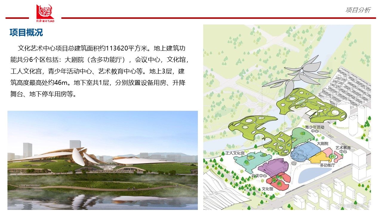 文化艺术中心项目总建筑面积约113620平方米。地上建筑功能共分6个区包括:大剧院(含多功能厅),会议中心,文化馆,工人文化宫,青少年活动中心、艺术教育中心等。地上3层,建筑高度最高处约46m。地下室共1层,分别放置设备用房、升降舞台、地下停车用房等。