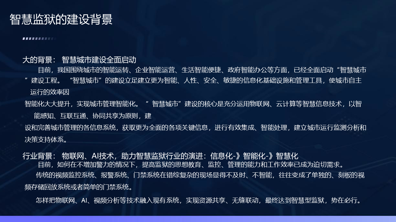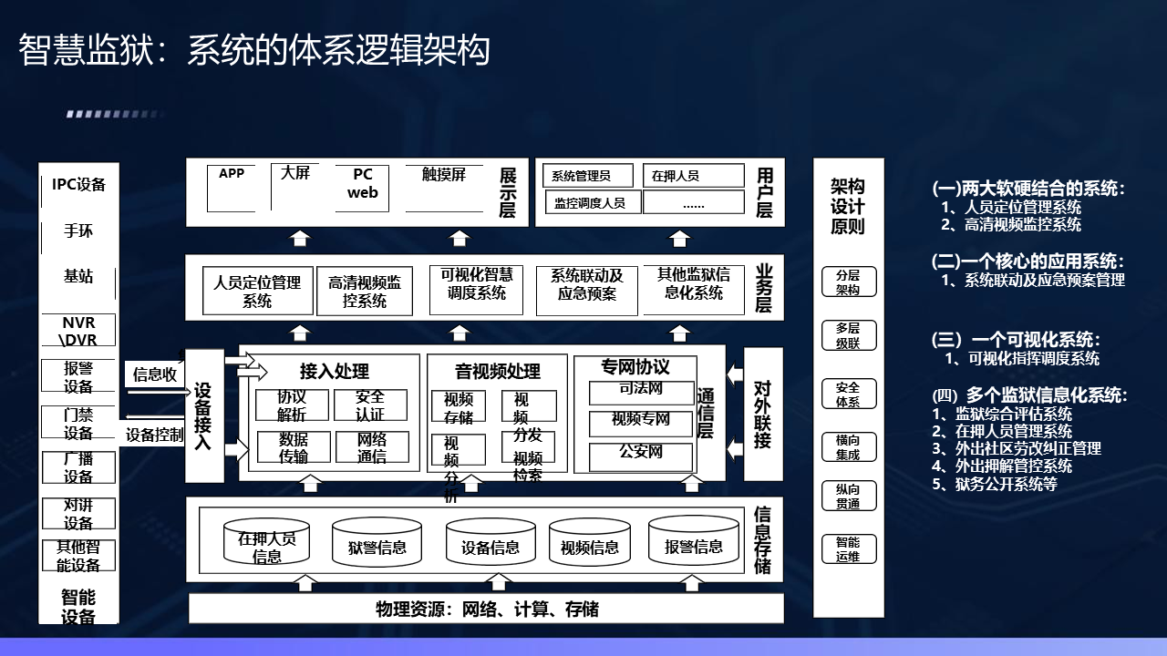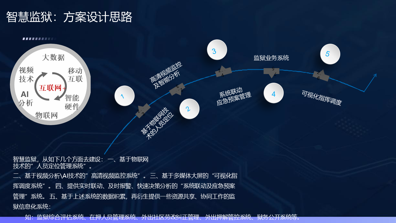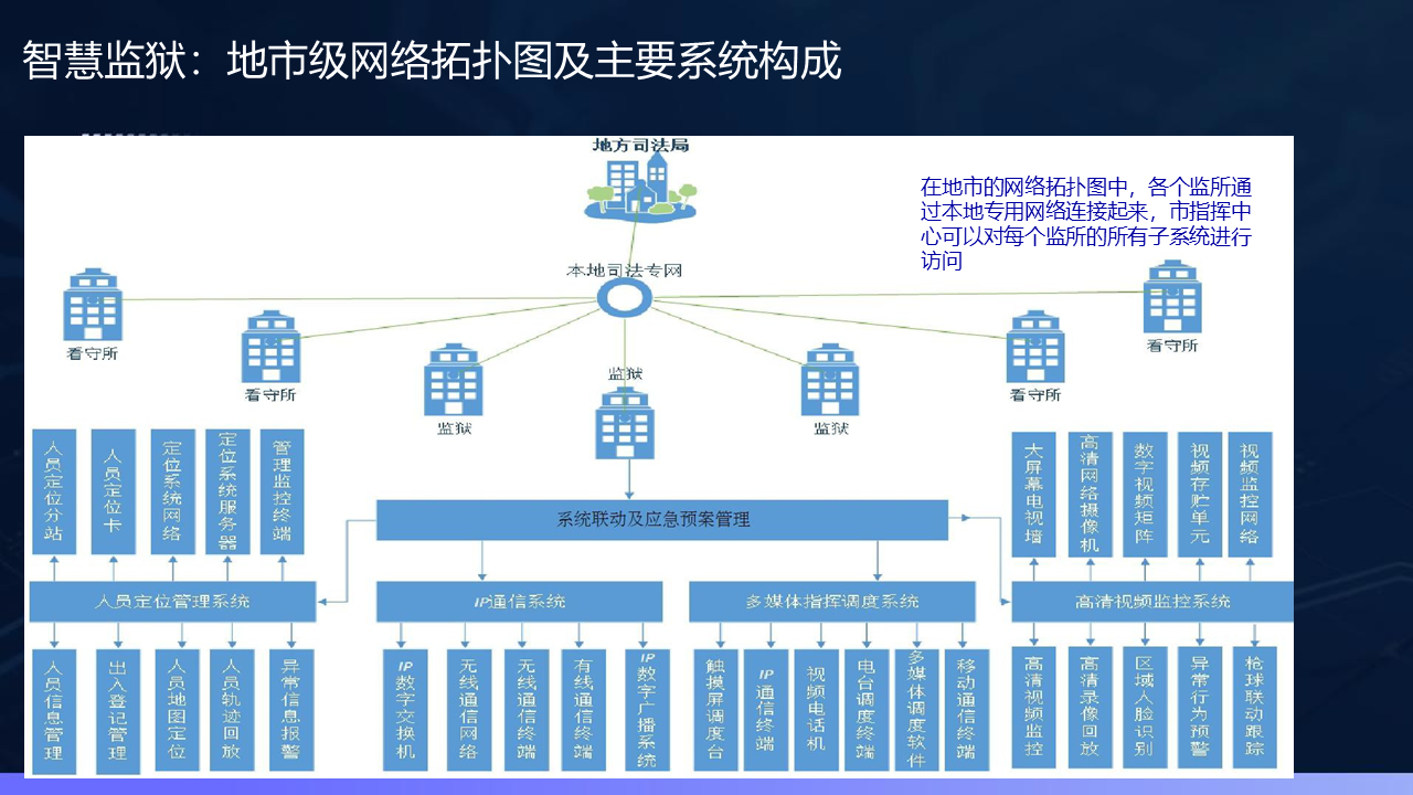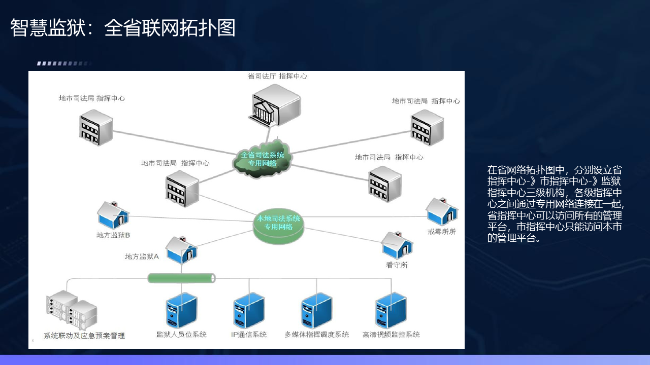 “智慧监狱”以监控图像资源、物联网感知信息为核 心,实现周界报警、高压电网、紧急报警、巡更、门禁、 对讲、会见录音等各类安防信息。 另外辅以狱政管理、教育改造、劳动改造、狱内侦查、 生活卫生、综合治理等业务信息的全面集成、整合。 还需以“三级警戒架构”为核心,打造省指挥中心-》 市指挥中心-》监狱指挥中心的三级组织形式,综合应用 平台可以做到各类资源协同共享、应急指挥、综合信息 研判和辅助决策。