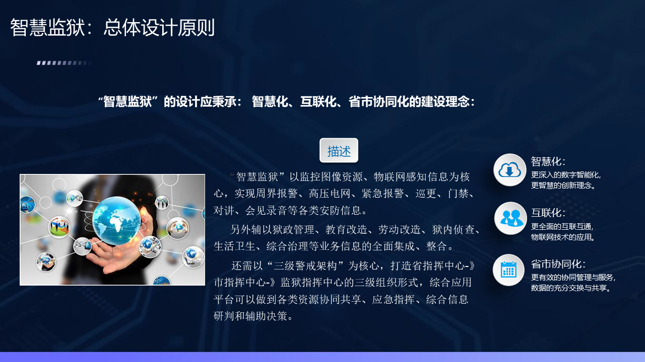 “智慧监狱”的设计应秉承: 智慧化、互联化、省市协同化的建设理念: