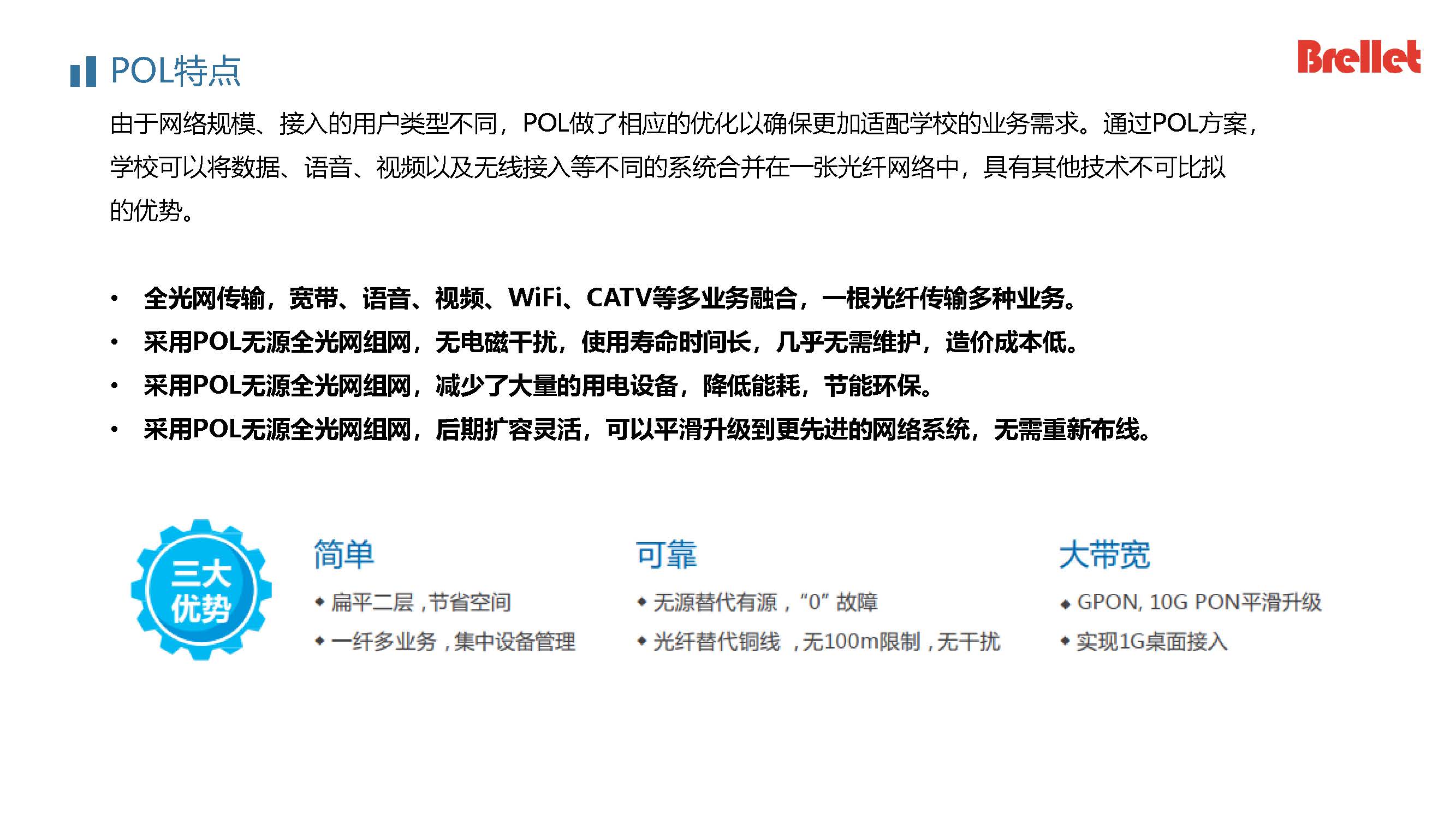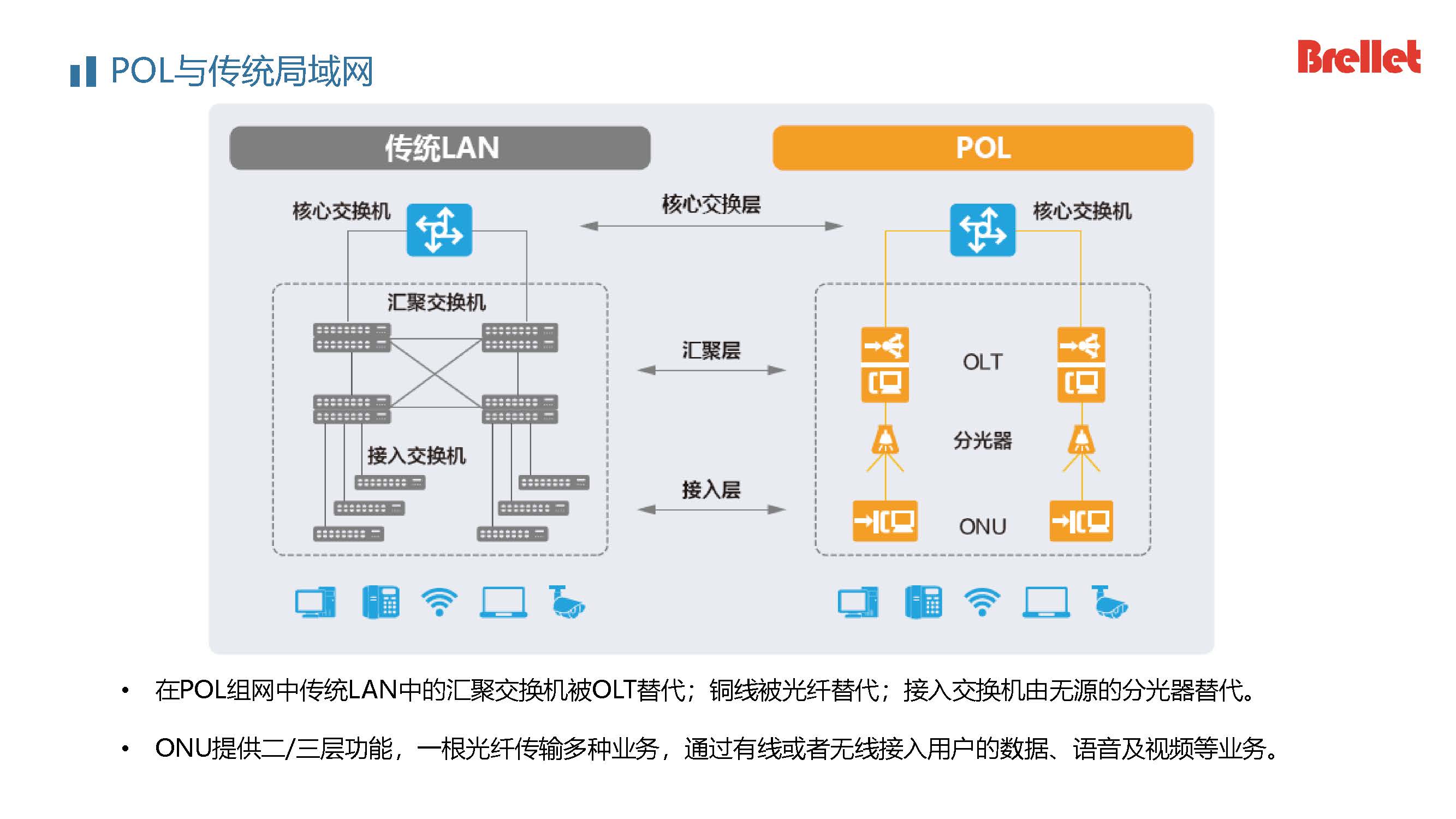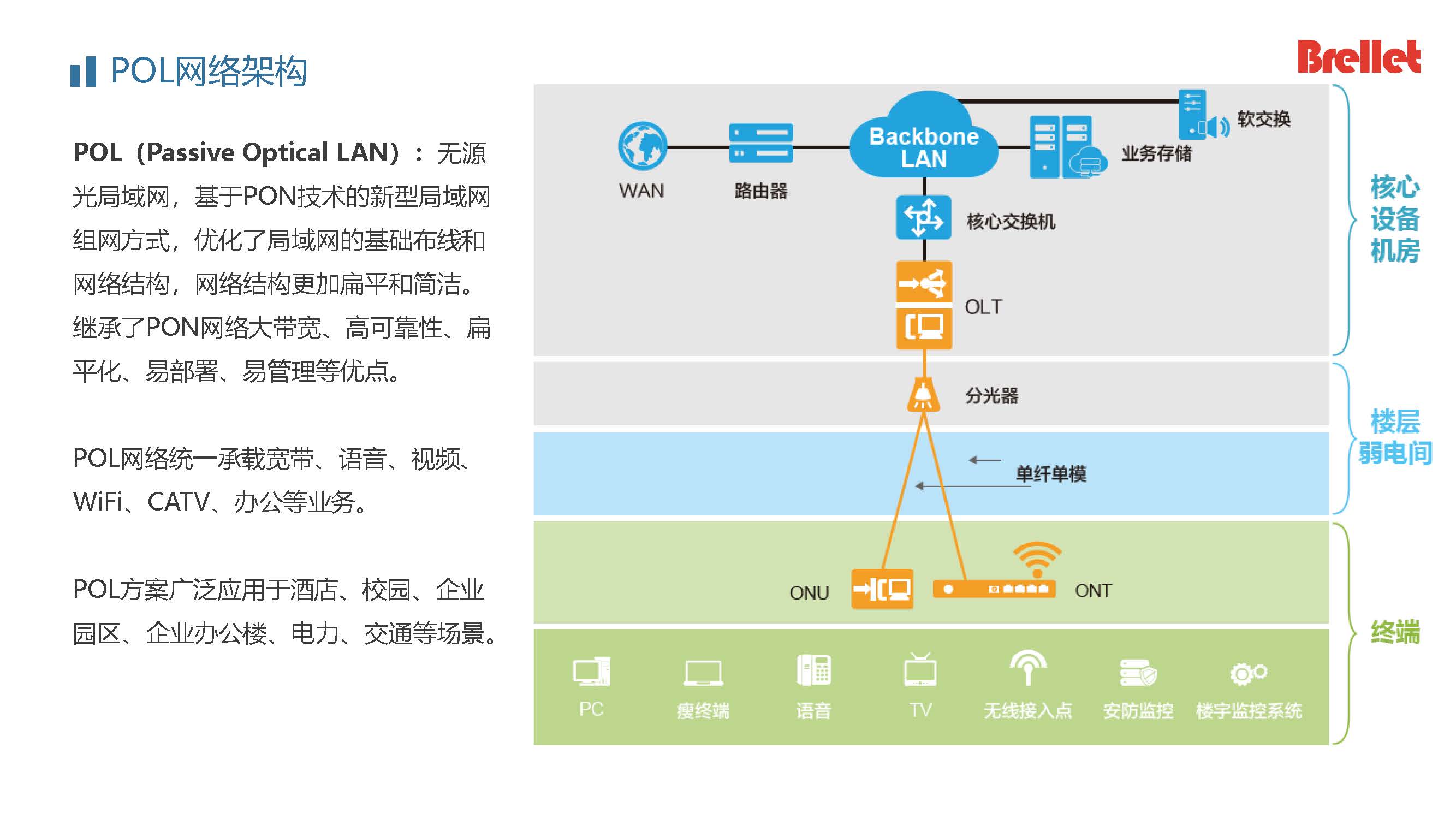 POL(Passive Optical LAN):无源光局域网,基于PON技术的新型局域网组网方式,优化了局域网的基础布线和网络结构,网络结构更加扁平和简洁。继承了PON网络大带宽、高可靠性、扁平化、易部署、易管理等优点。