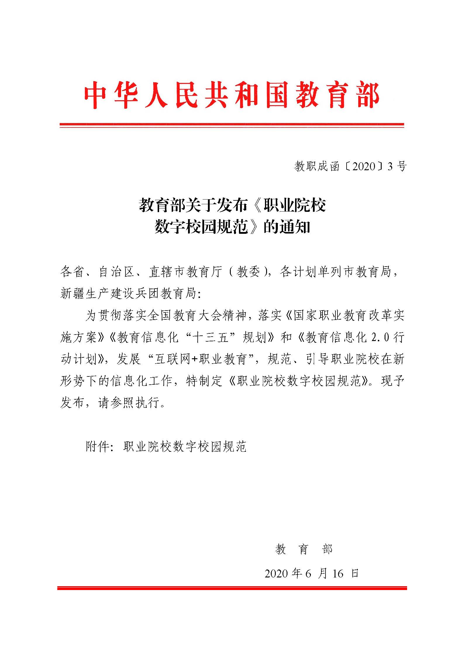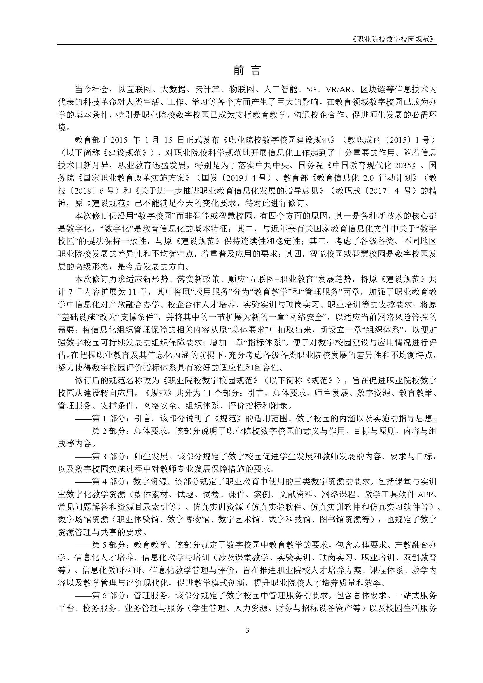 教育部于 2015 年 1 月 15 日正式发布《职业院校数字校园建设规范》(教职成函〔2015〕1 号)(以下简称《建设规范》),对职业院校科学规范地开展信息化工作起到了十分重要的作用。随着信息 技术日新月异,职业教育迅猛发展,特别是为了落实中共中央、国务院《中国教育现代化 2035》、国 务院《国家职业教育改革实施方案》(国发〔2019〕4 号)、教育部《教育信息化 2.0 行动计划》(教 技〔2018〕6 号)和《关于进一步推进职业教育信息化发展的指导意见》(教职成〔2017〕4 号)的精 神,原《建设规范》已不能满足今天的变化要求,特对此进行修订。