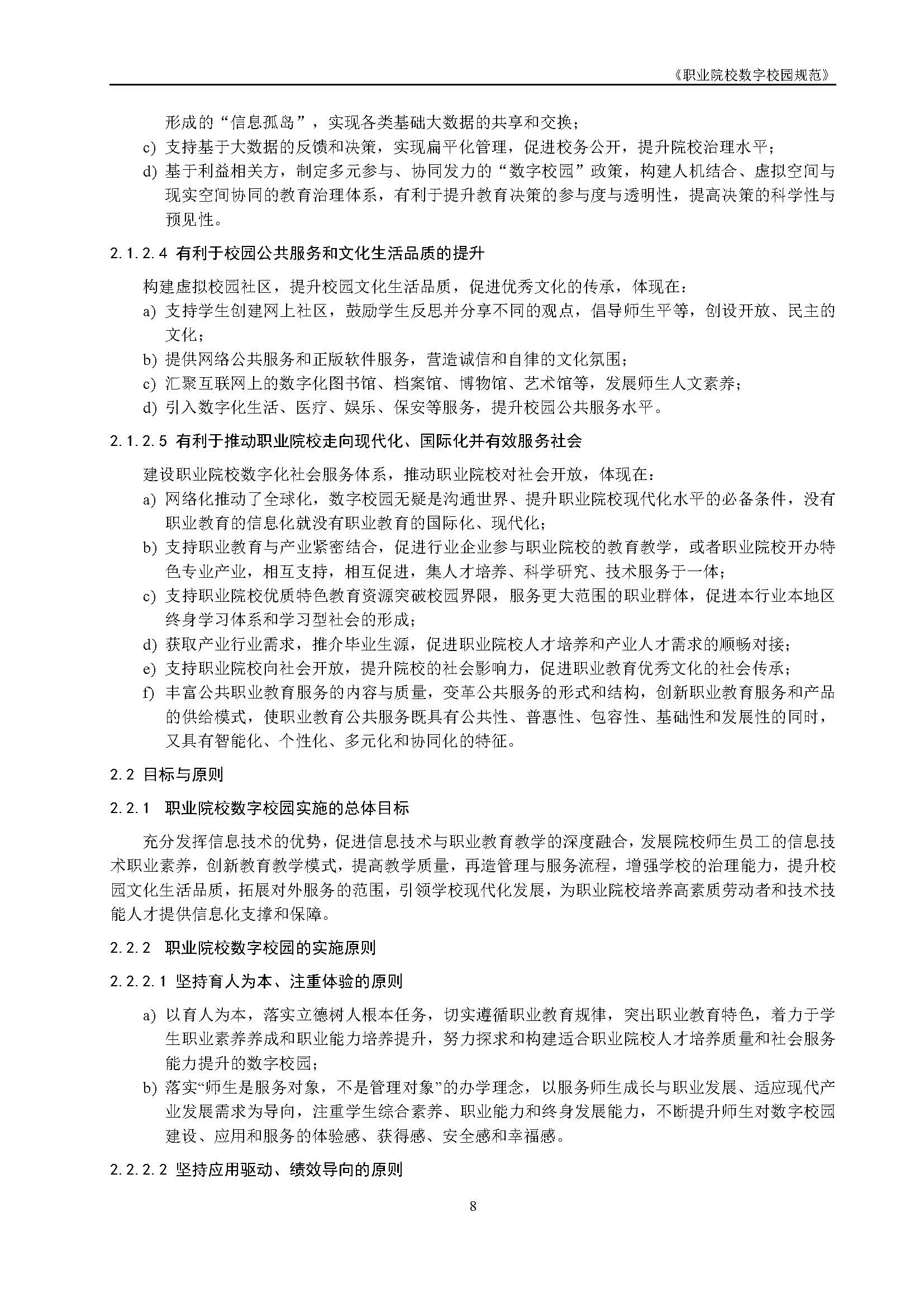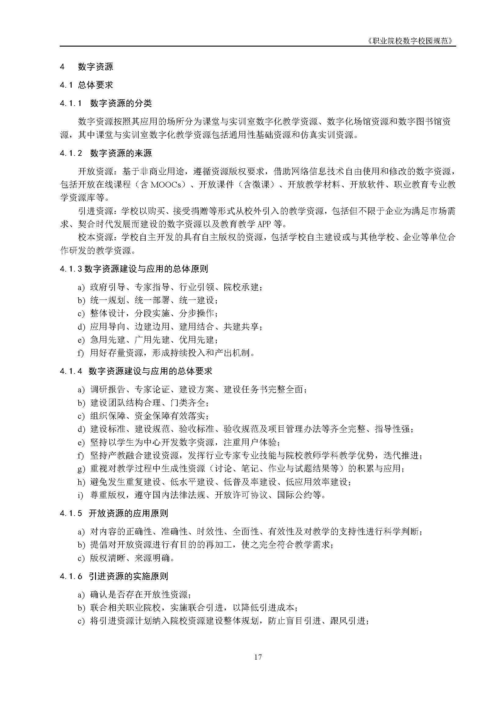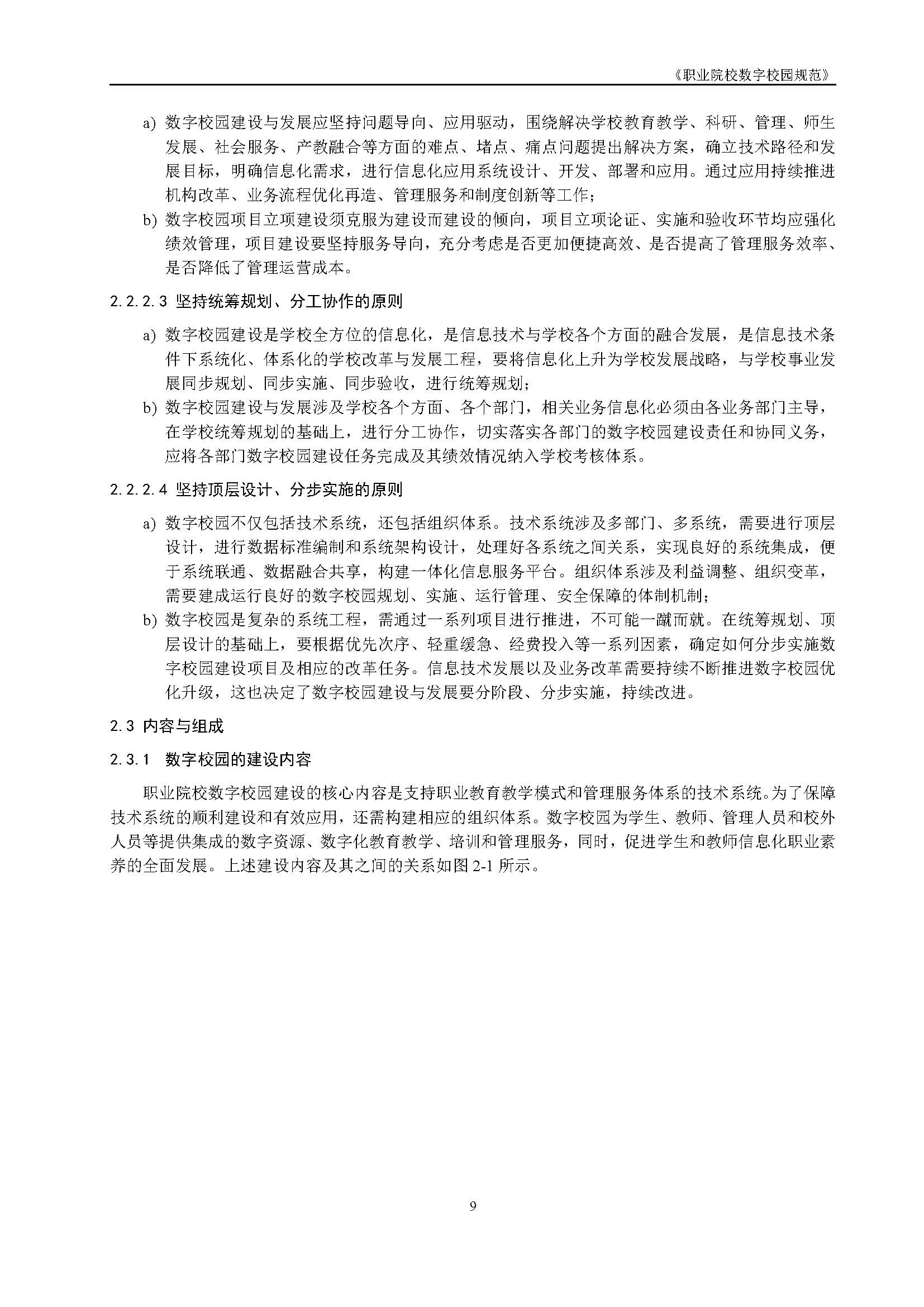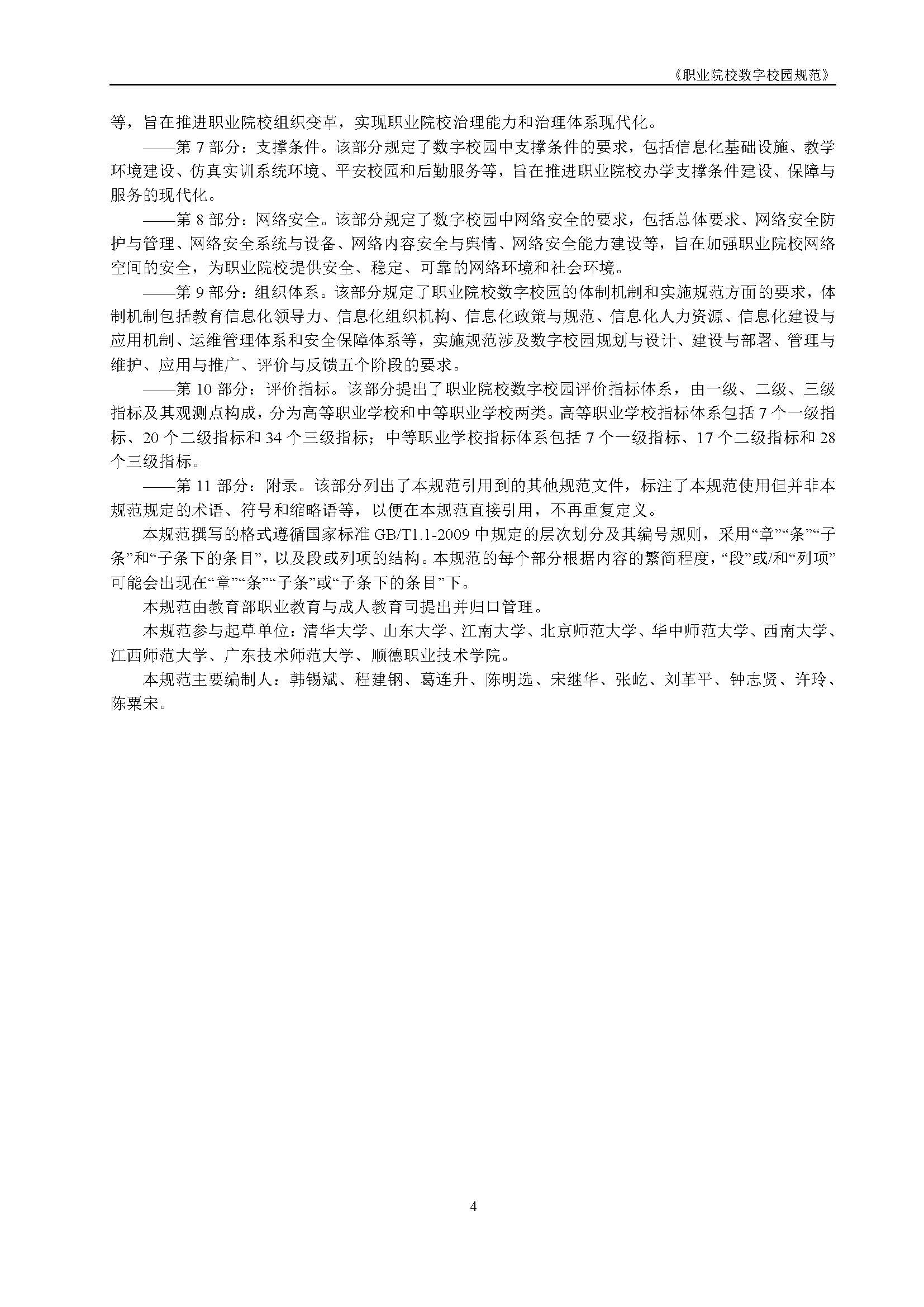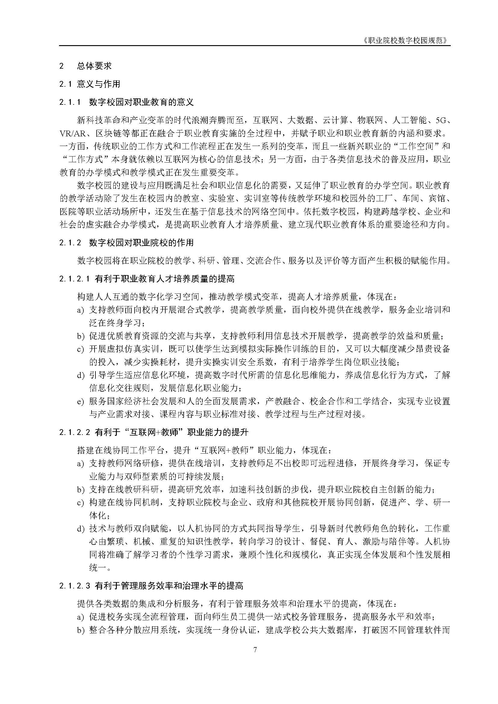 ——第 2 部分:总体要求。该部分说明了职业院校数字校园的意义与作用、目标与原则、内容与组 成等内容。