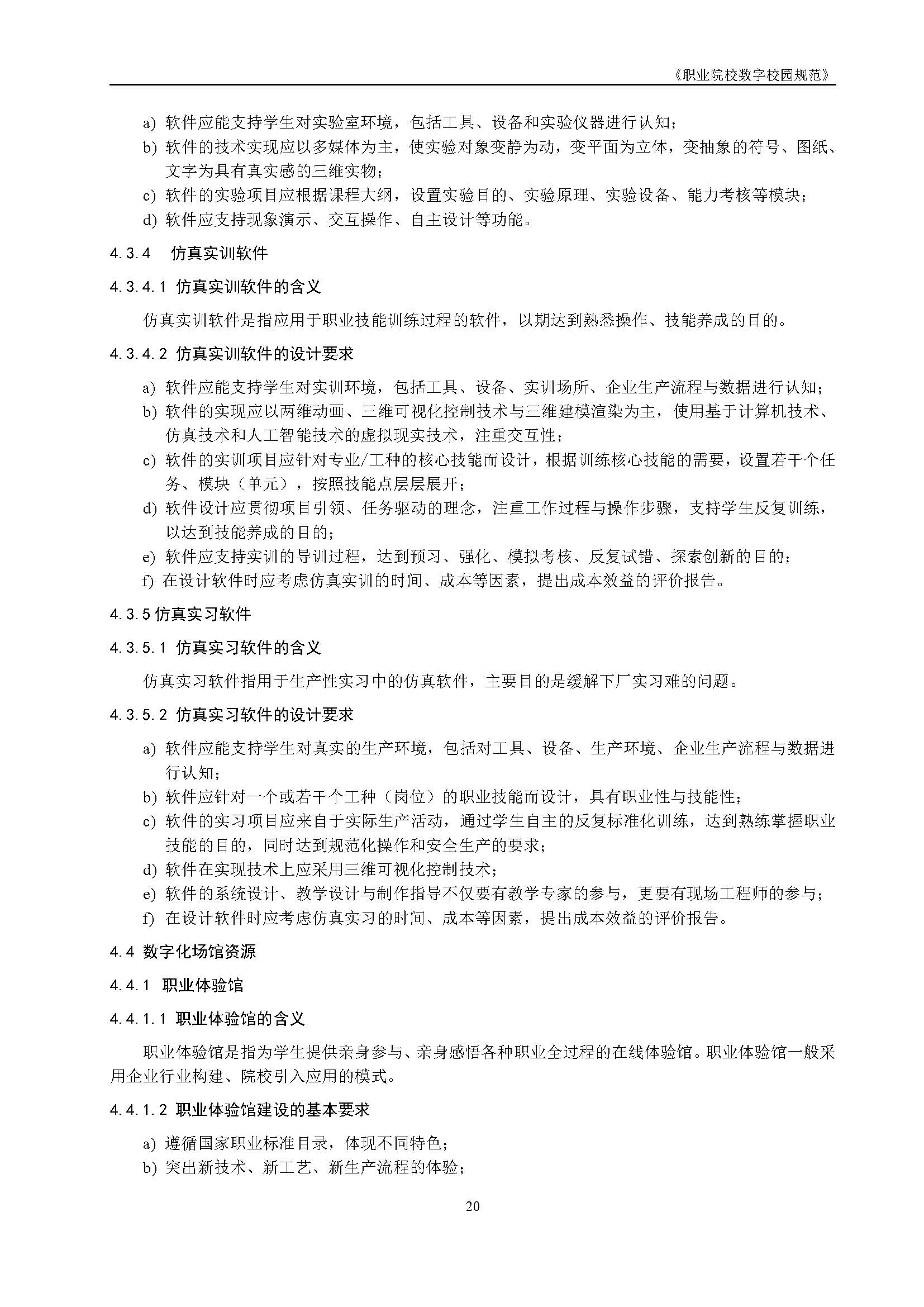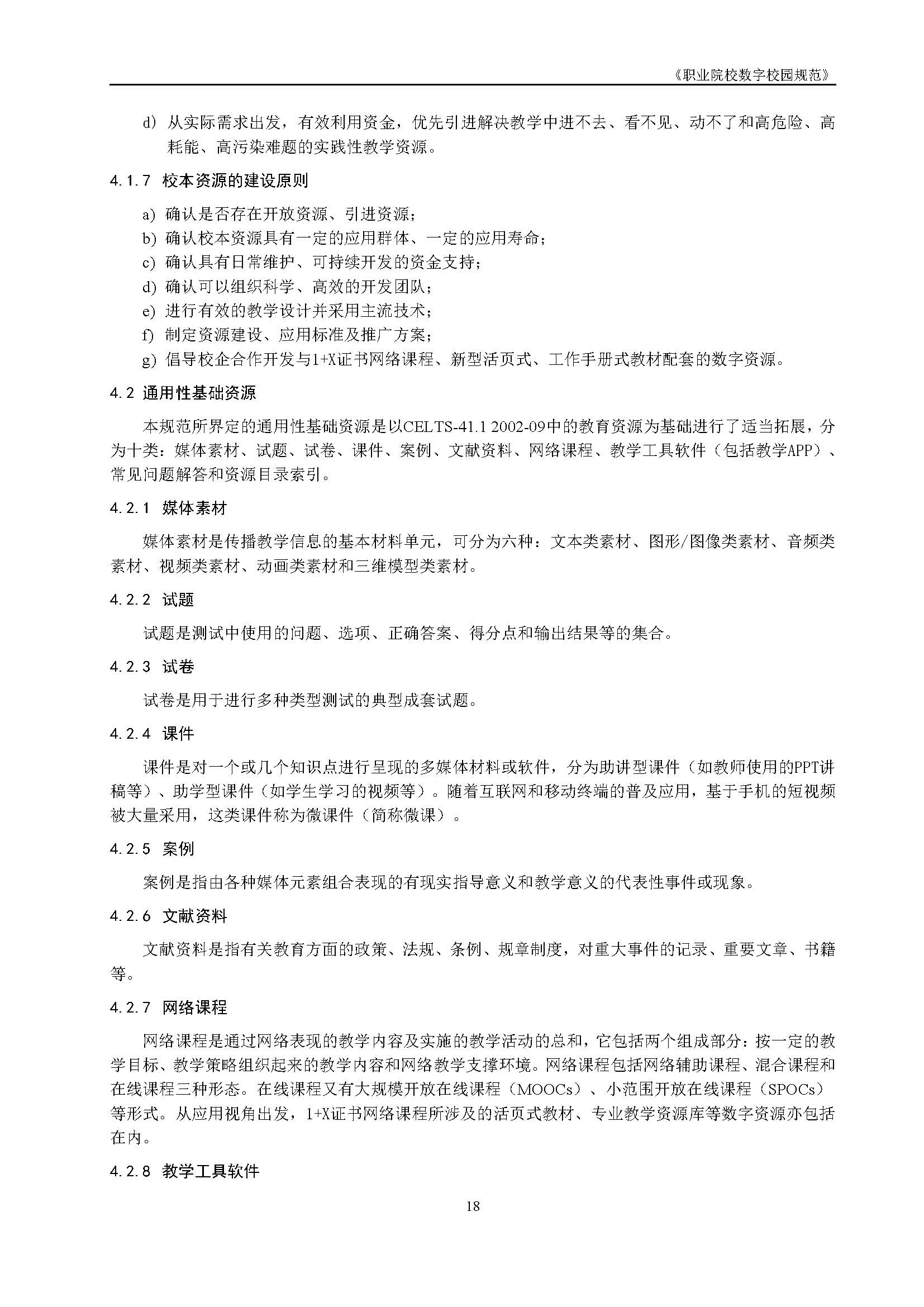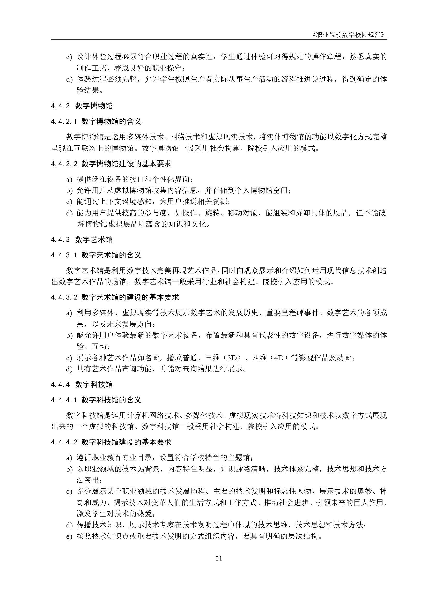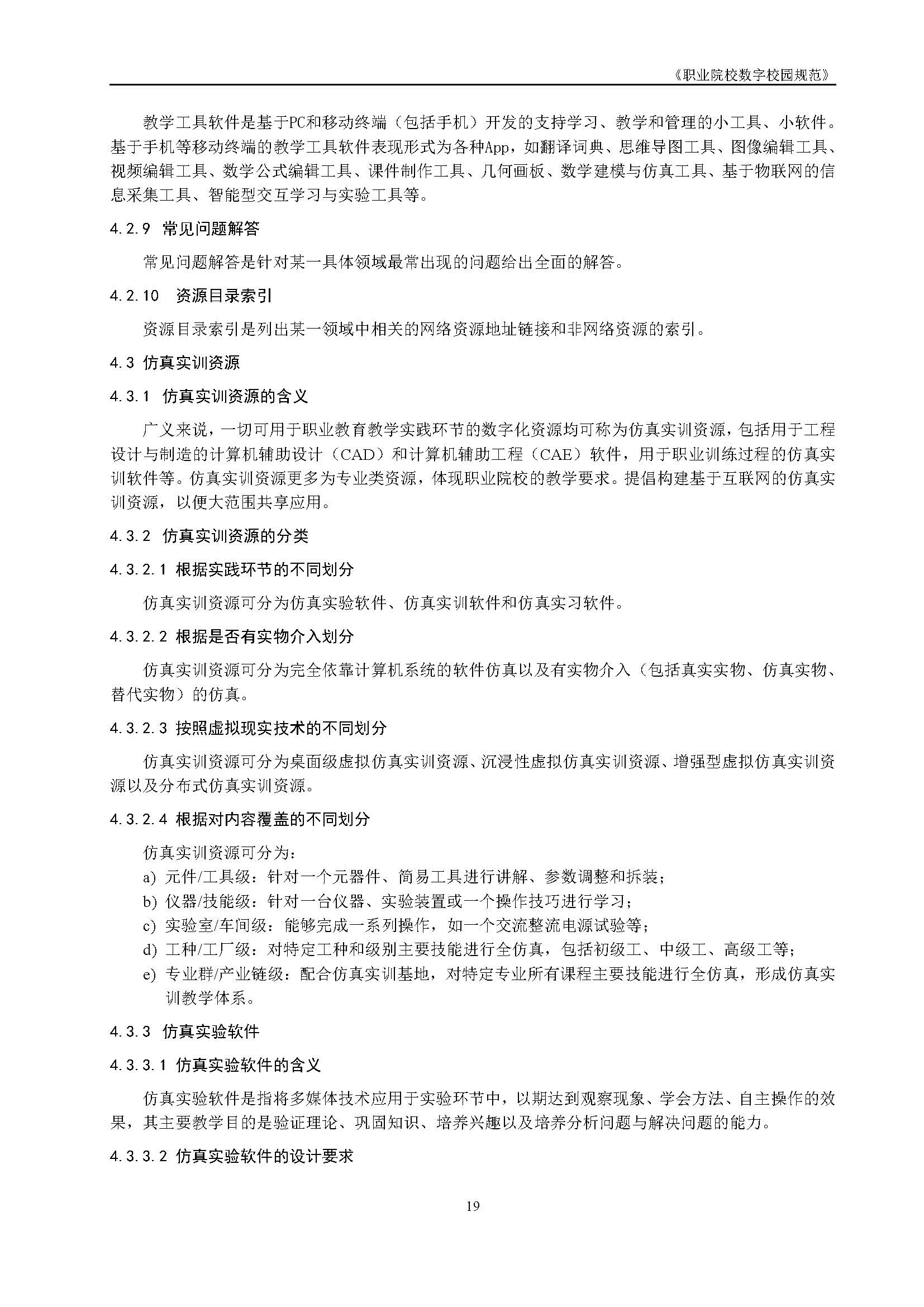 ——第 4 部分:数字资源。该部分规定了职业教育中使用的三类数字资源的要求,包括课堂与实训 室数字化教学资源(媒体素材、试题、试卷、课件、案例、文献资料、网络课程、教学工具软件 APP、 常见问题解答和资源目录索引等)、仿真实训资源(仿真实验软件、仿真实训软件和仿真实习软件等)、 数字场馆资源(职业体验馆、数字博物馆、数字艺术馆、数字科技馆、图书馆资源等),也规定了数字 资源管理与共享的要求。