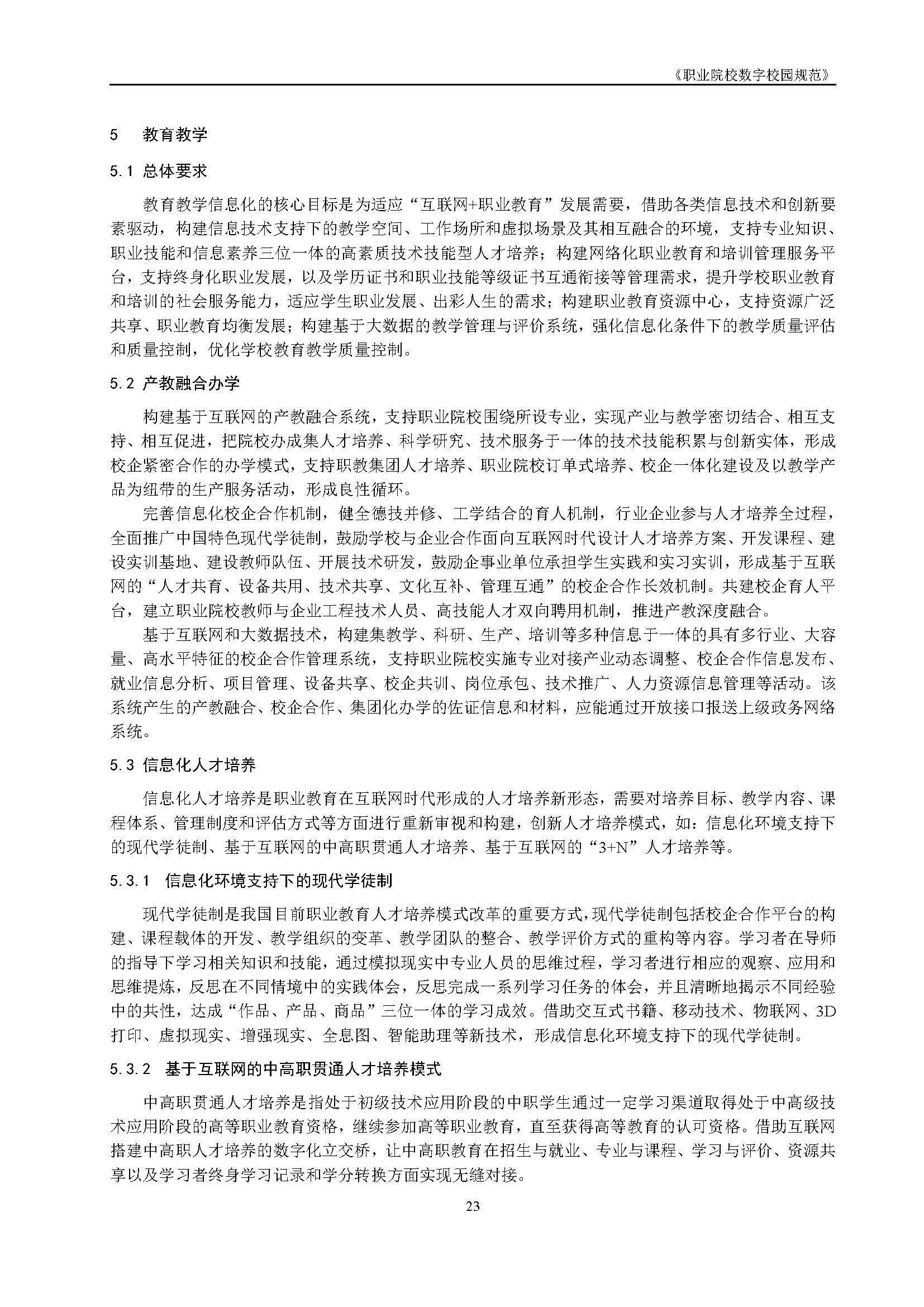 ——第 5 部分:教育教学。该部分规定了数字校园中教育教学的要求,包含总体要求、产教融合办 学、信息化人才培养、信息化教学与培训(涉及课堂教学、实验实训、顶岗实习、职业培训、双创教育 等)、信息化教研科研、信息化教学管理与评价,旨在推进职业院校人才培养方案、课程体系、教学内 容以及教学管理与评价现代化,促进教学模式创新,提升职业院校人才培养质量和效率。