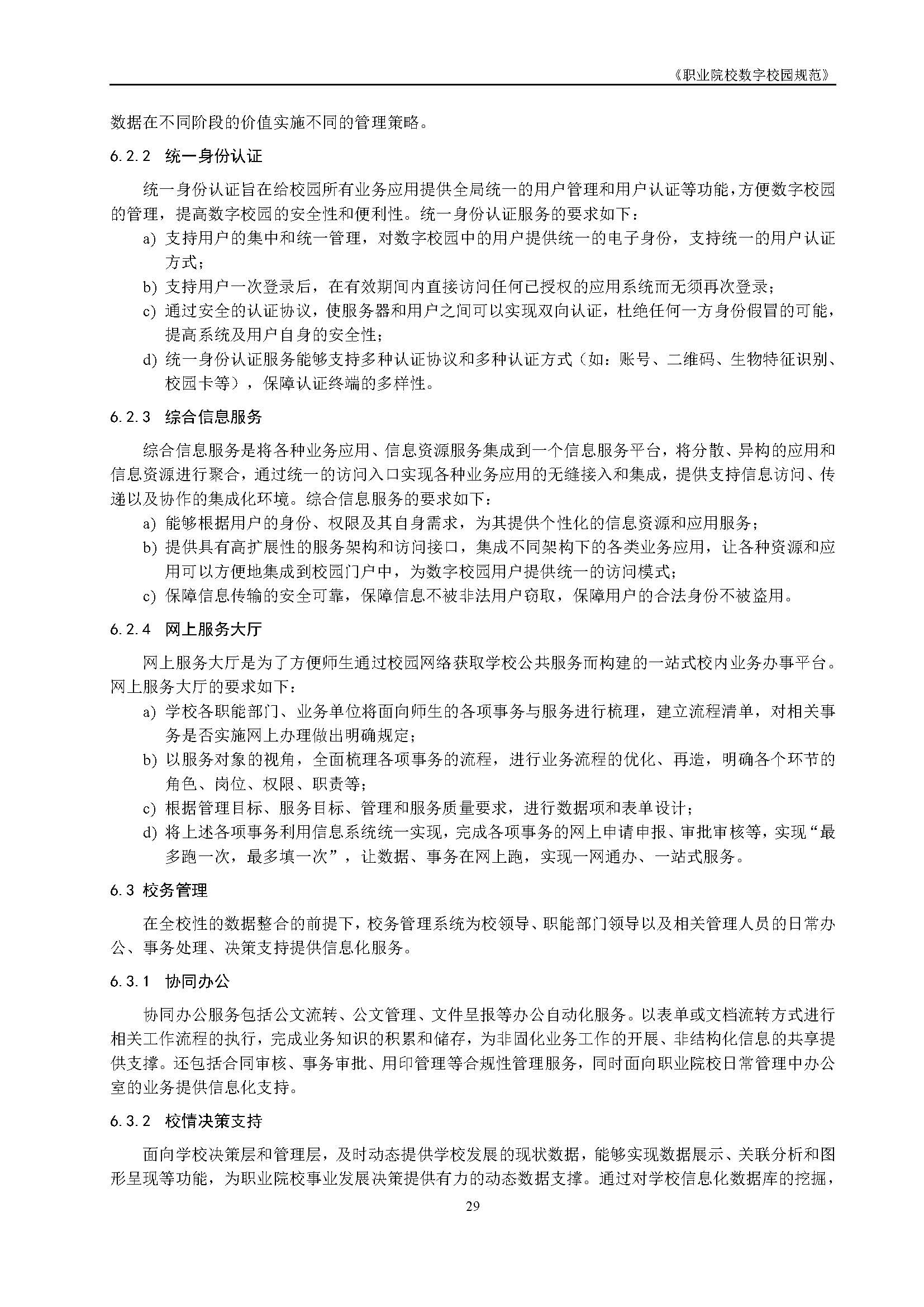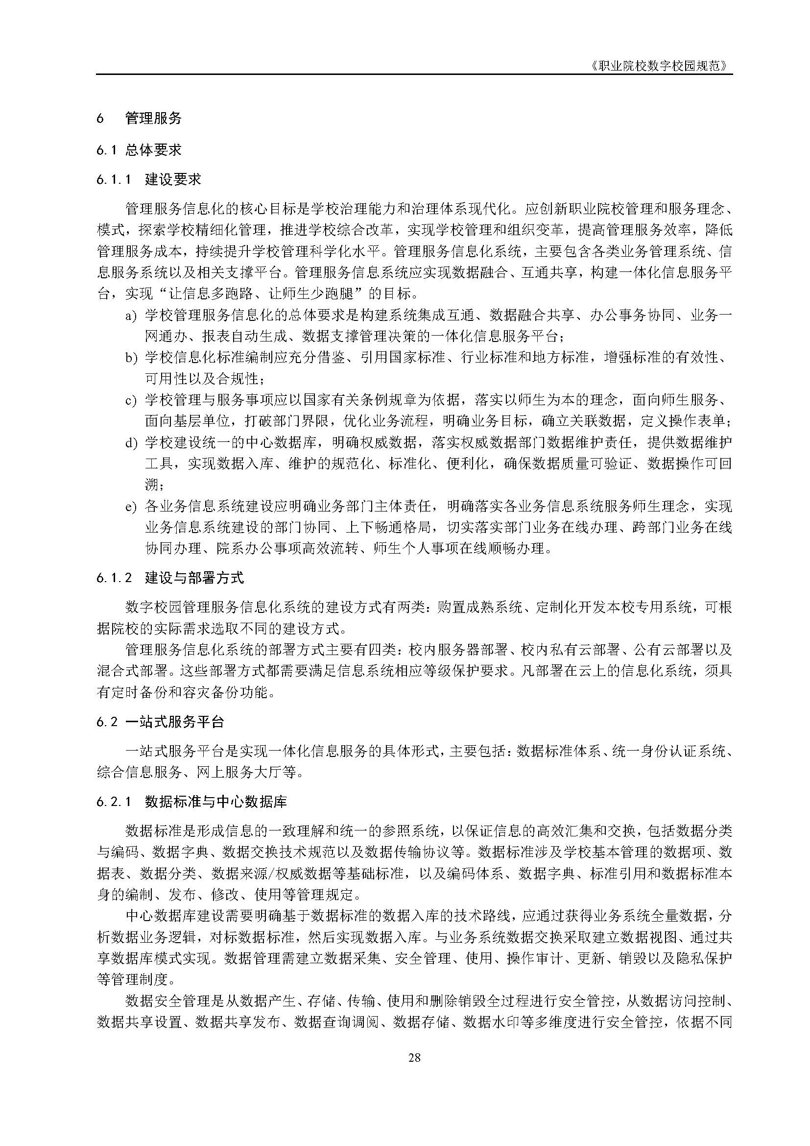 ——第 6 部分:管理服务。该部分规定了数字校园中管理服务的要求,包含总体要求、一站式服务 平台、校务服务、业务管理与服务(学生管理、人力资源、财务与招标设备资产等)以及校园生活服务等,旨在推进职业院校组织变革,实现职业院校治理能力和治理体系现代化。