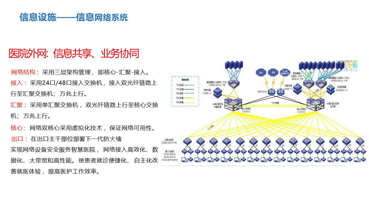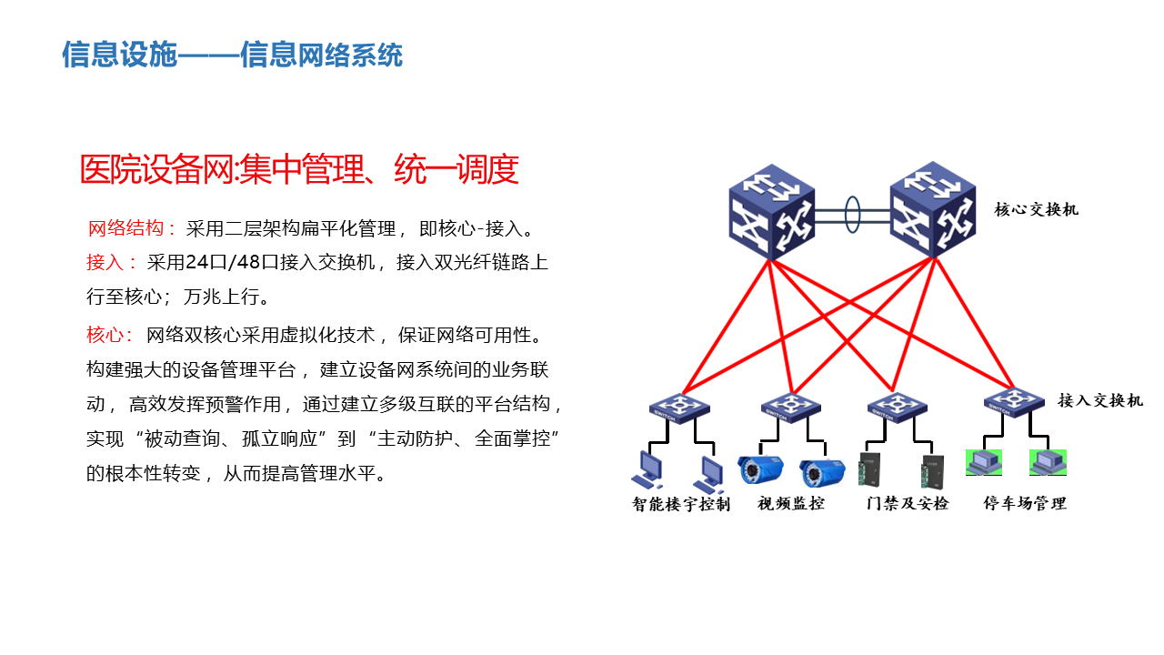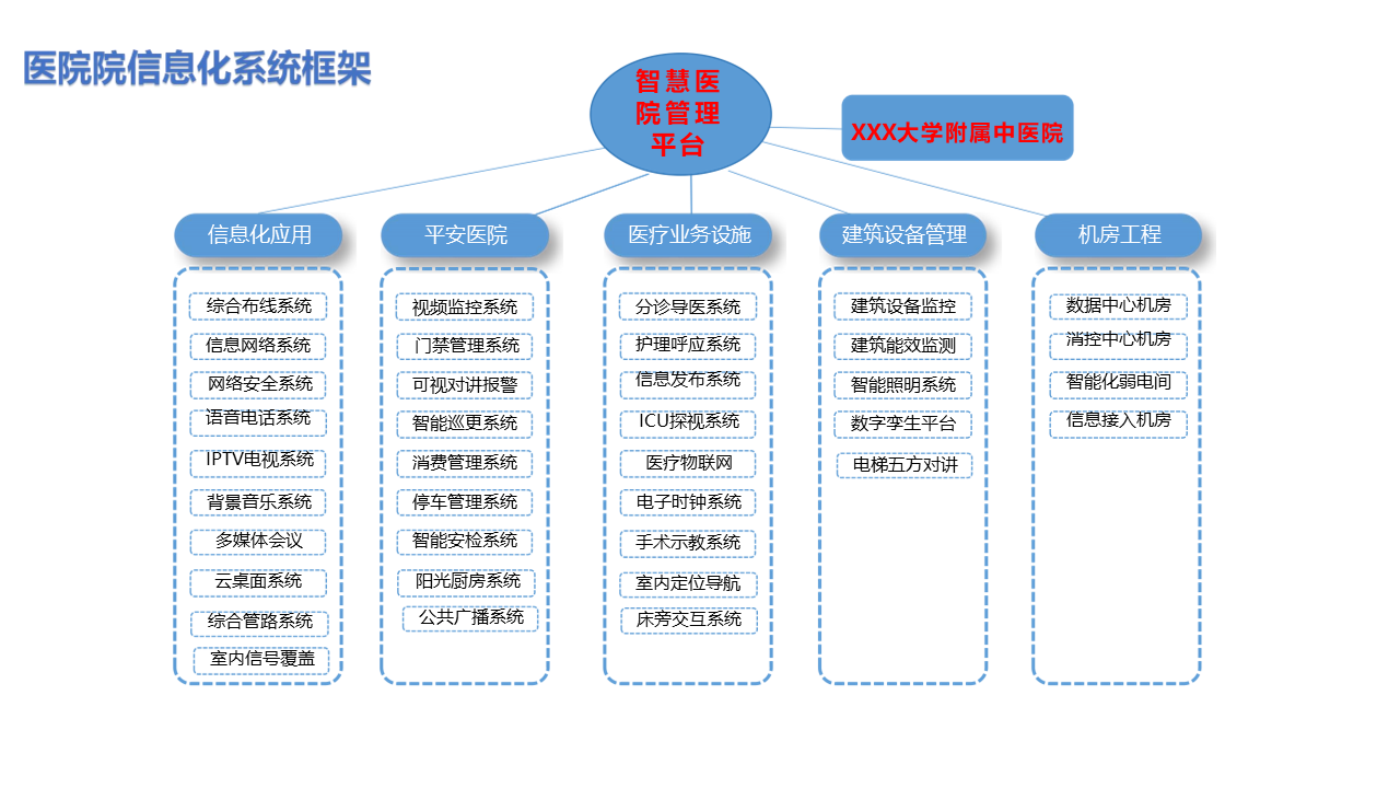 主要建设业务应用(包括便民服务、 医疗服务、 医疗管理、 医疗协同、运营管理、后勤管理、科研管 理、教学管理、人力资源管理等)、信息平台(包括信 息平台基础、平台服务集成等)、基础设施(包括机房基础、硬件设备、基础软件等)、安全防护(包括数据 中心安全、终端安全、网络安全、容灾备份等)、新兴技术(包括大数据技术、云计算技术、人工智能技术、 物联网技 术等)等务应用,