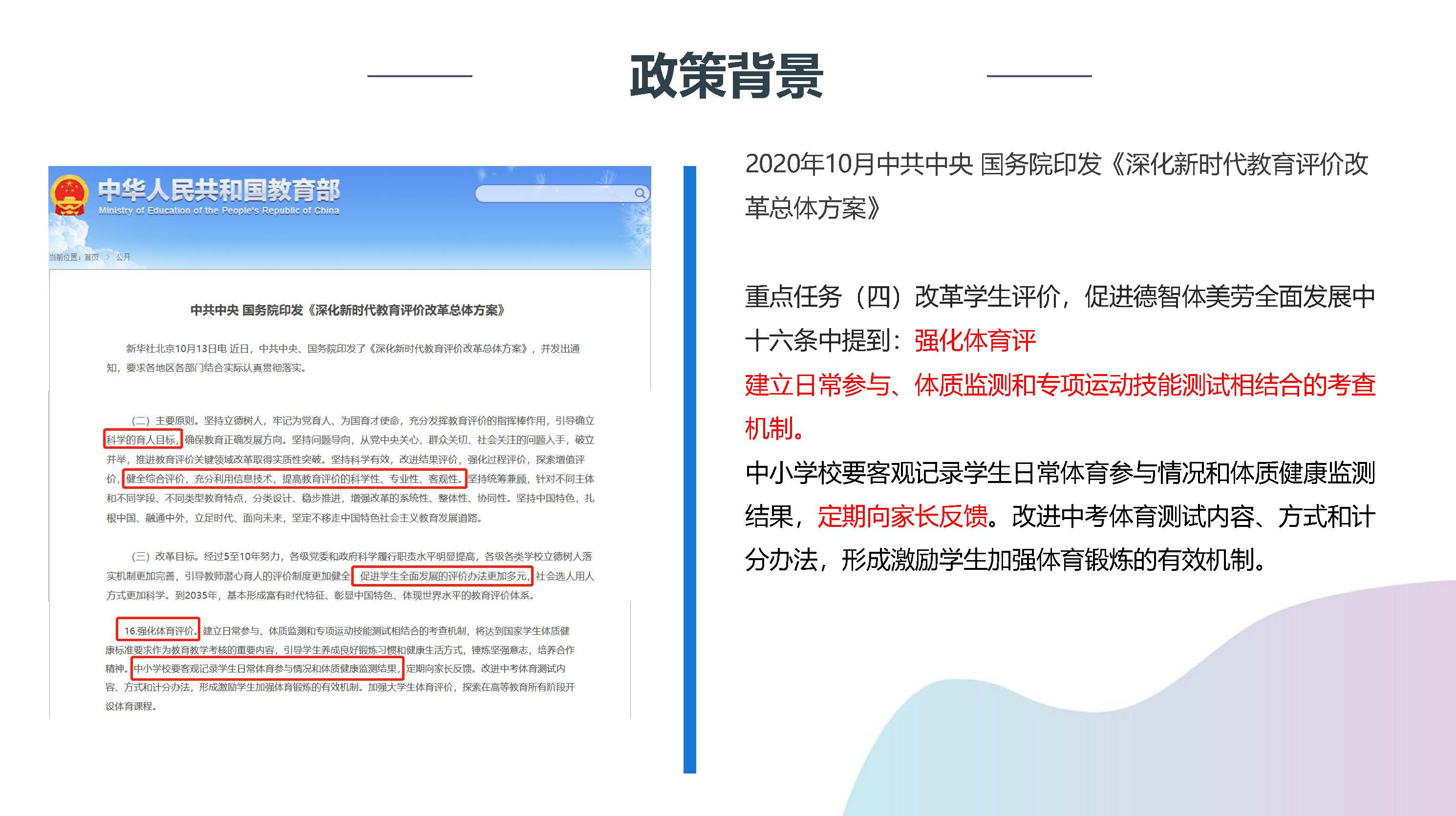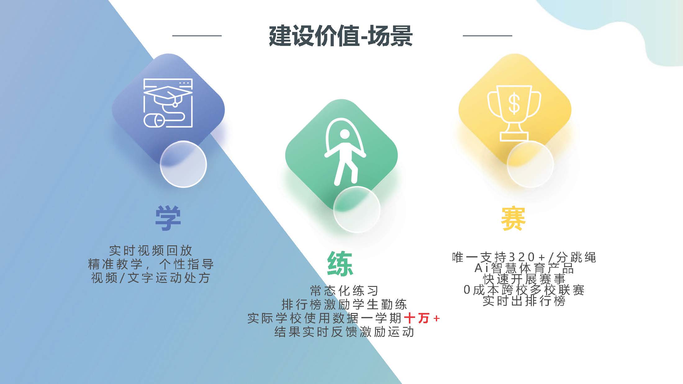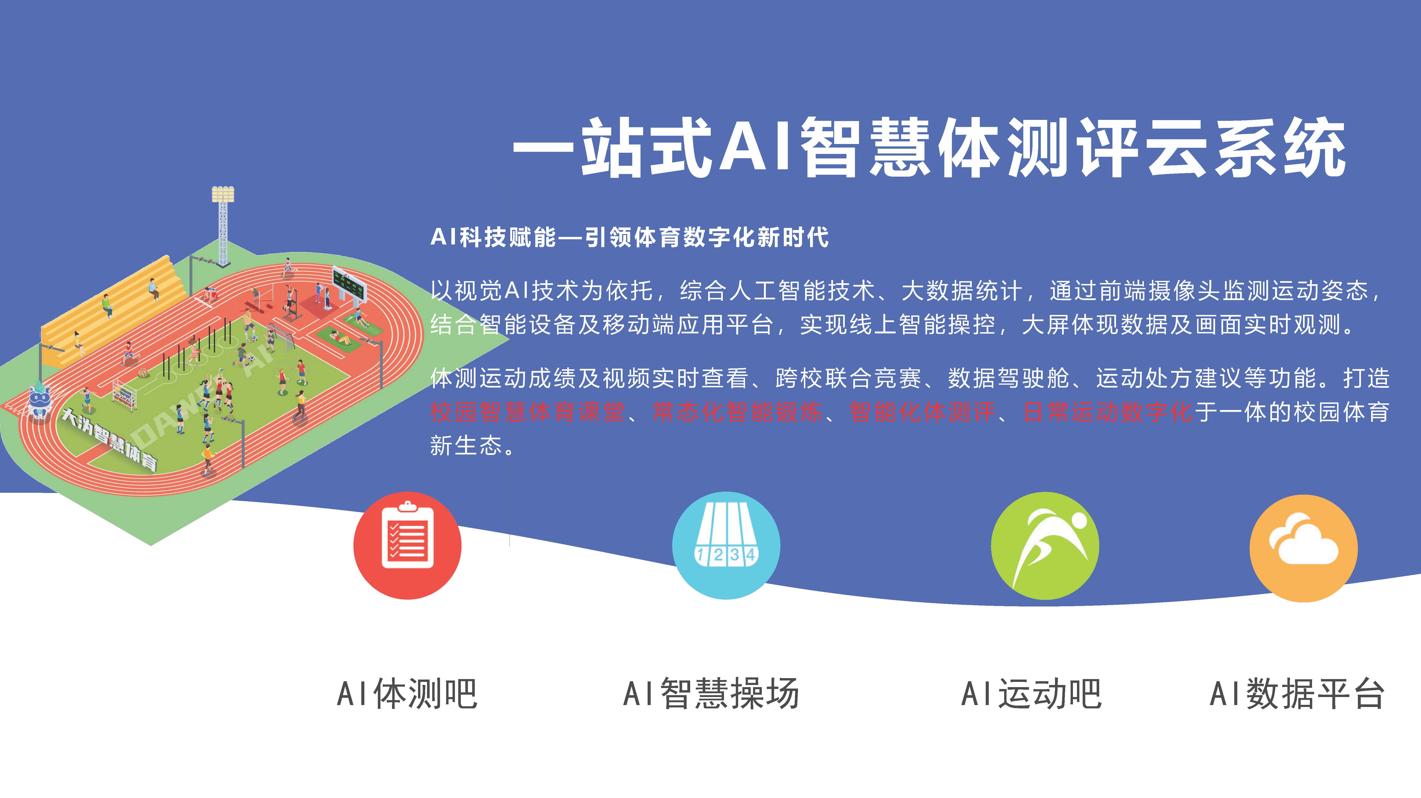 AI科技赋能一引领体育数字化新时代 以视觉AI技术为依托,综合人工智能技术、大数据统计,通过前端摄像头监测运动姿态,结合智能设备及移动端应用平台,实现线上智能操控,大屏体现数据及画面实时观测。 体测运动成绩及视频实时查看、跨校联合竞赛、数据驾驶舱、运动处方建议等功能。打造校园智慧体育课堂、常态化智能锻炼、智能化体测评、日常运动数字化于一体的校园体育新生态。
