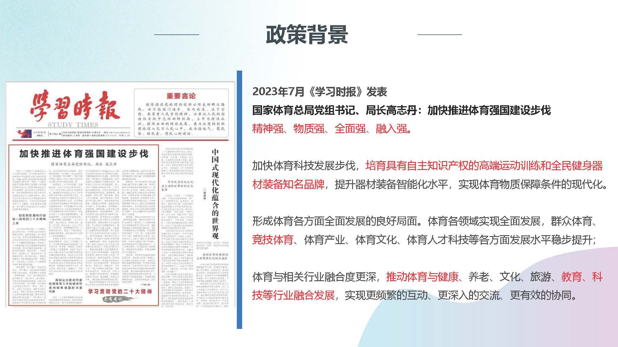 国家体育总局党组书记、局长高志丹:加快推进体育强国建设步伐精神强、物质强、全面强、融入强。