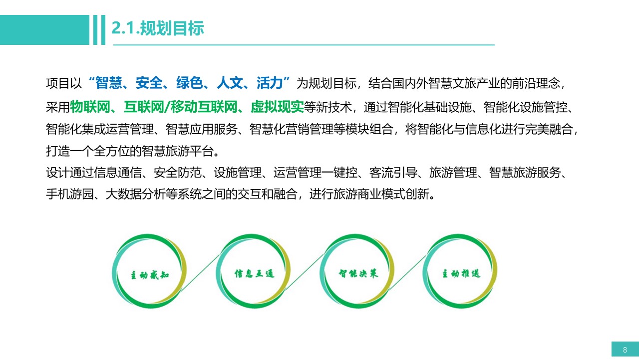 项目以“智慧、安全、绿色、人文、活力”为规划目标,结合国内外智慧文旅产业的前沿理念,采用物联网、互联网/移动互联网、虚拟现实等新技术,通过智能化基础设施、智能化设施管控、智能化集成运营管理、智慧应用服务、智慧化营销管理等模块组合,将智能化与信息化进行完美融合,打造一个全方位的智慧旅游平台。