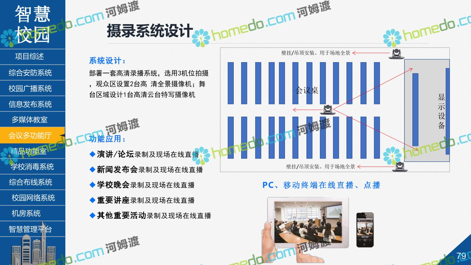 方案简介 采用生动逼真的画面及动画展示,全面介绍现代智慧学校,从基础的系统搭建,终端的系统集成,全方位的介绍智慧学校。特比适合给领导汇报展示。