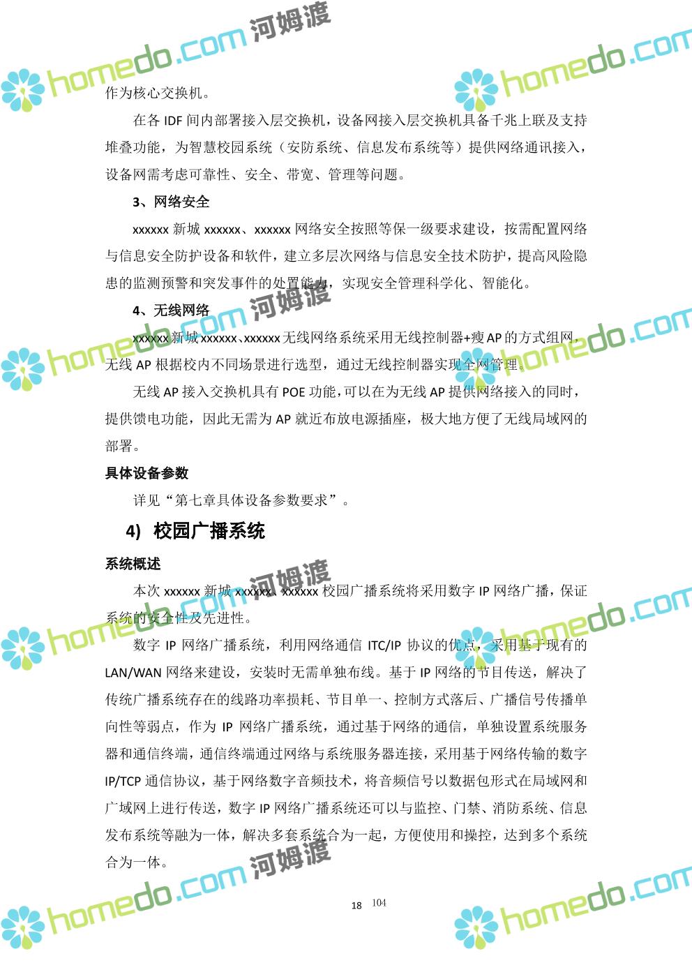 方案简介 本次建设的范围有: 1、基础环境建设:综合布线系统、综合管路系统、计算机网络系统(含无线覆盖)、综合安防系统、校园广播系统/机房工程 2、智慧教学应用建设:多媒体教学、教学录播系统、计算机教室、智慧课堂、功能教室 3、智慧管理建设:智慧校园平台、智慧图书管理系统 4、智慧生活建设:一卡通系统、心理咨询室 5、智慧文化建设:多媒体会议系统、信息发布系统、电子班牌、校园电视台