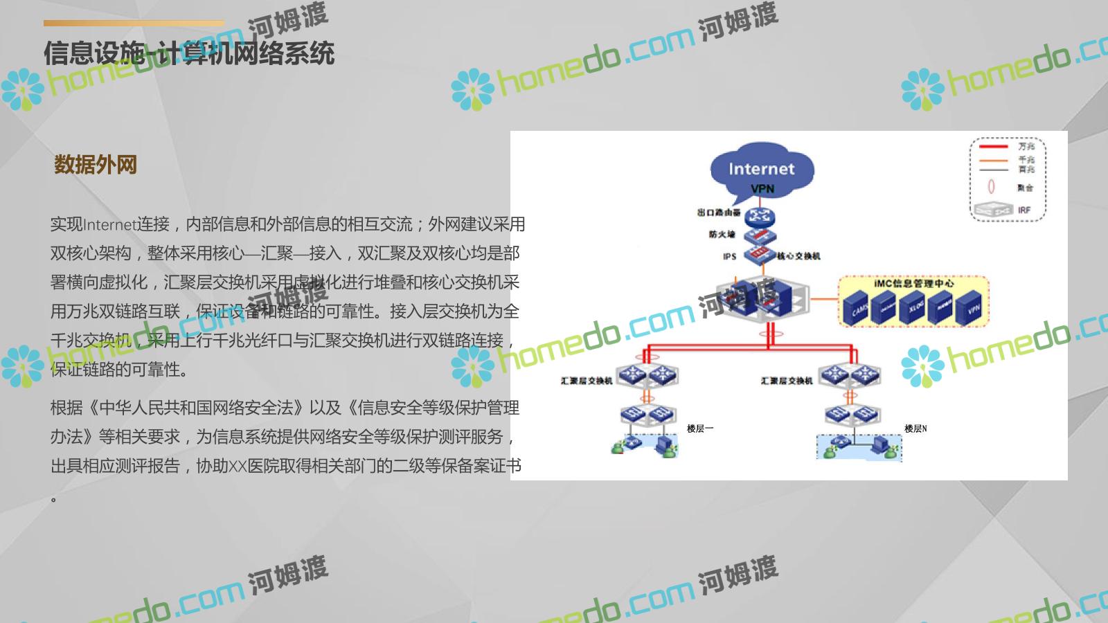 方案简介 本方案致力于以医院综合运维平台为基础核心,以建筑智能化系统为重点,建立一套可持续服务于医院综合运维管理的统一信息平台。 从基础的机房、综合布线、网络、电话,到智能化实现,再到医疗信息化应用。 不仅包含基本的综合布线、安防、电视、多媒体、信息发布等智能化系统,还包含医疗信息化应用,如排队叫号、医护呼叫、重症监护、婴儿防盗、RFID、无线临床、手术示教等。