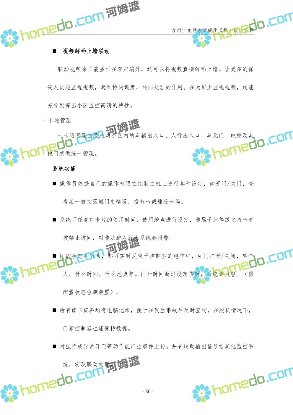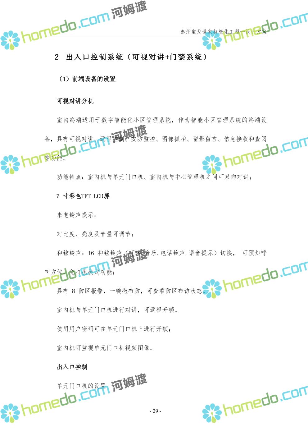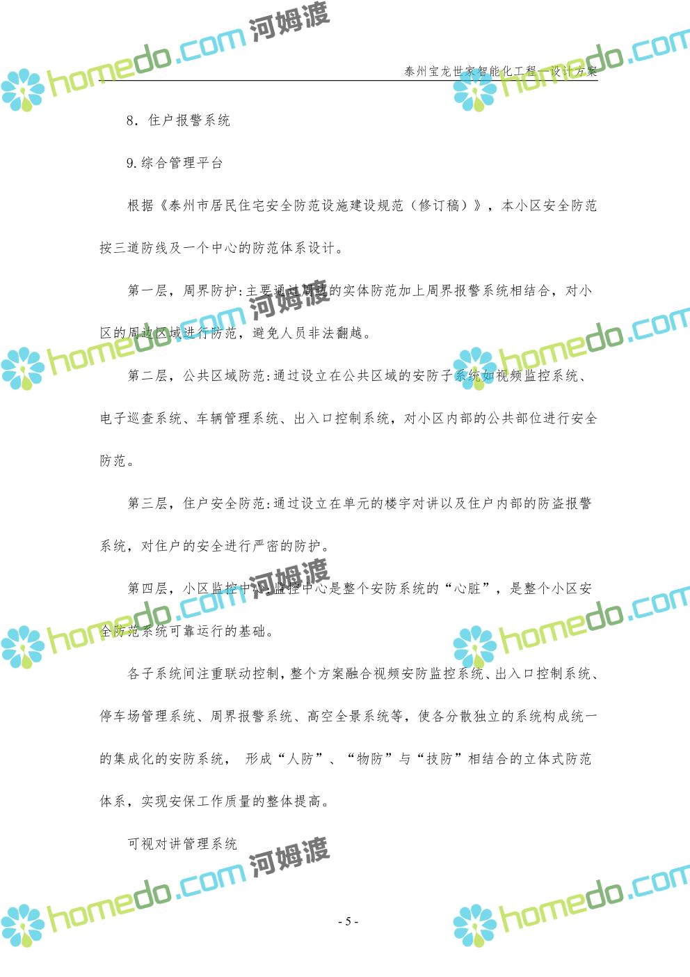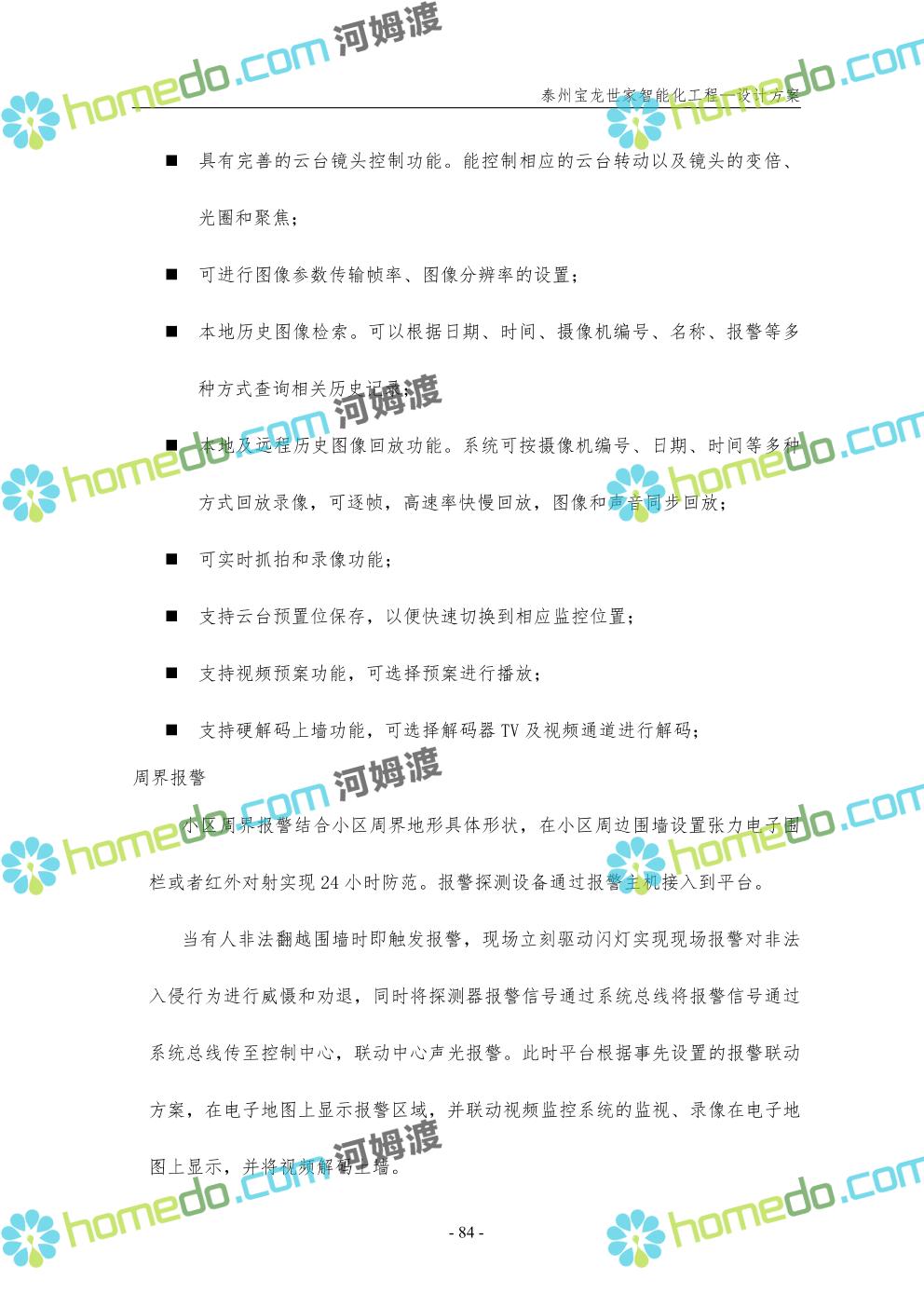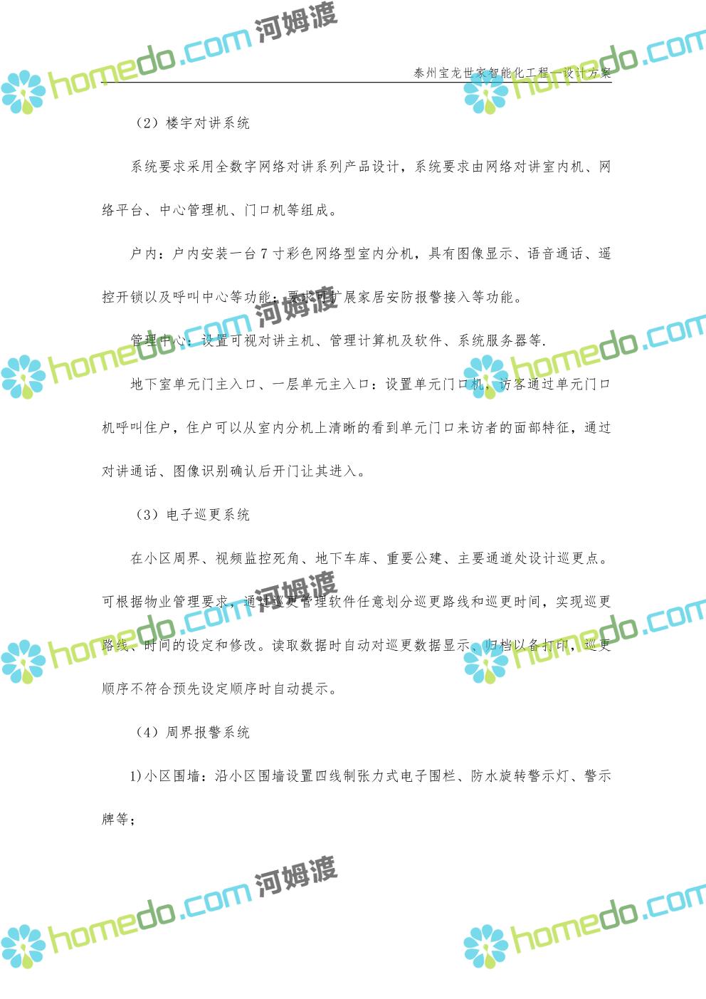 方案简介 针对宝龙世家住宅项目的智能化工程做出视频监控系统、出入口控制系统、停车场管理系统、周界报警系统等系统方案说明