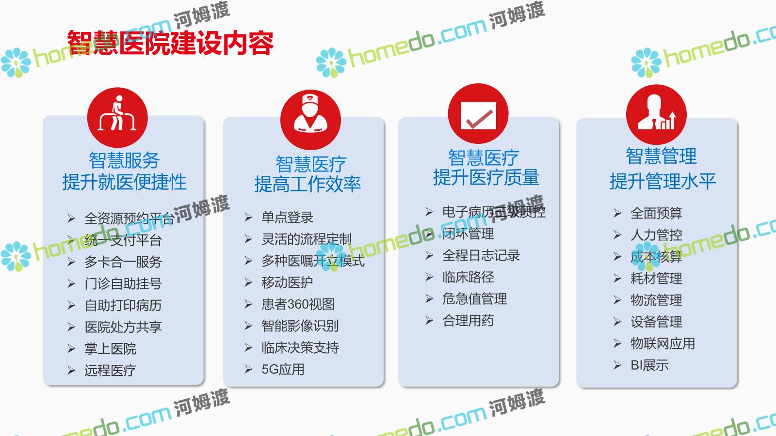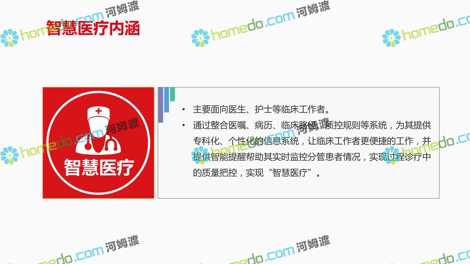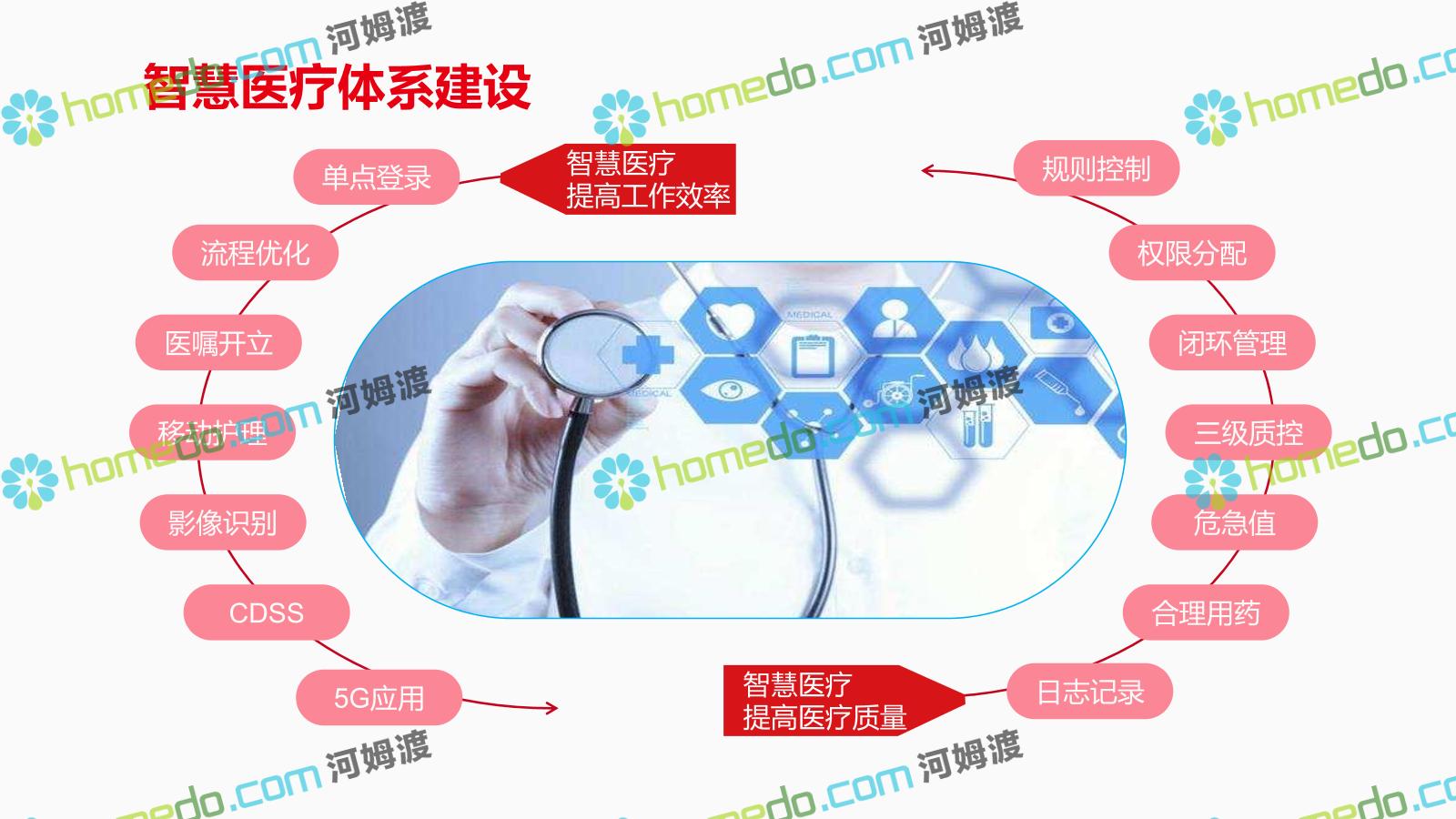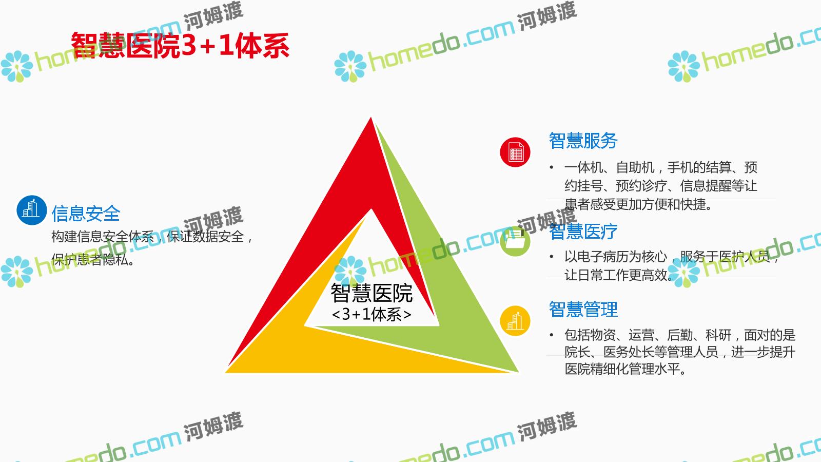 方案简介 信息安全 构建信息安全体系,保证数据安全,保护患者隐私。 智慧服务 一体机、自助机,手机的结算、预约挂号、预约诊疗、信息提醒等让患者感受更加方便和快捷 智慧医疗 以电子病历为核心,服务于医护人员,让日常工作更高效。 智慧管理 包括物资、运营、后勤、科研,面对的是院长、医务处长等管理人员,进一步提升医院精细化管理水平。