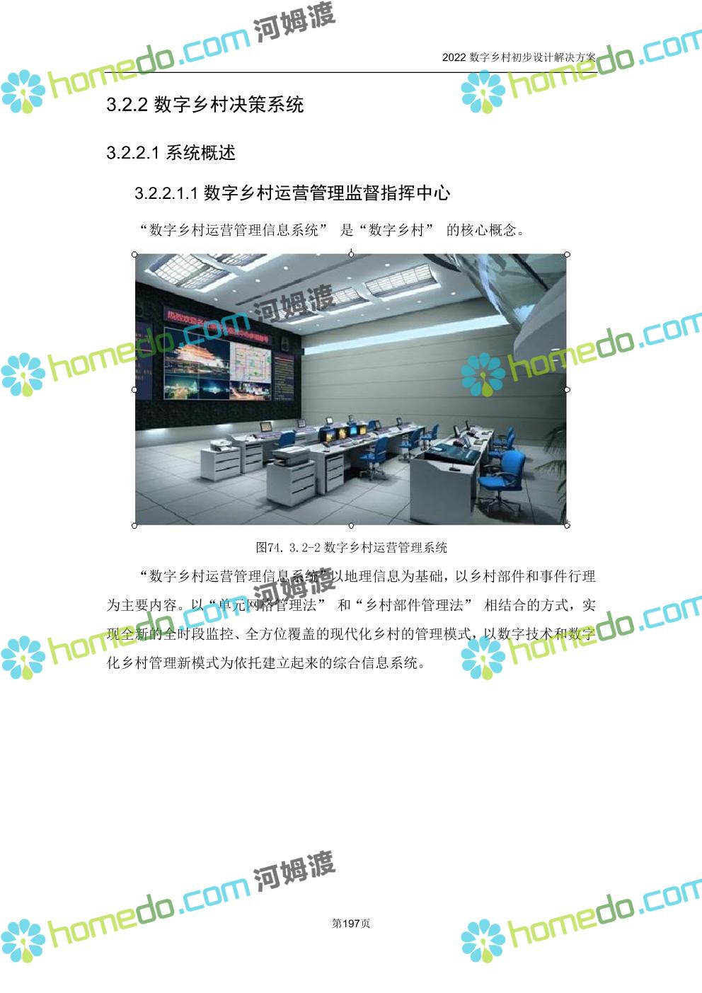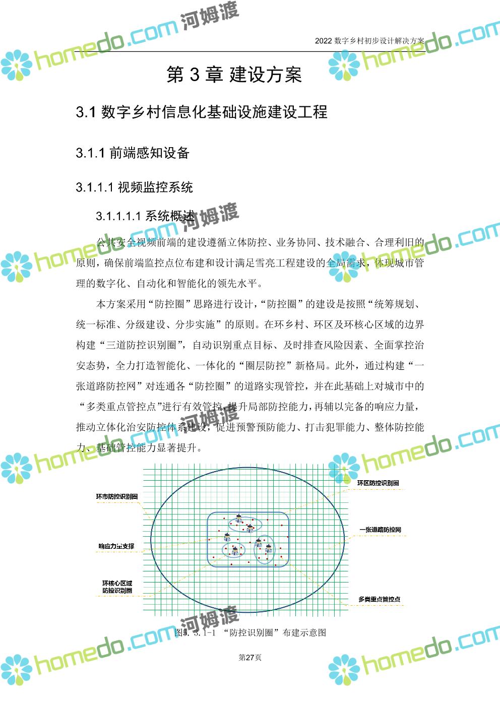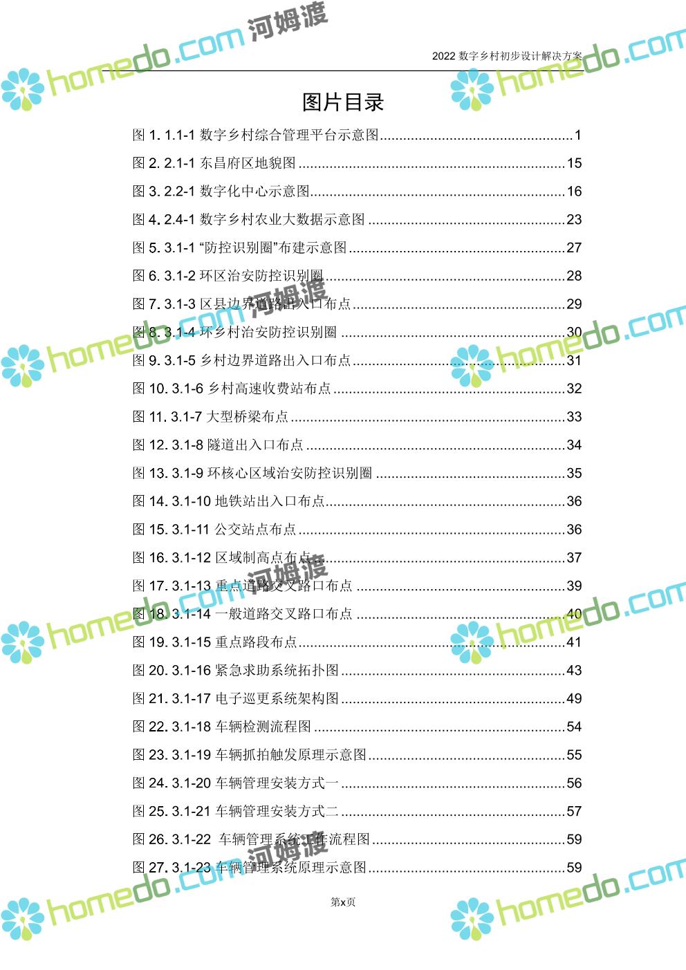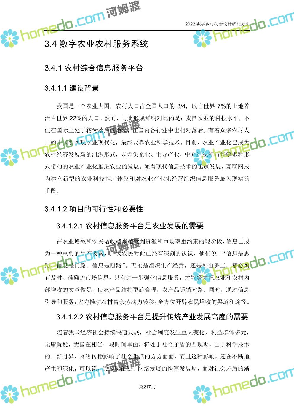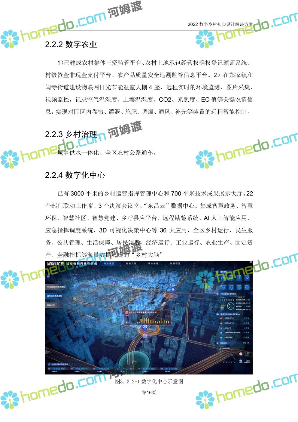 方案简介 依托全市农业农村大数据中心建设为中心,建设农业农村管理决策系统:建 设农产品全产业链监测预警系统:建设数字农业农村服务系统:建设农村人居环 境智能监测系统;建设乡村数字治理系统。 完成数字乡村信息化基础设施建设,包括前端感知设备、网络传输构建、机 房构建、数字乡村云搭建、数字乡村运营指挥中心建设。完成数字乡村管理者驾 驶舱建设,包括农业农村管理决策系统、数字乡村运营系统。完成数字乡村会客 厅建设。完成数字农业农村系统建设,完成数字农业农村服务系统建设。完成农 村人居环境智能监测系统建设。完成基础数据资源建设,完成数字乡村四大体系 建设。