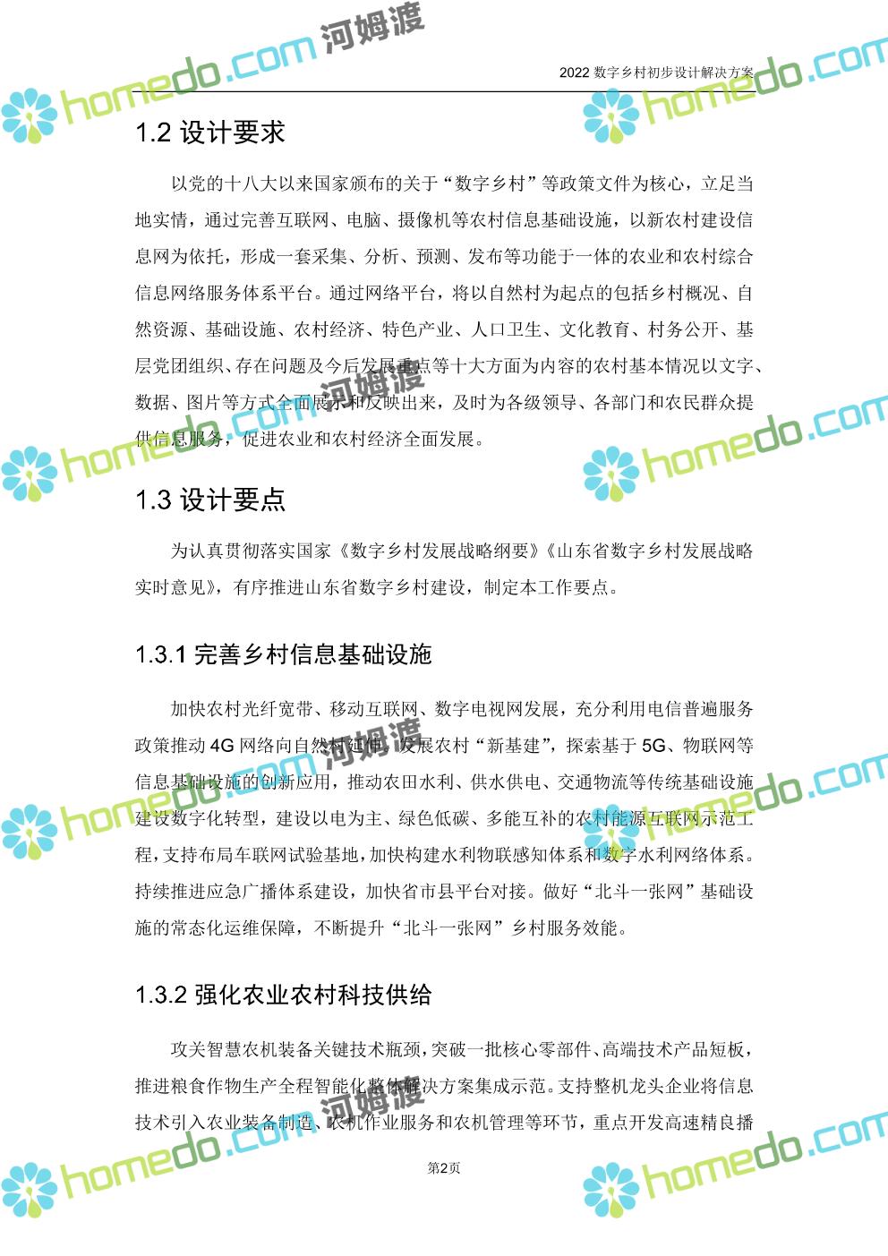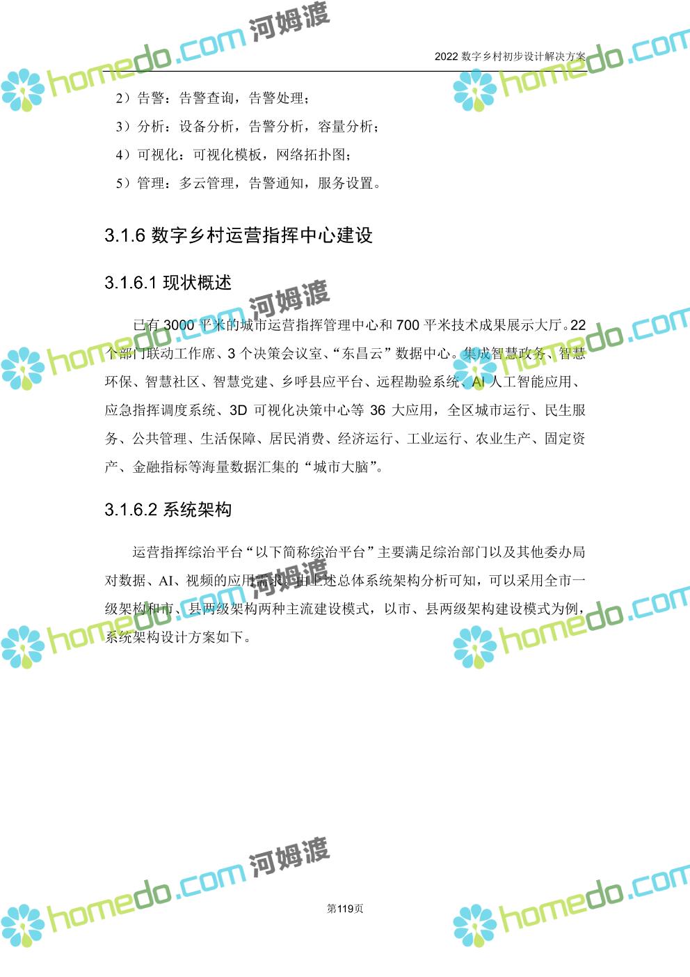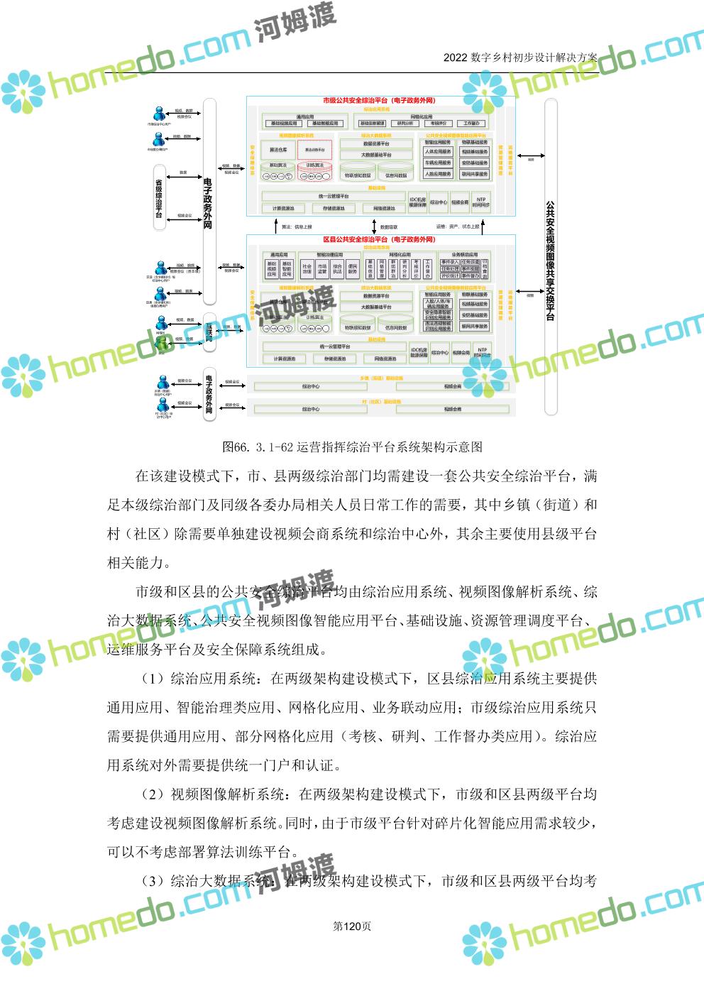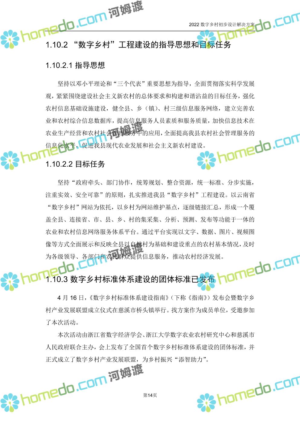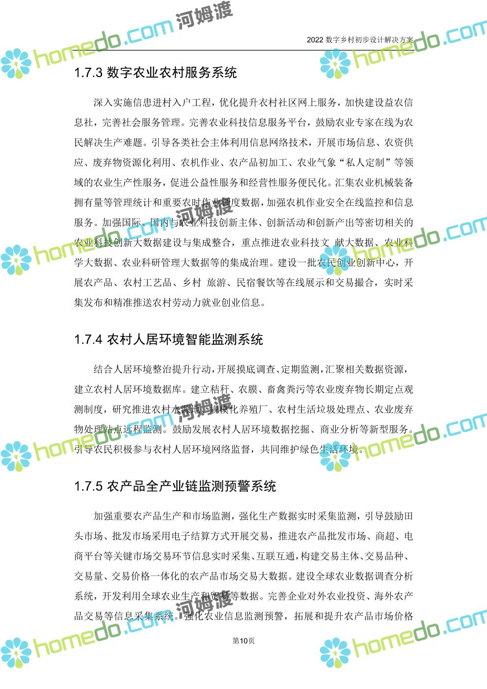 方案简介 依托全市农业农村大数据中心建设为中心,建设农业农村管理决策系统:建 设农产品全产业链监测预警系统:建设数字农业农村服务系统:建设农村人居环 境智能监测系统;建设乡村数字治理系统。 完成数字乡村信息化基础设施建设,包括前端感知设备、网络传输构建、机 房构建、数字乡村云搭建、数字乡村运营指挥中心建设。完成数字乡村管理者驾 驶舱建设,包括农业农村管理决策系统、数字乡村运营系统。完成数字乡村会客 厅建设。完成数字农业农村系统建设,完成数字农业农村服务系统建设。完成农 村人居环境智能监测系统建设。完成基础数据资源建设,完成数字乡村四大体系 建设。