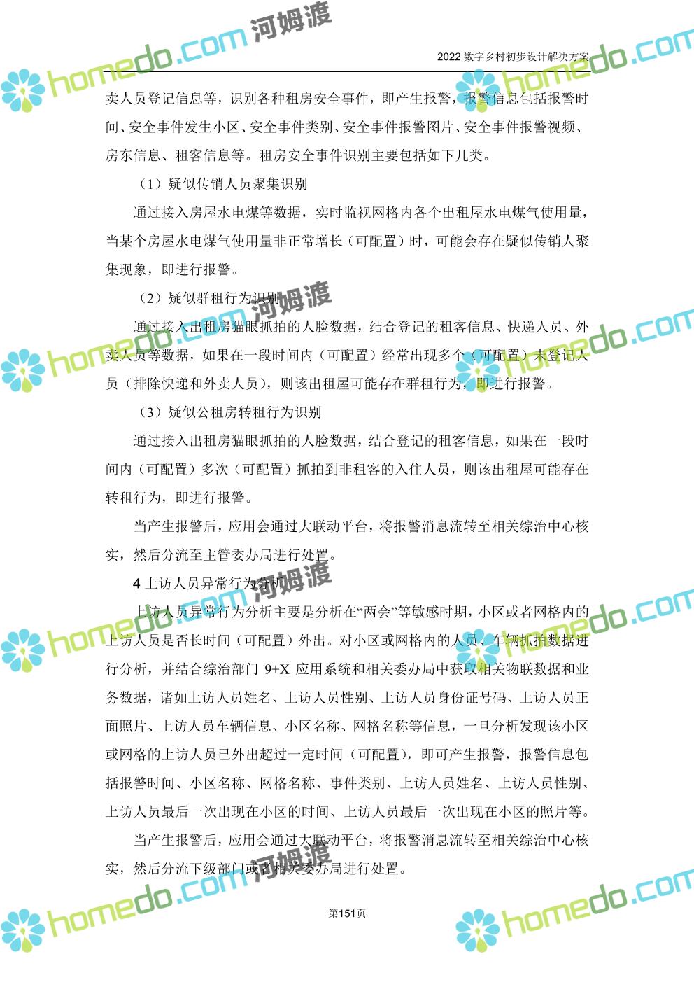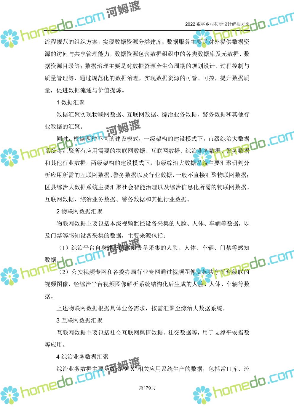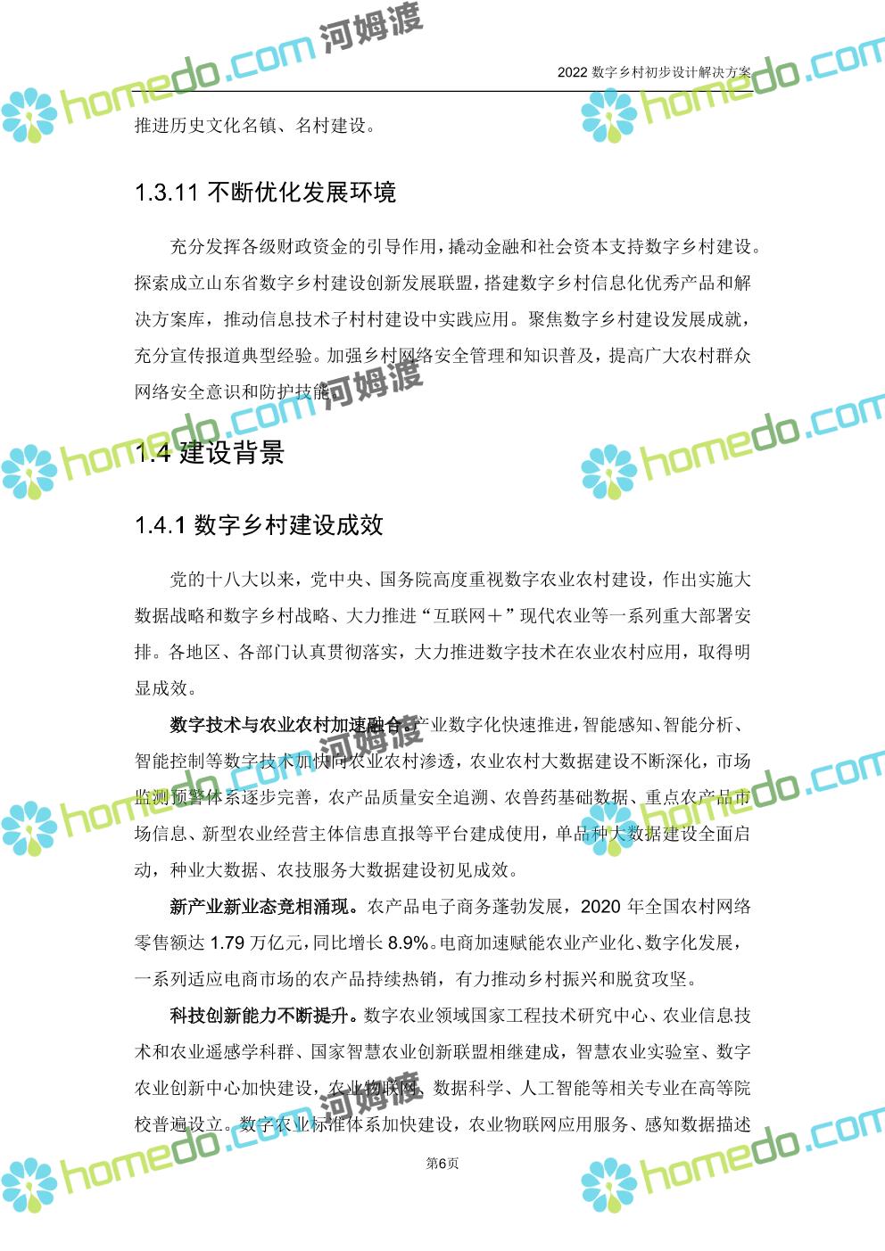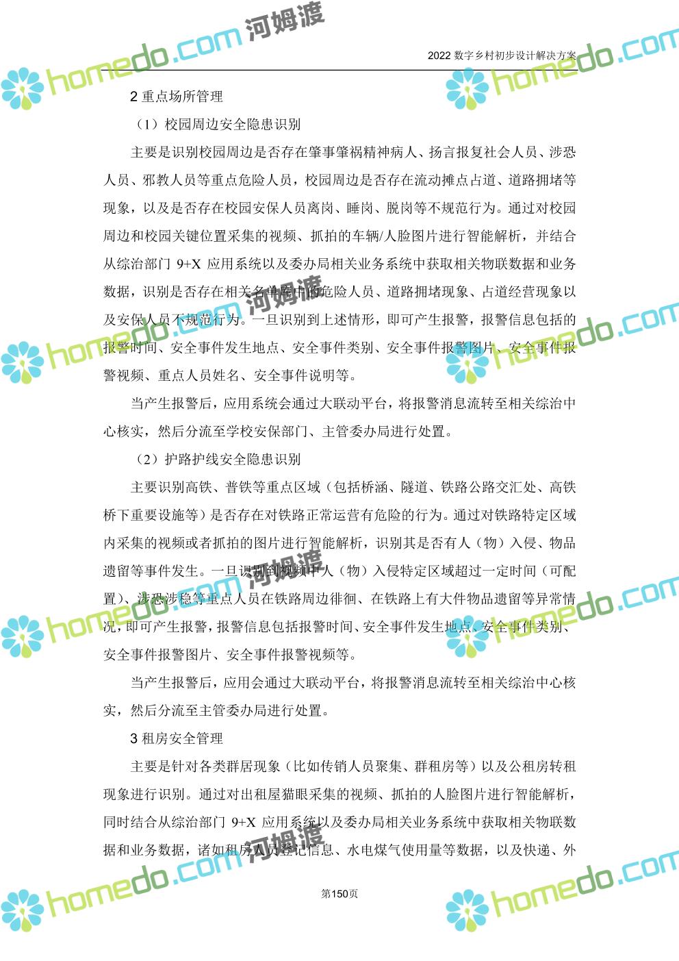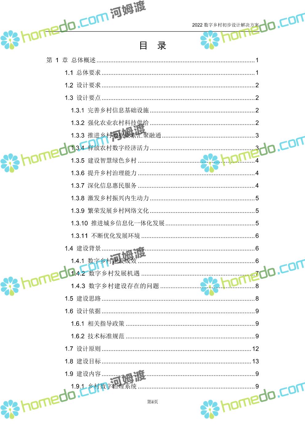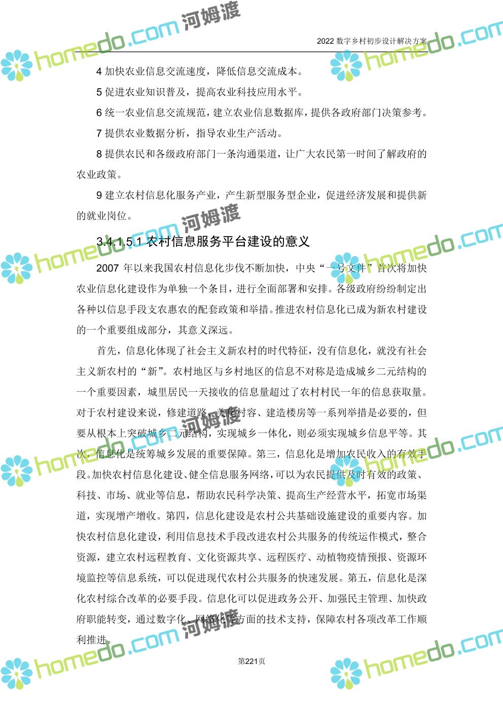 方案简介 依托全市农业农村大数据中心建设为中心,建设农业农村管理决策系统:建 设农产品全产业链监测预警系统:建设数字农业农村服务系统:建设农村人居环 境智能监测系统;建设乡村数字治理系统。 完成数字乡村信息化基础设施建设,包括前端感知设备、网络传输构建、机 房构建、数字乡村云搭建、数字乡村运营指挥中心建设。完成数字乡村管理者驾 驶舱建设,包括农业农村管理决策系统、数字乡村运营系统。完成数字乡村会客 厅建设。完成数字农业农村系统建设,完成数字农业农村服务系统建设。完成农 村人居环境智能监测系统建设。完成基础数据资源建设,完成数字乡村四大体系 建设。