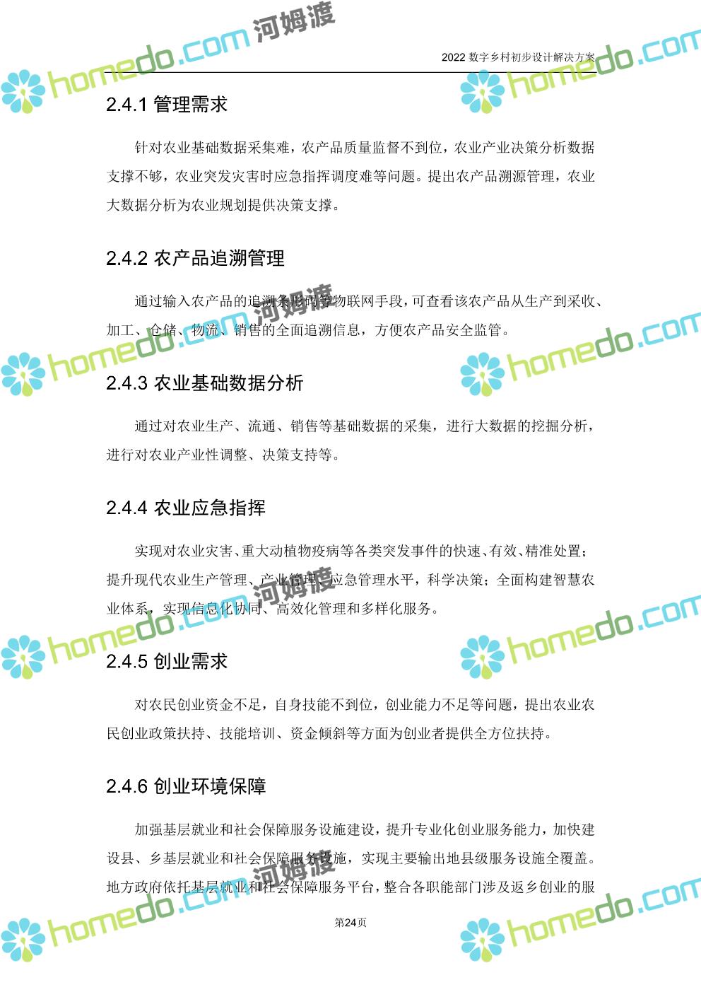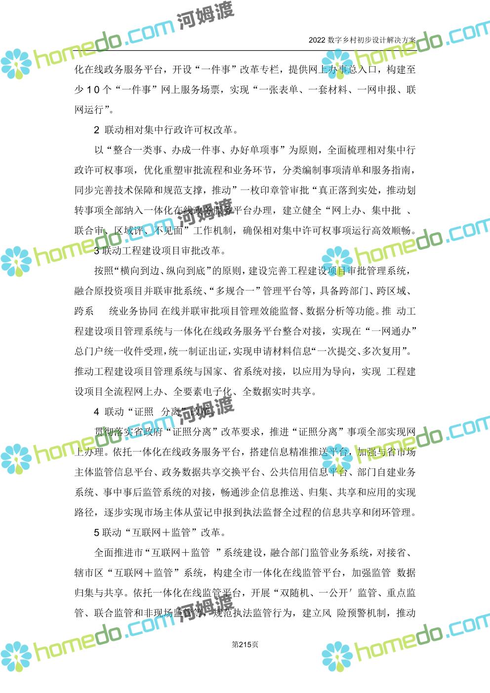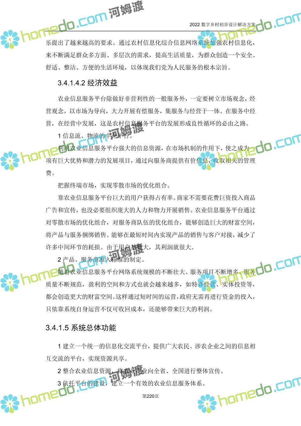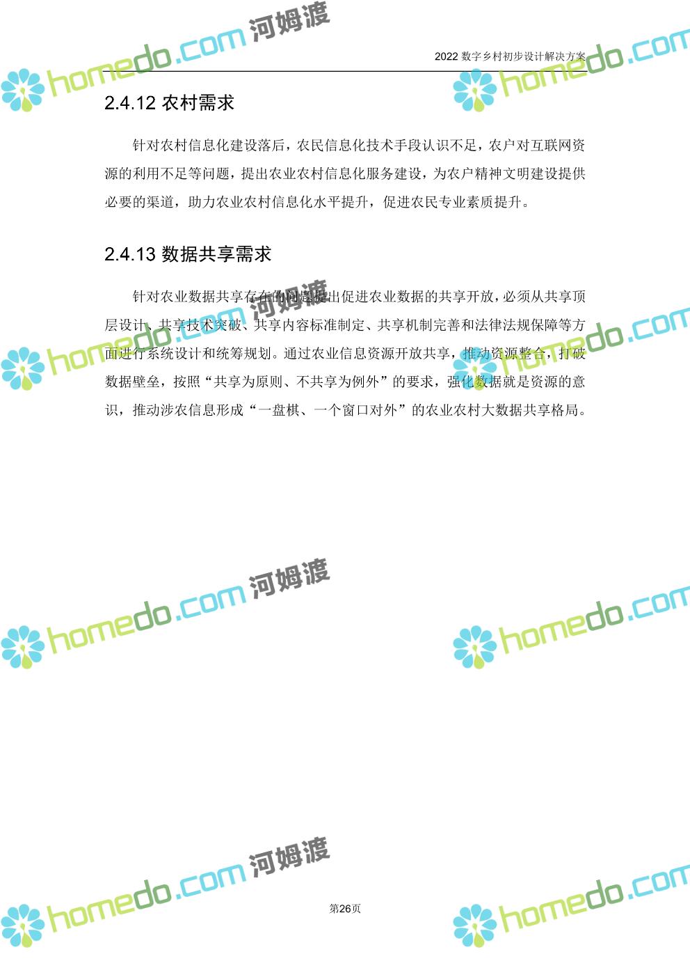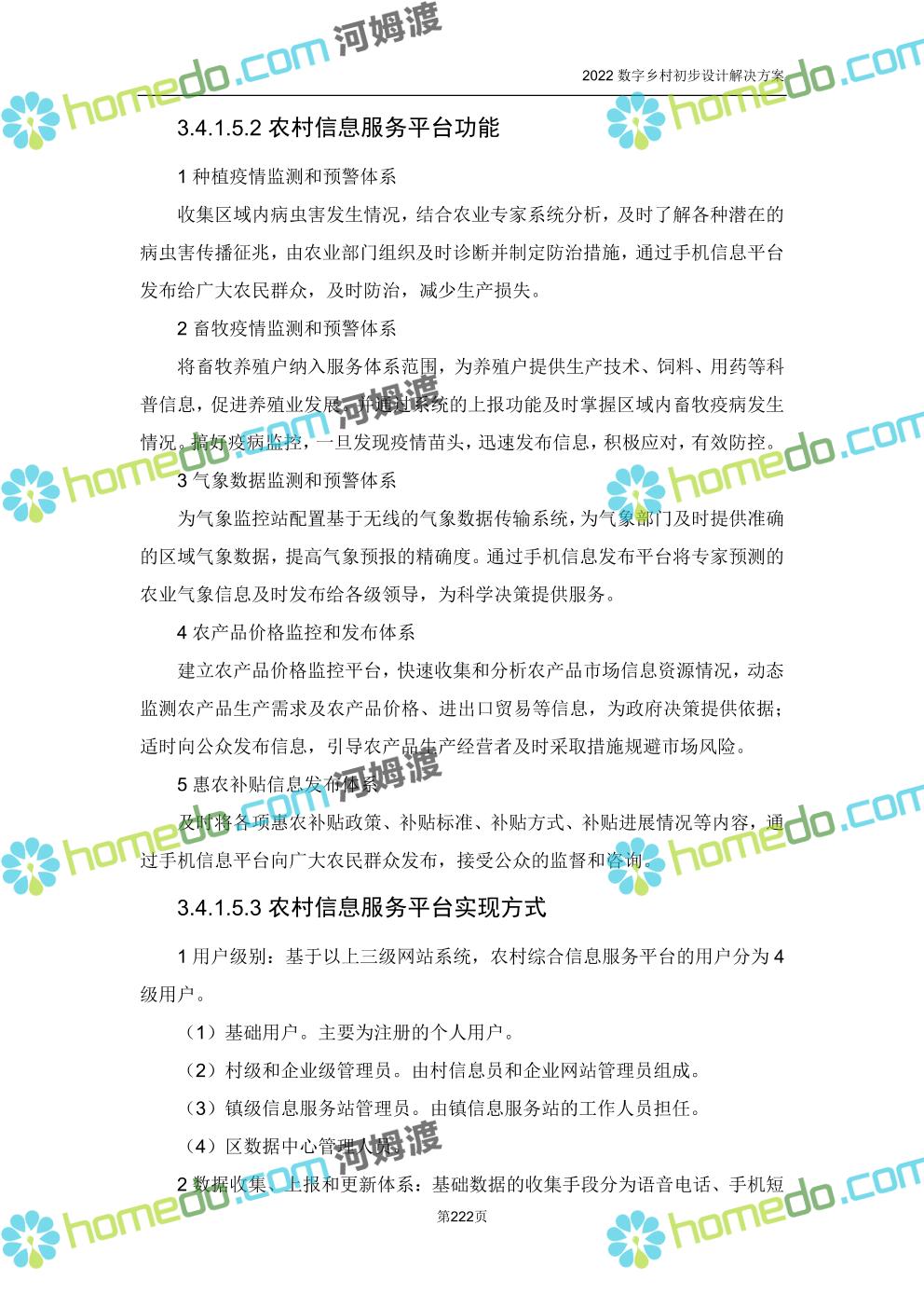 方案简介 依托全市农业农村大数据中心建设为中心,建设农业农村管理决策系统:建 设农产品全产业链监测预警系统:建设数字农业农村服务系统:建设农村人居环 境智能监测系统;建设乡村数字治理系统。 完成数字乡村信息化基础设施建设,包括前端感知设备、网络传输构建、机 房构建、数字乡村云搭建、数字乡村运营指挥中心建设。完成数字乡村管理者驾 驶舱建设,包括农业农村管理决策系统、数字乡村运营系统。完成数字乡村会客 厅建设。完成数字农业农村系统建设,完成数字农业农村服务系统建设。完成农 村人居环境智能监测系统建设。完成基础数据资源建设,完成数字乡村四大体系 建设。