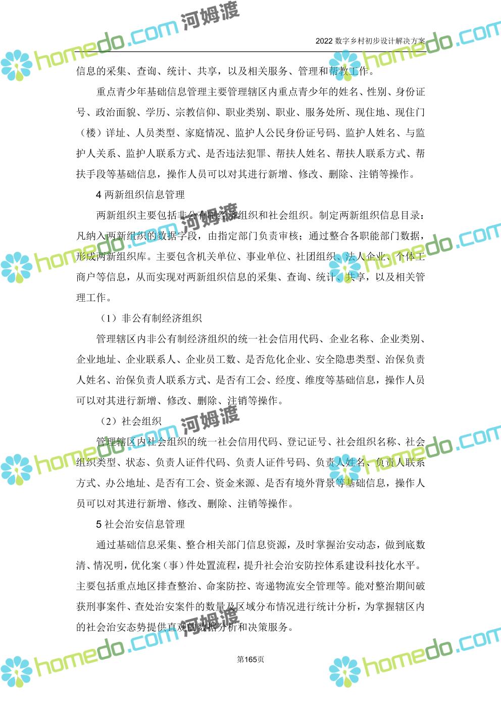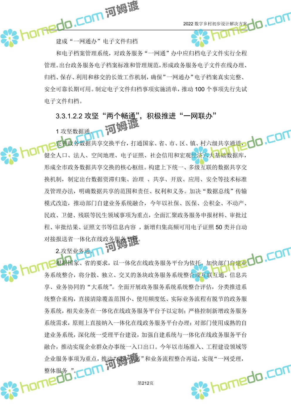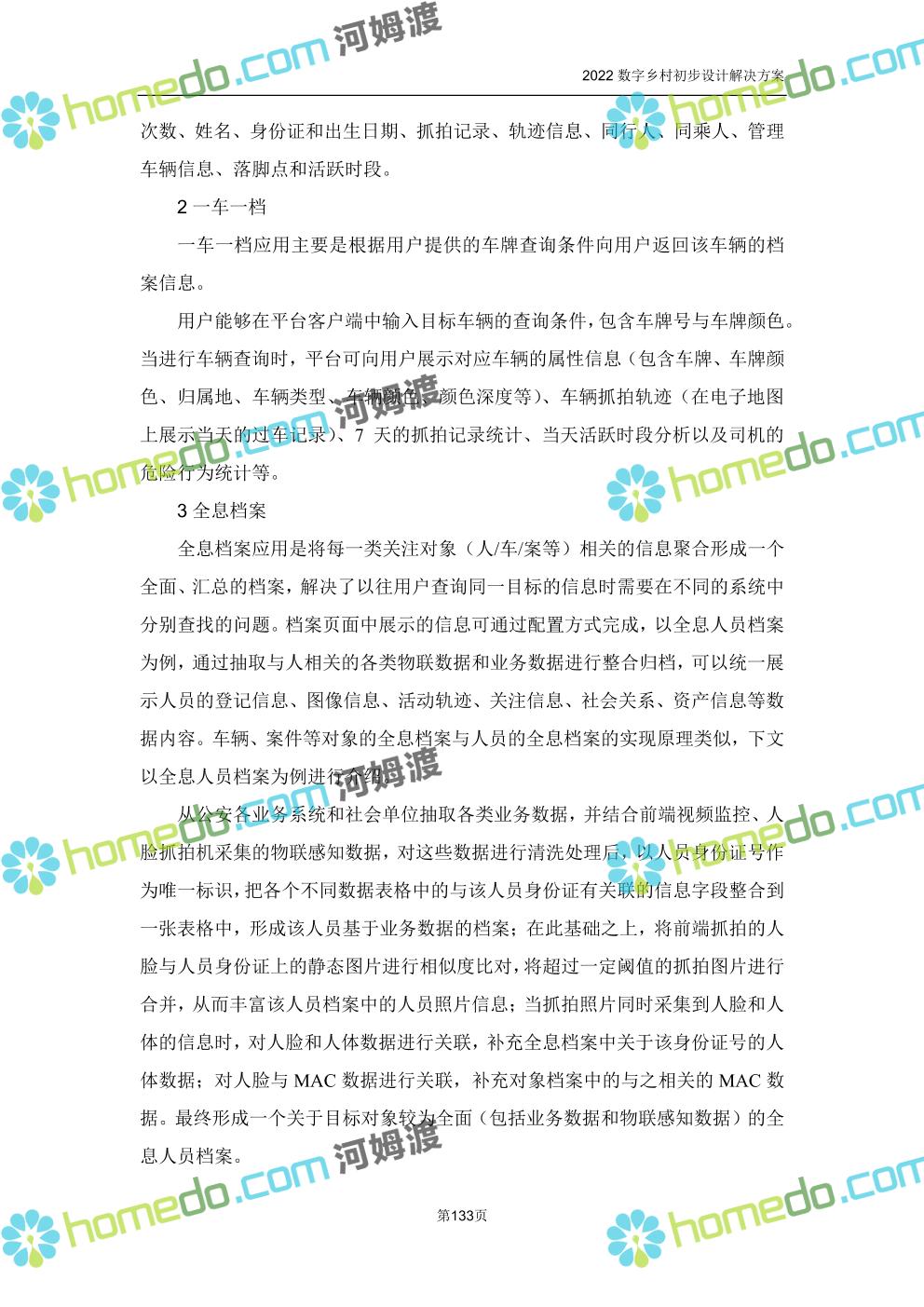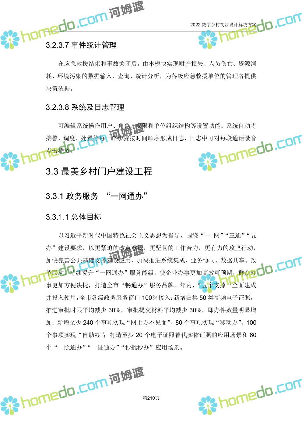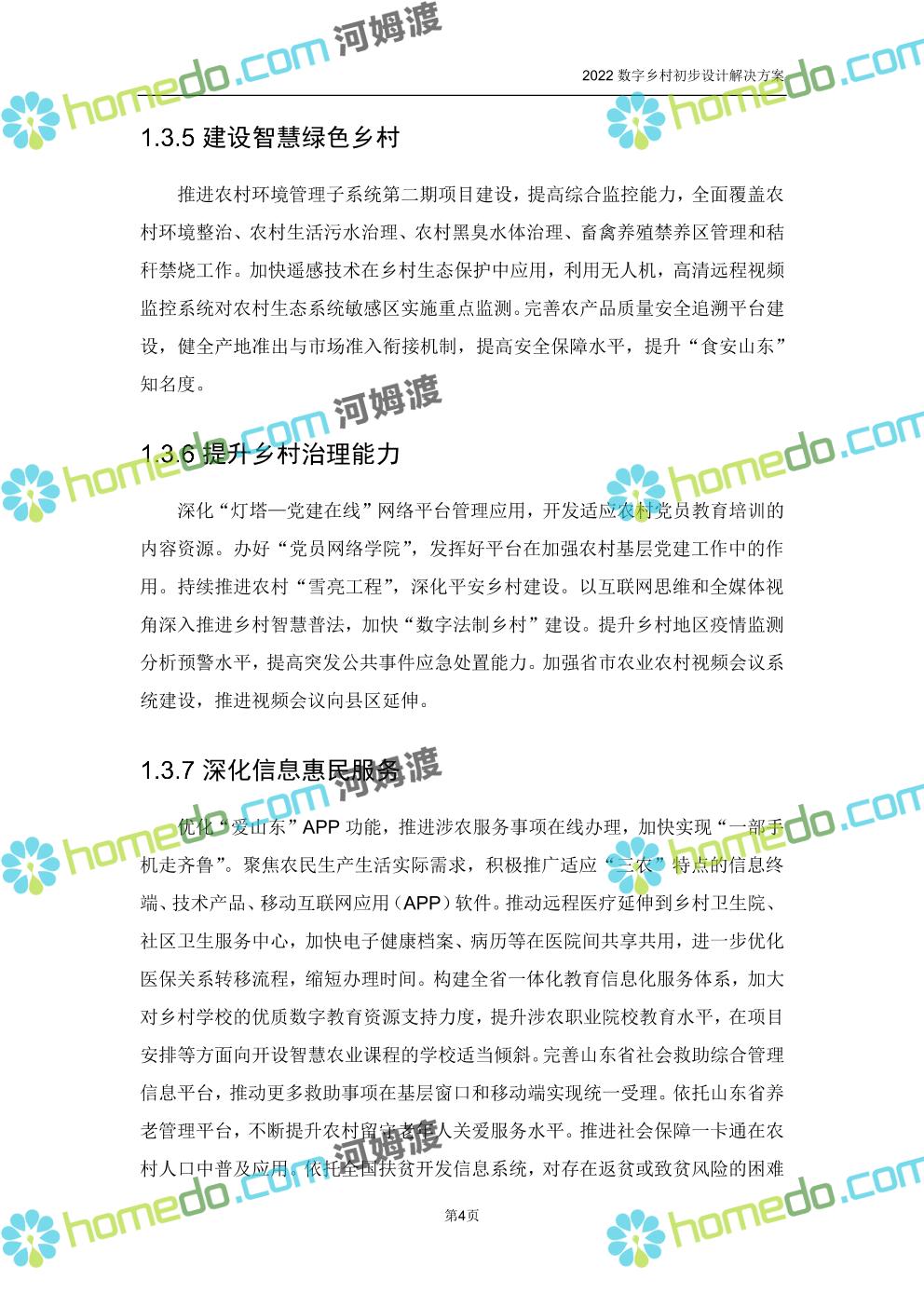 方案简介 依托全市农业农村大数据中心建设为中心,建设农业农村管理决策系统:建 设农产品全产业链监测预警系统:建设数字农业农村服务系统:建设农村人居环 境智能监测系统;建设乡村数字治理系统。 完成数字乡村信息化基础设施建设,包括前端感知设备、网络传输构建、机 房构建、数字乡村云搭建、数字乡村运营指挥中心建设。完成数字乡村管理者驾 驶舱建设,包括农业农村管理决策系统、数字乡村运营系统。完成数字乡村会客 厅建设。完成数字农业农村系统建设,完成数字农业农村服务系统建设。完成农 村人居环境智能监测系统建设。完成基础数据资源建设,完成数字乡村四大体系 建设。