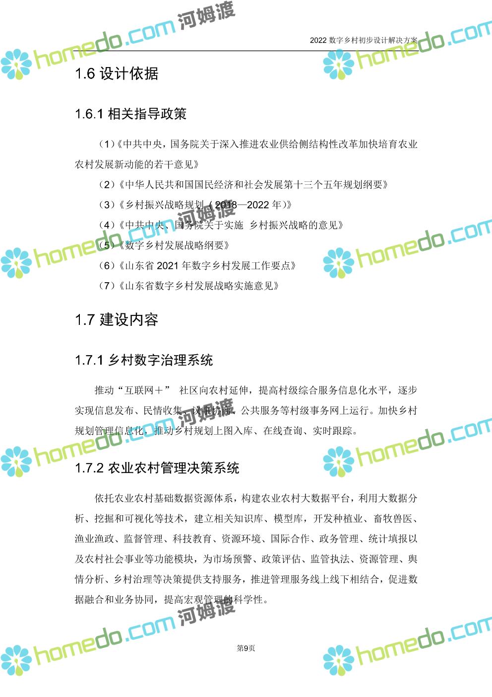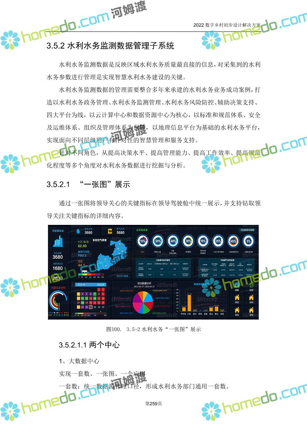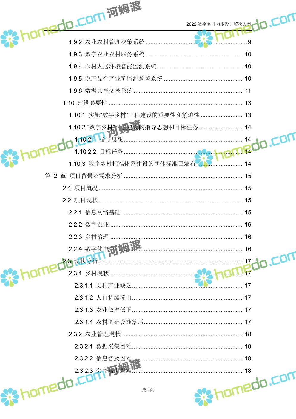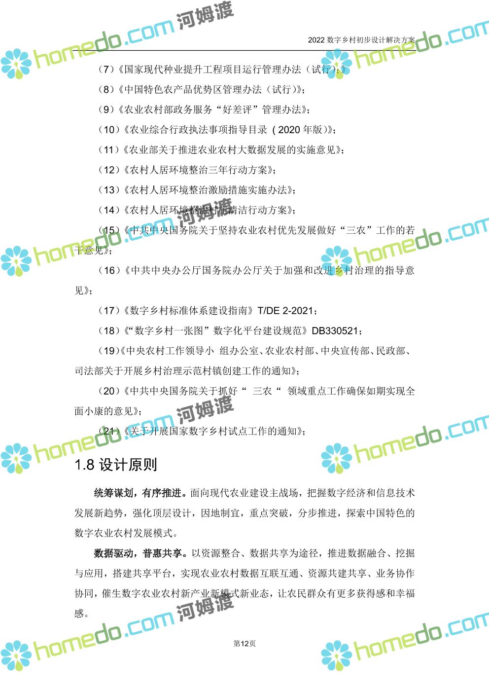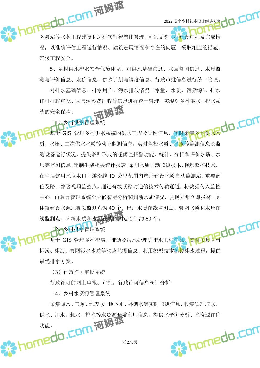 方案简介 依托全市农业农村大数据中心建设为中心,建设农业农村管理决策系统:建 设农产品全产业链监测预警系统:建设数字农业农村服务系统:建设农村人居环 境智能监测系统;建设乡村数字治理系统。 完成数字乡村信息化基础设施建设,包括前端感知设备、网络传输构建、机 房构建、数字乡村云搭建、数字乡村运营指挥中心建设。完成数字乡村管理者驾 驶舱建设,包括农业农村管理决策系统、数字乡村运营系统。完成数字乡村会客 厅建设。完成数字农业农村系统建设,完成数字农业农村服务系统建设。完成农 村人居环境智能监测系统建设。完成基础数据资源建设,完成数字乡村四大体系 建设。