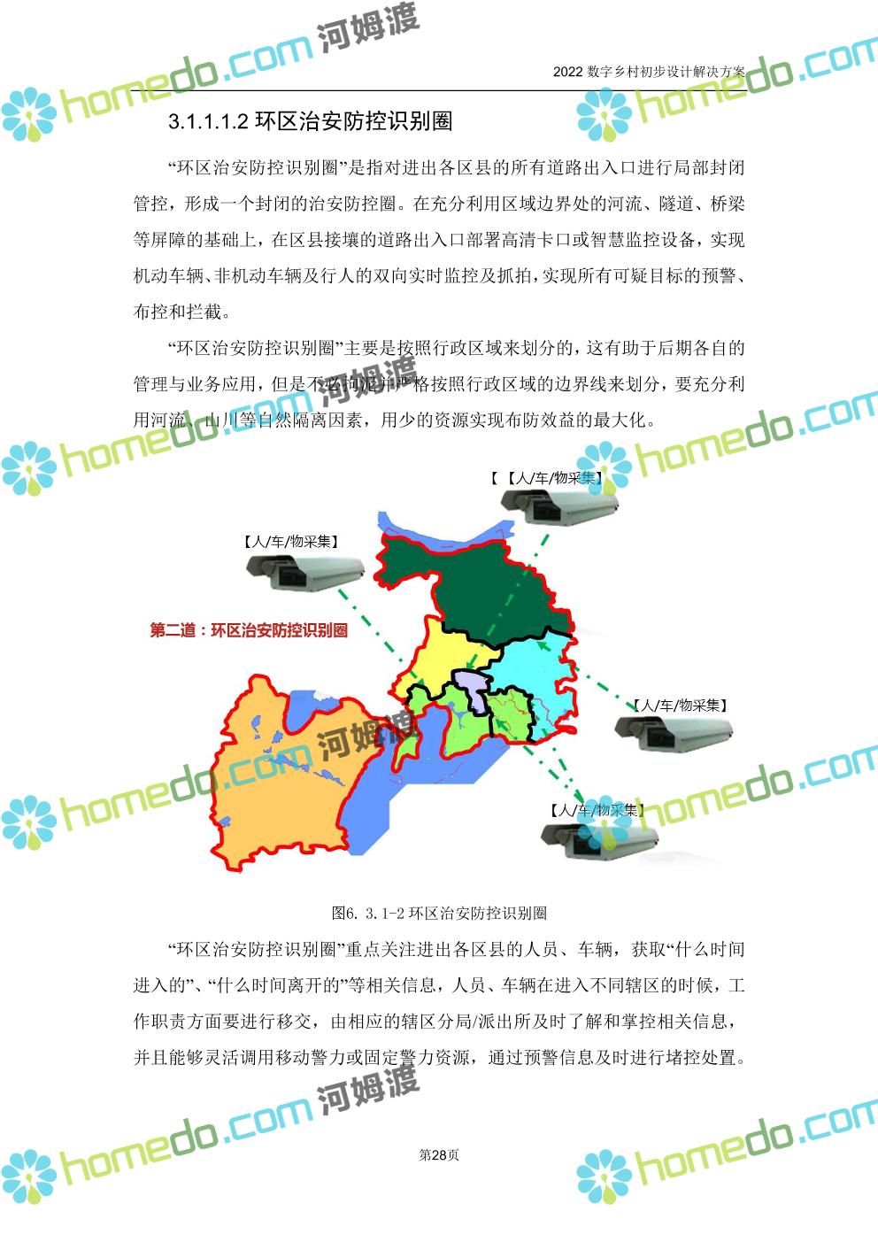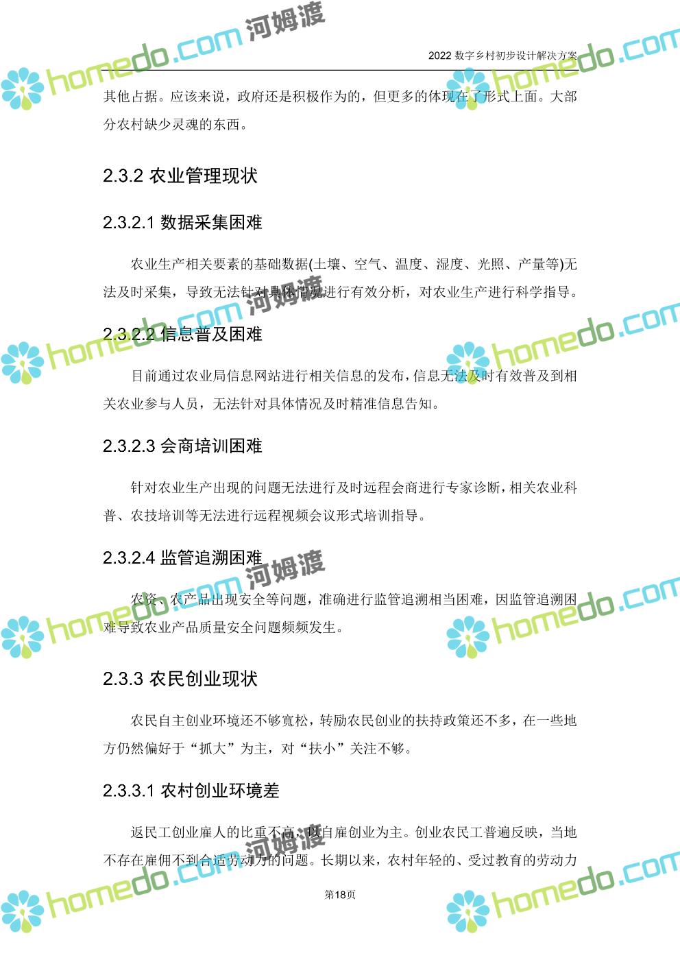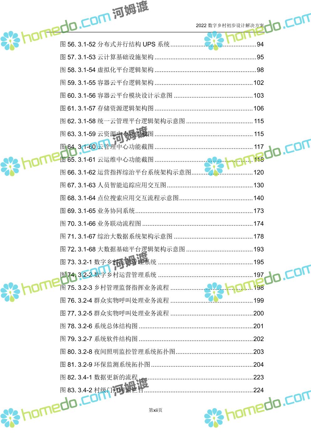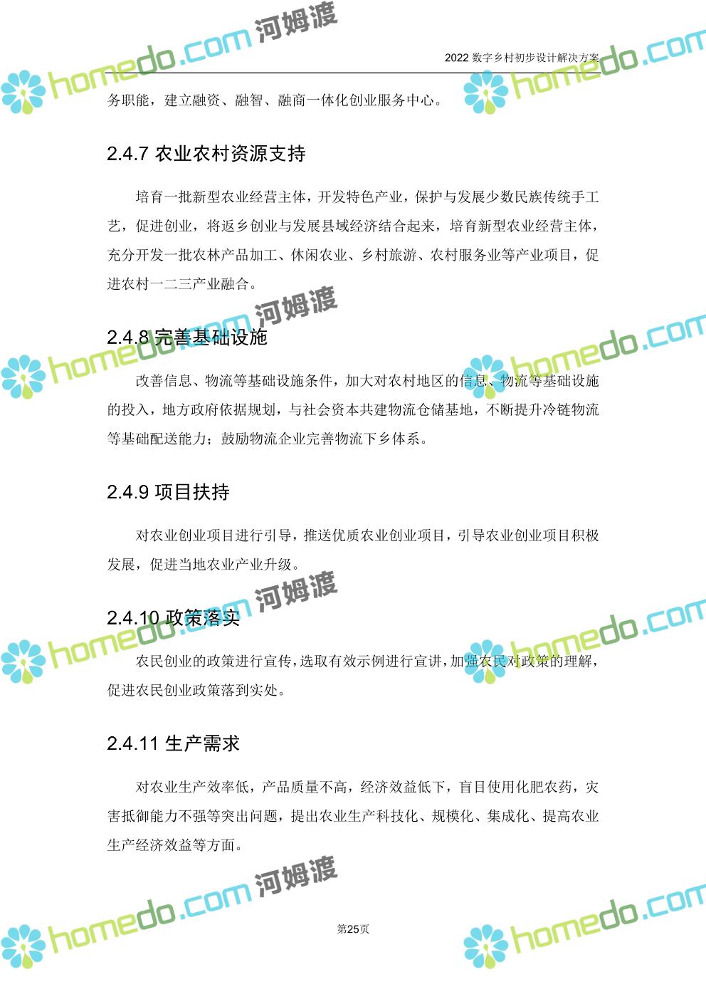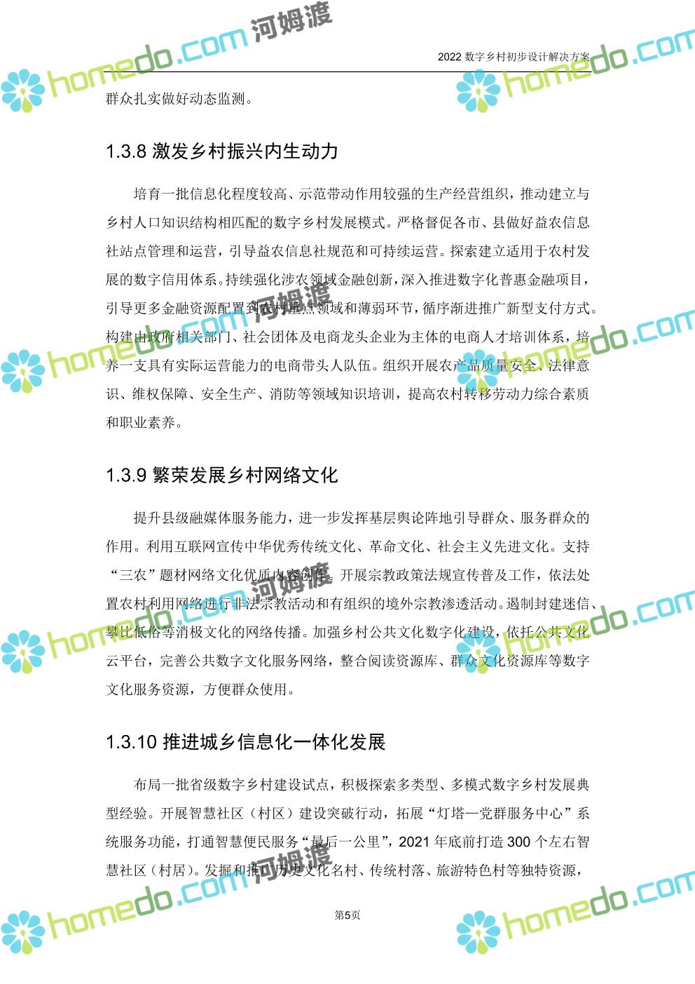 方案简介 依托全市农业农村大数据中心建设为中心,建设农业农村管理决策系统:建 设农产品全产业链监测预警系统:建设数字农业农村服务系统:建设农村人居环 境智能监测系统;建设乡村数字治理系统。 完成数字乡村信息化基础设施建设,包括前端感知设备、网络传输构建、机 房构建、数字乡村云搭建、数字乡村运营指挥中心建设。完成数字乡村管理者驾 驶舱建设,包括农业农村管理决策系统、数字乡村运营系统。完成数字乡村会客 厅建设。完成数字农业农村系统建设,完成数字农业农村服务系统建设。完成农 村人居环境智能监测系统建设。完成基础数据资源建设,完成数字乡村四大体系 建设。