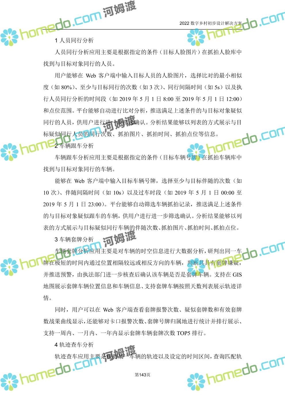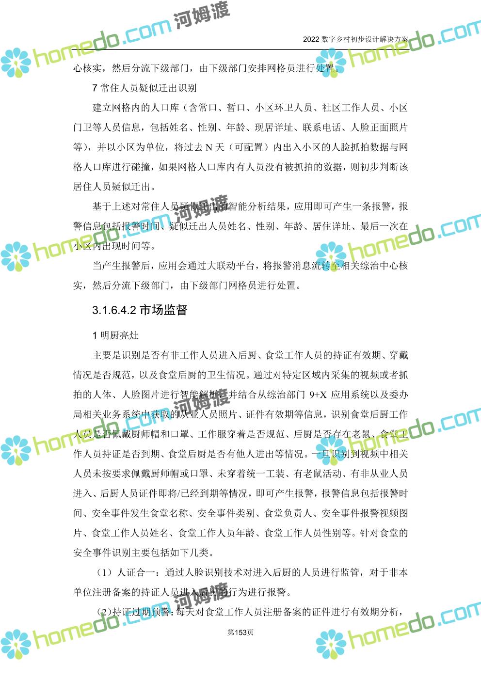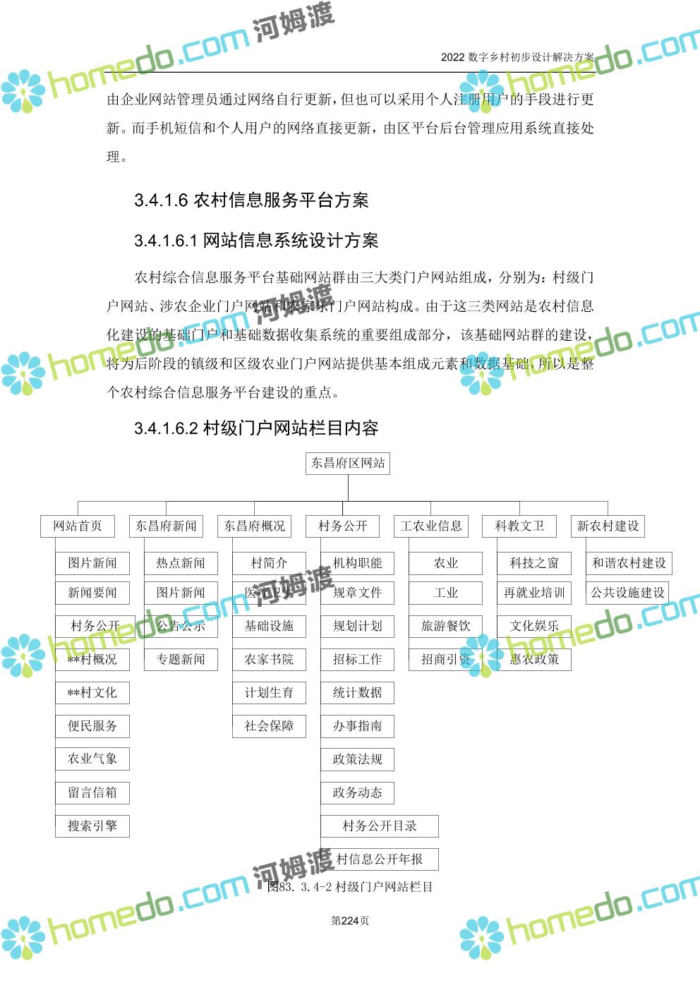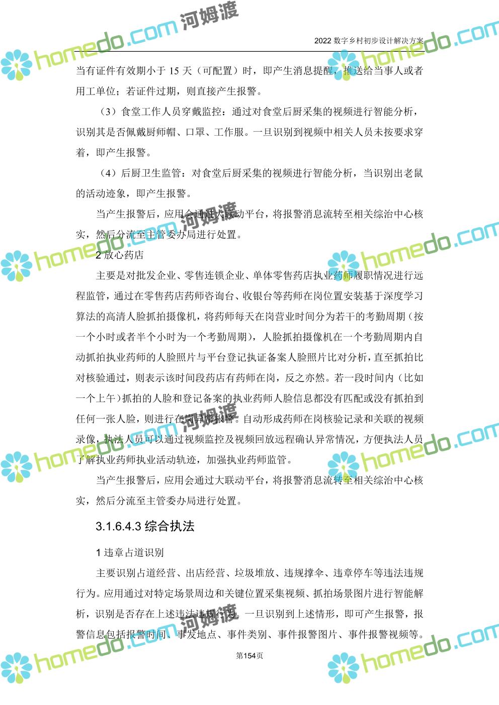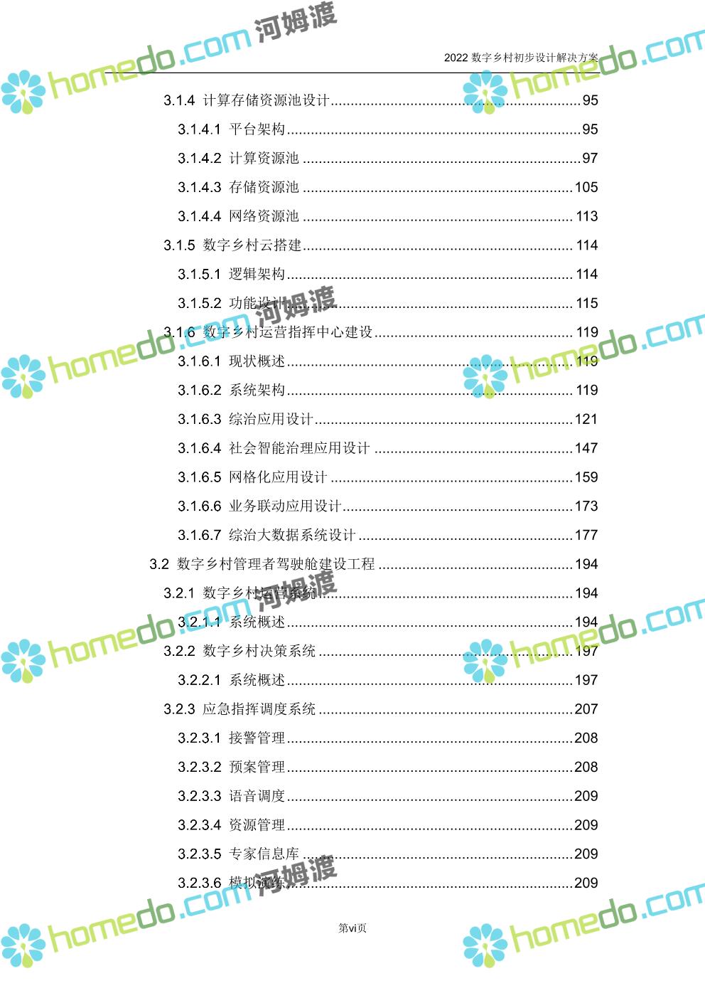 方案简介 依托全市农业农村大数据中心建设为中心,建设农业农村管理决策系统:建 设农产品全产业链监测预警系统:建设数字农业农村服务系统:建设农村人居环 境智能监测系统;建设乡村数字治理系统。 完成数字乡村信息化基础设施建设,包括前端感知设备、网络传输构建、机 房构建、数字乡村云搭建、数字乡村运营指挥中心建设。完成数字乡村管理者驾 驶舱建设,包括农业农村管理决策系统、数字乡村运营系统。完成数字乡村会客 厅建设。完成数字农业农村系统建设,完成数字农业农村服务系统建设。完成农 村人居环境智能监测系统建设。完成基础数据资源建设,完成数字乡村四大体系 建设。