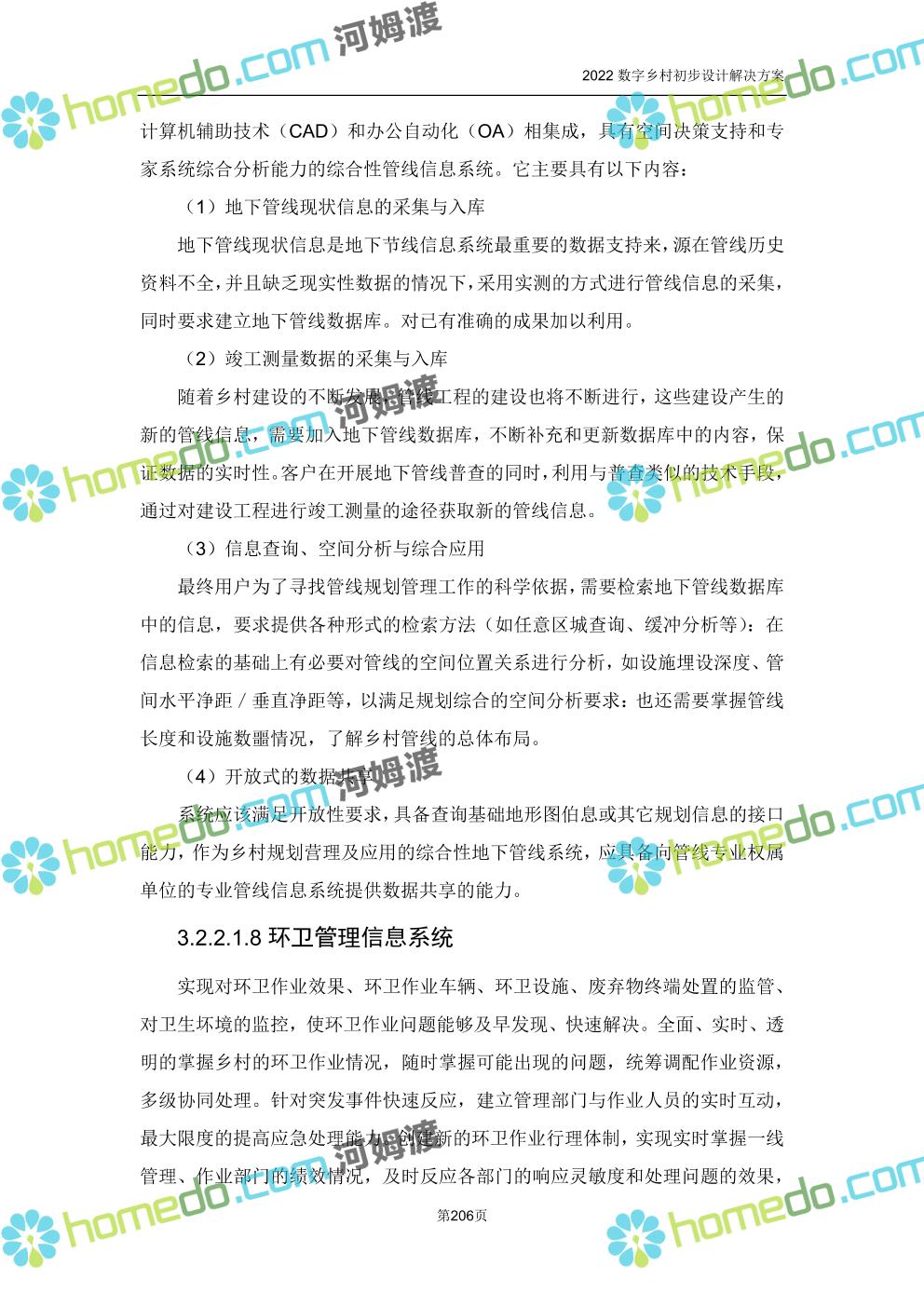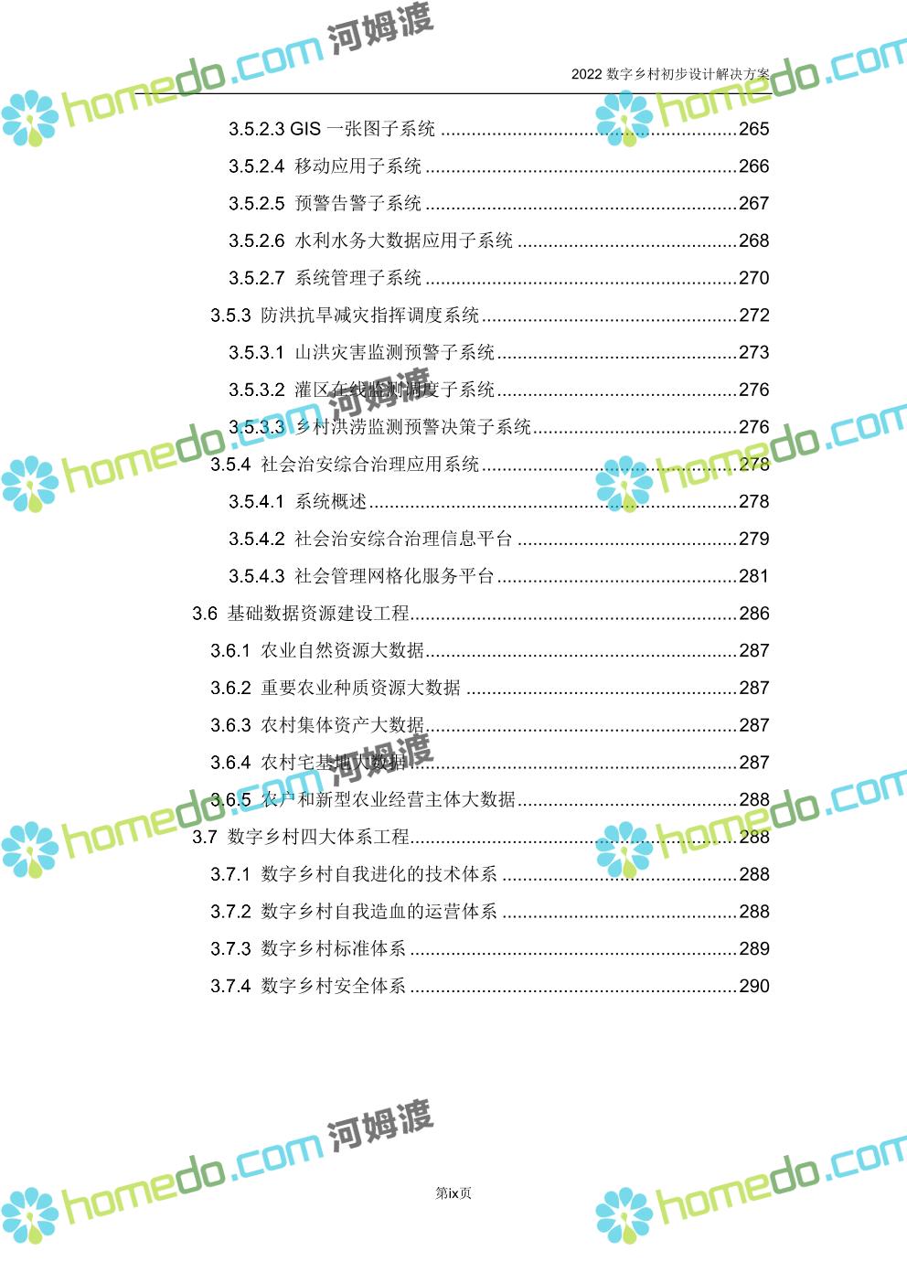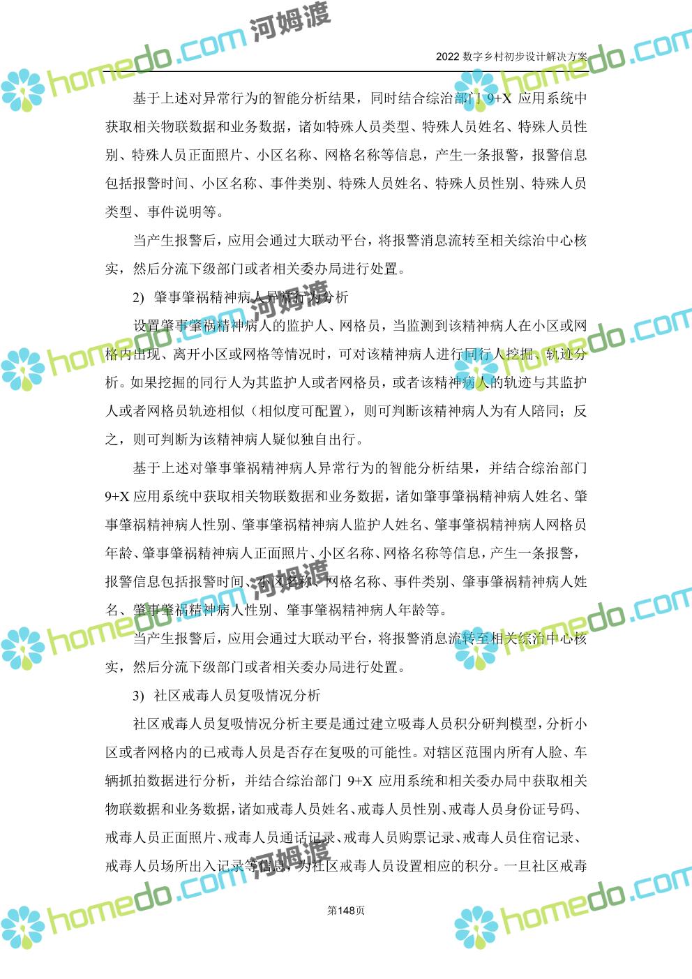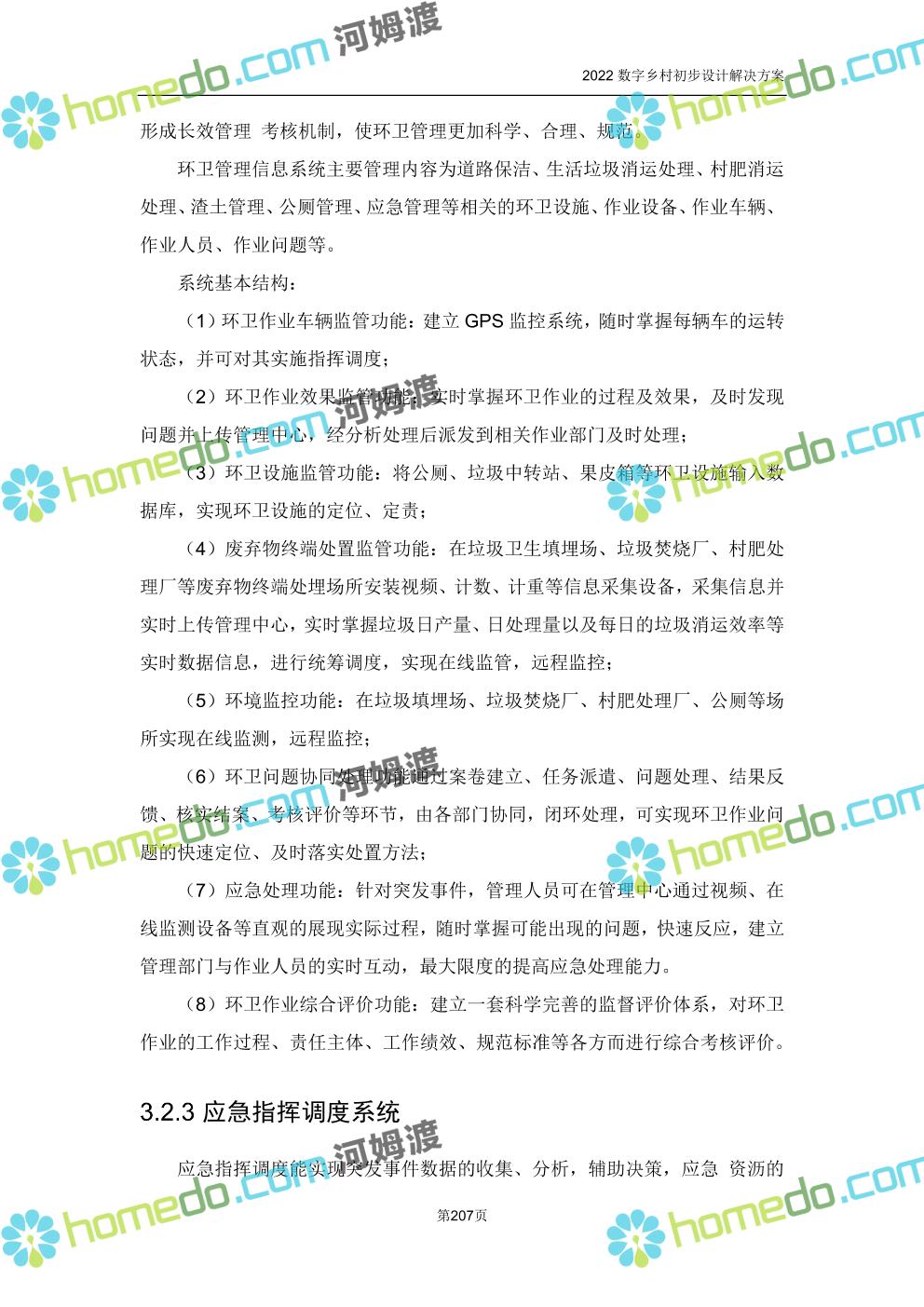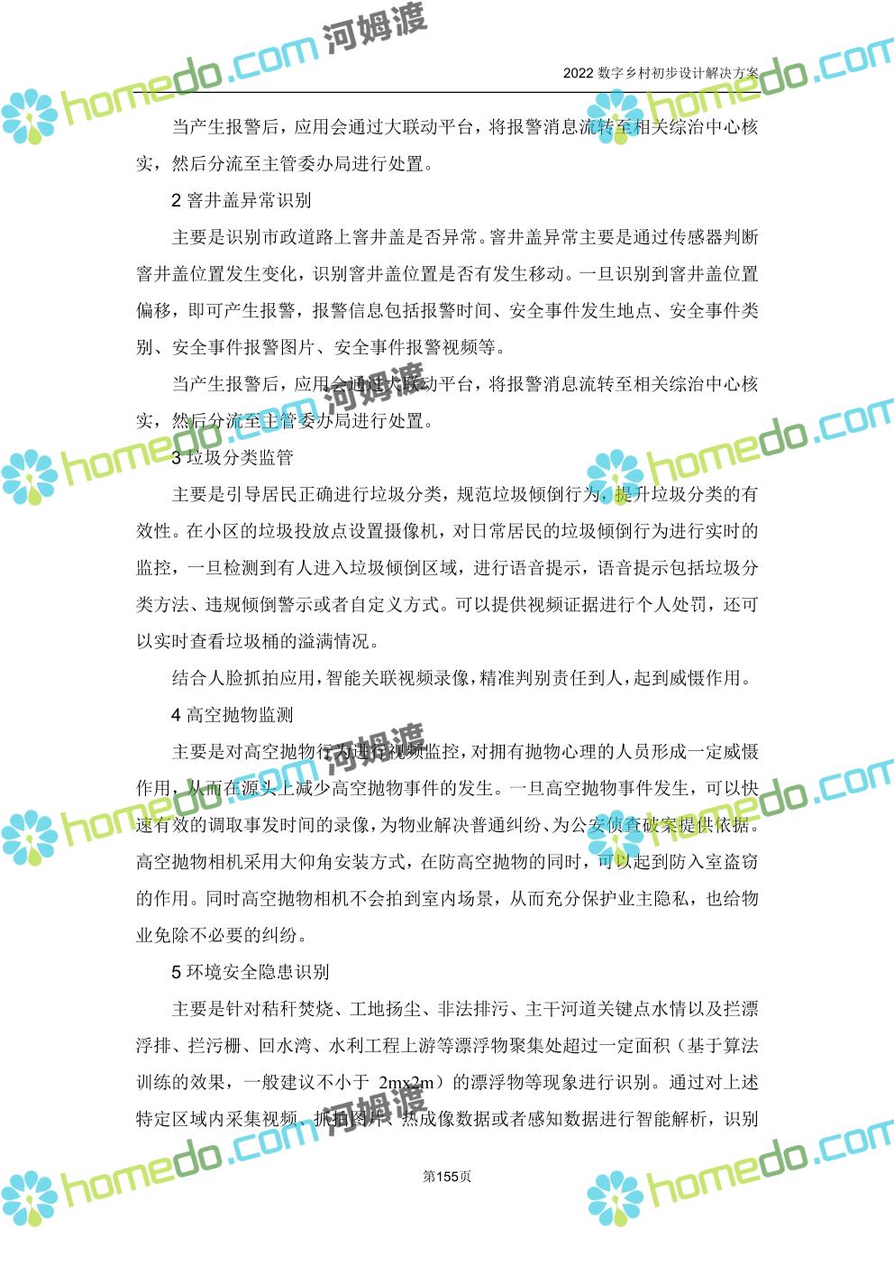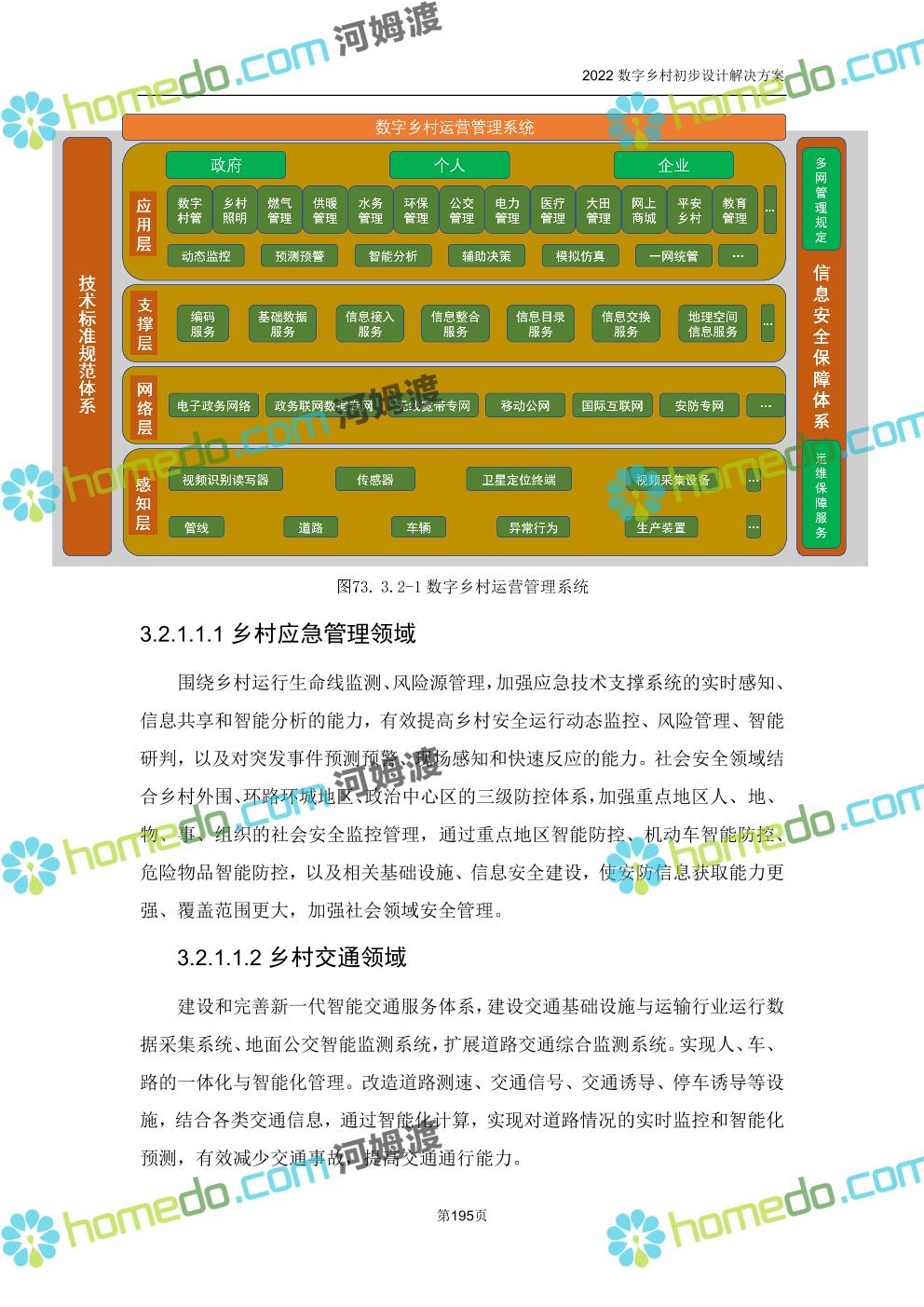 方案简介 依托全市农业农村大数据中心建设为中心,建设农业农村管理决策系统:建 设农产品全产业链监测预警系统:建设数字农业农村服务系统:建设农村人居环 境智能监测系统;建设乡村数字治理系统。 完成数字乡村信息化基础设施建设,包括前端感知设备、网络传输构建、机 房构建、数字乡村云搭建、数字乡村运营指挥中心建设。完成数字乡村管理者驾 驶舱建设,包括农业农村管理决策系统、数字乡村运营系统。完成数字乡村会客 厅建设。完成数字农业农村系统建设,完成数字农业农村服务系统建设。完成农 村人居环境智能监测系统建设。完成基础数据资源建设,完成数字乡村四大体系 建设。