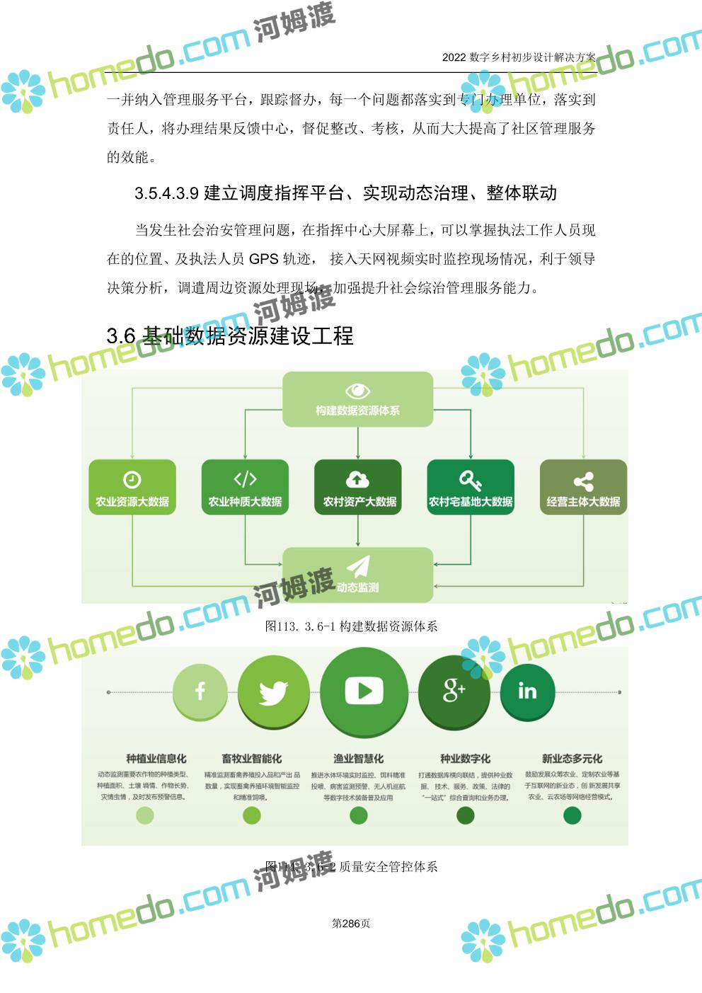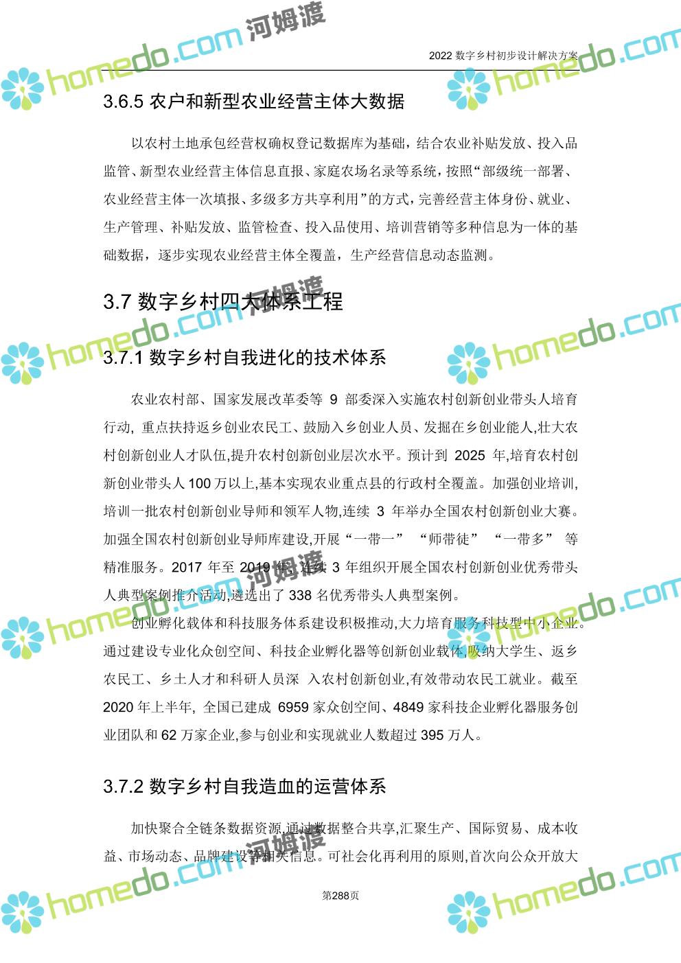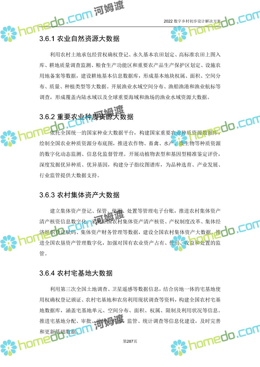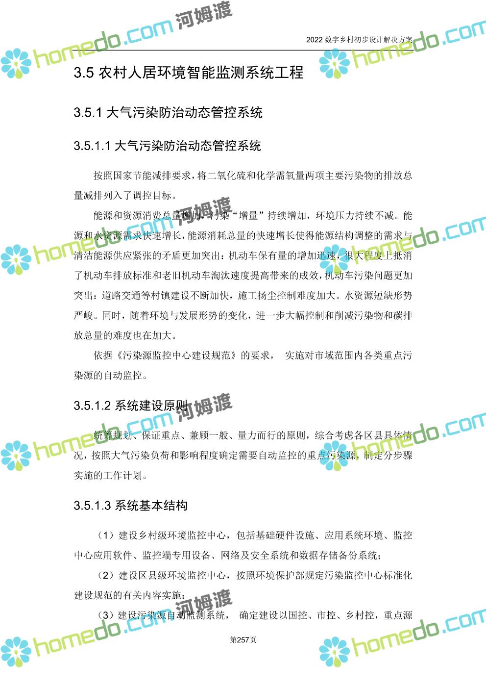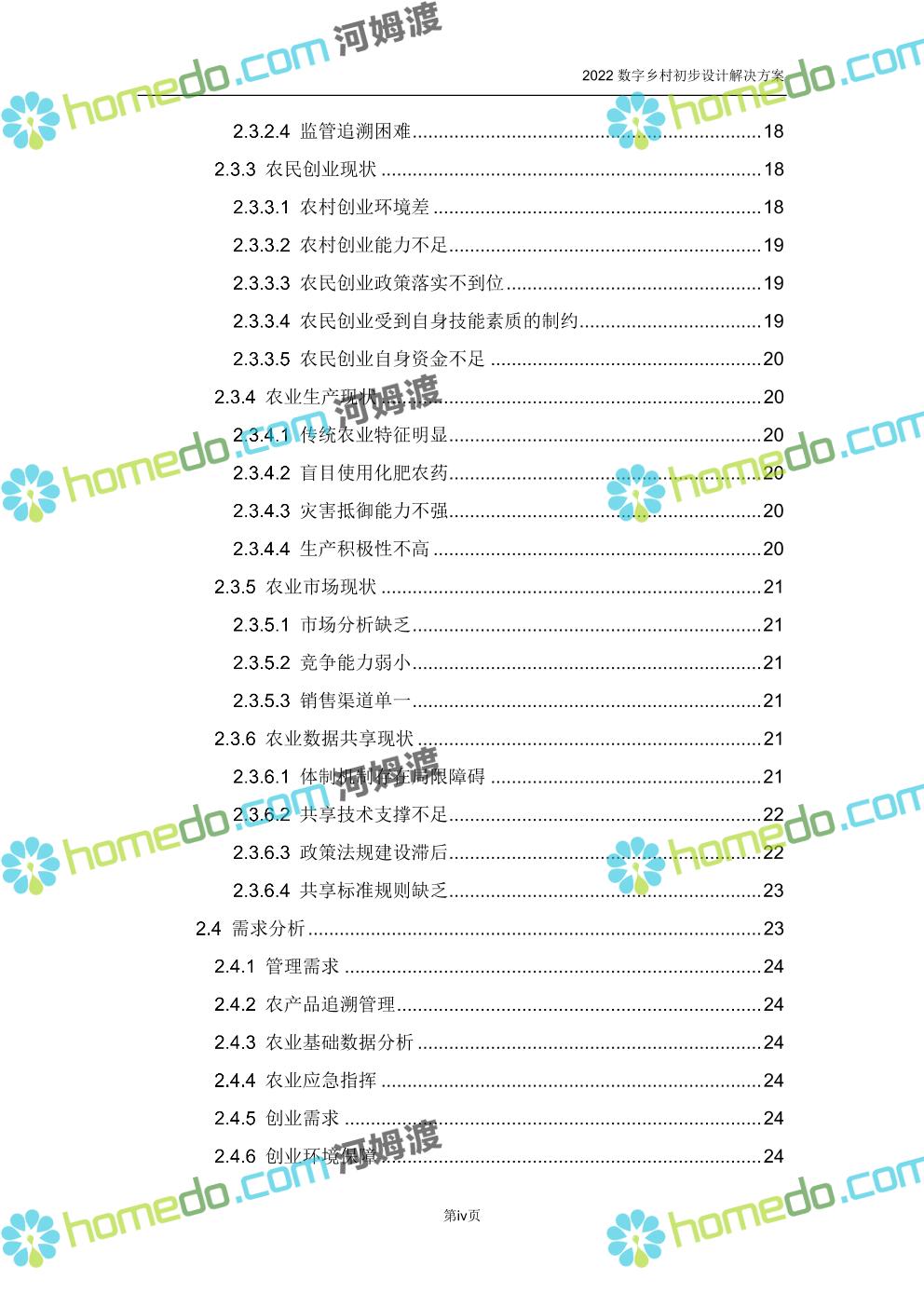 方案简介 依托全市农业农村大数据中心建设为中心,建设农业农村管理决策系统:建 设农产品全产业链监测预警系统:建设数字农业农村服务系统:建设农村人居环 境智能监测系统;建设乡村数字治理系统。 完成数字乡村信息化基础设施建设,包括前端感知设备、网络传输构建、机 房构建、数字乡村云搭建、数字乡村运营指挥中心建设。完成数字乡村管理者驾 驶舱建设,包括农业农村管理决策系统、数字乡村运营系统。完成数字乡村会客 厅建设。完成数字农业农村系统建设,完成数字农业农村服务系统建设。完成农 村人居环境智能监测系统建设。完成基础数据资源建设,完成数字乡村四大体系 建设。