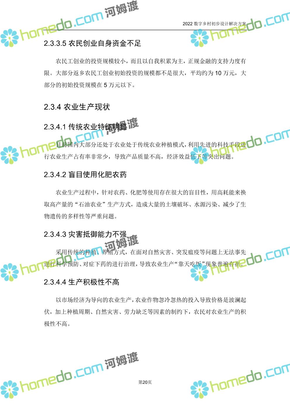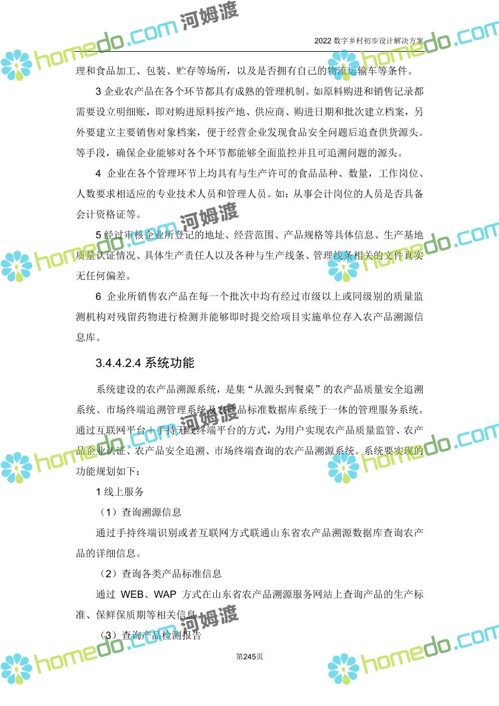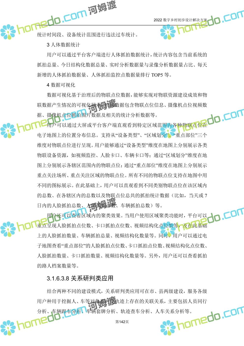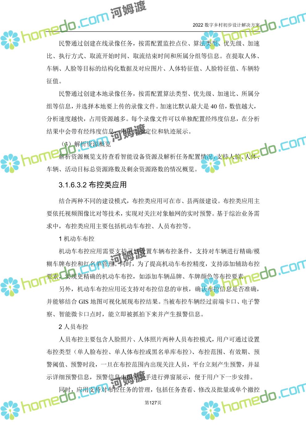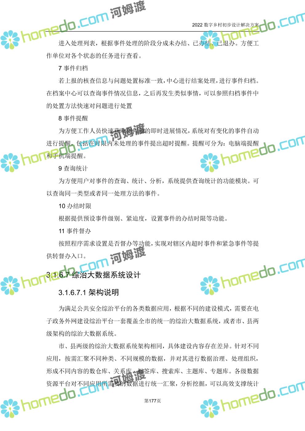 方案简介 依托全市农业农村大数据中心建设为中心,建设农业农村管理决策系统:建 设农产品全产业链监测预警系统:建设数字农业农村服务系统:建设农村人居环 境智能监测系统;建设乡村数字治理系统。 完成数字乡村信息化基础设施建设,包括前端感知设备、网络传输构建、机 房构建、数字乡村云搭建、数字乡村运营指挥中心建设。完成数字乡村管理者驾 驶舱建设,包括农业农村管理决策系统、数字乡村运营系统。完成数字乡村会客 厅建设。完成数字农业农村系统建设,完成数字农业农村服务系统建设。完成农 村人居环境智能监测系统建设。完成基础数据资源建设,完成数字乡村四大体系 建设。