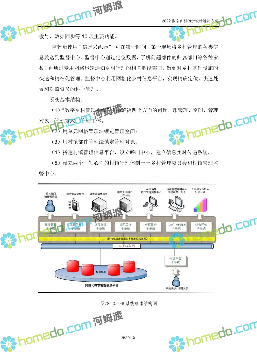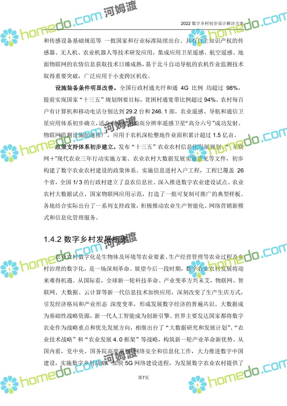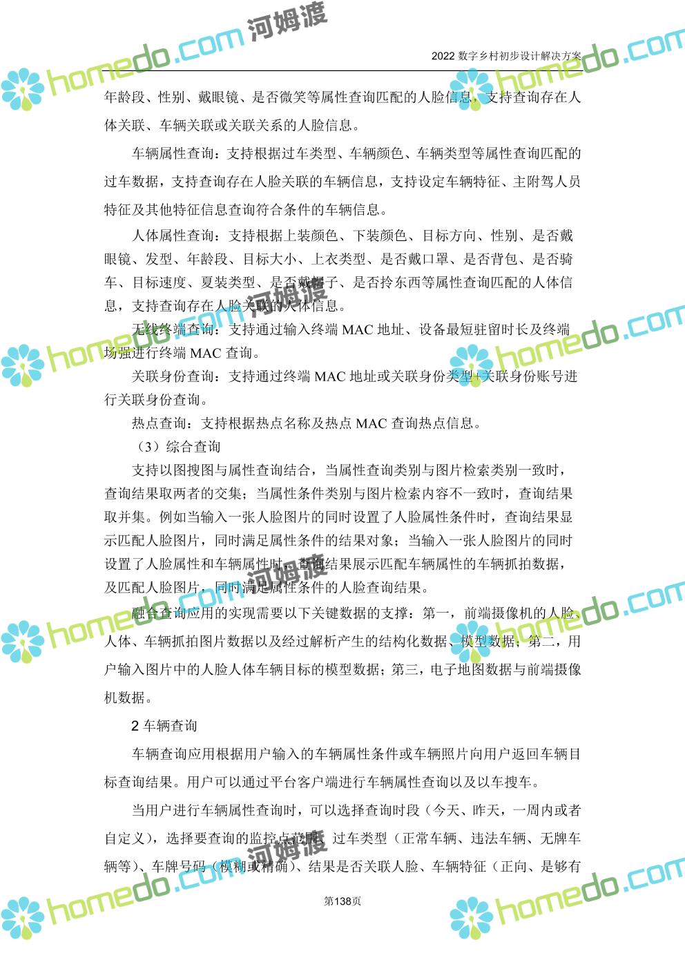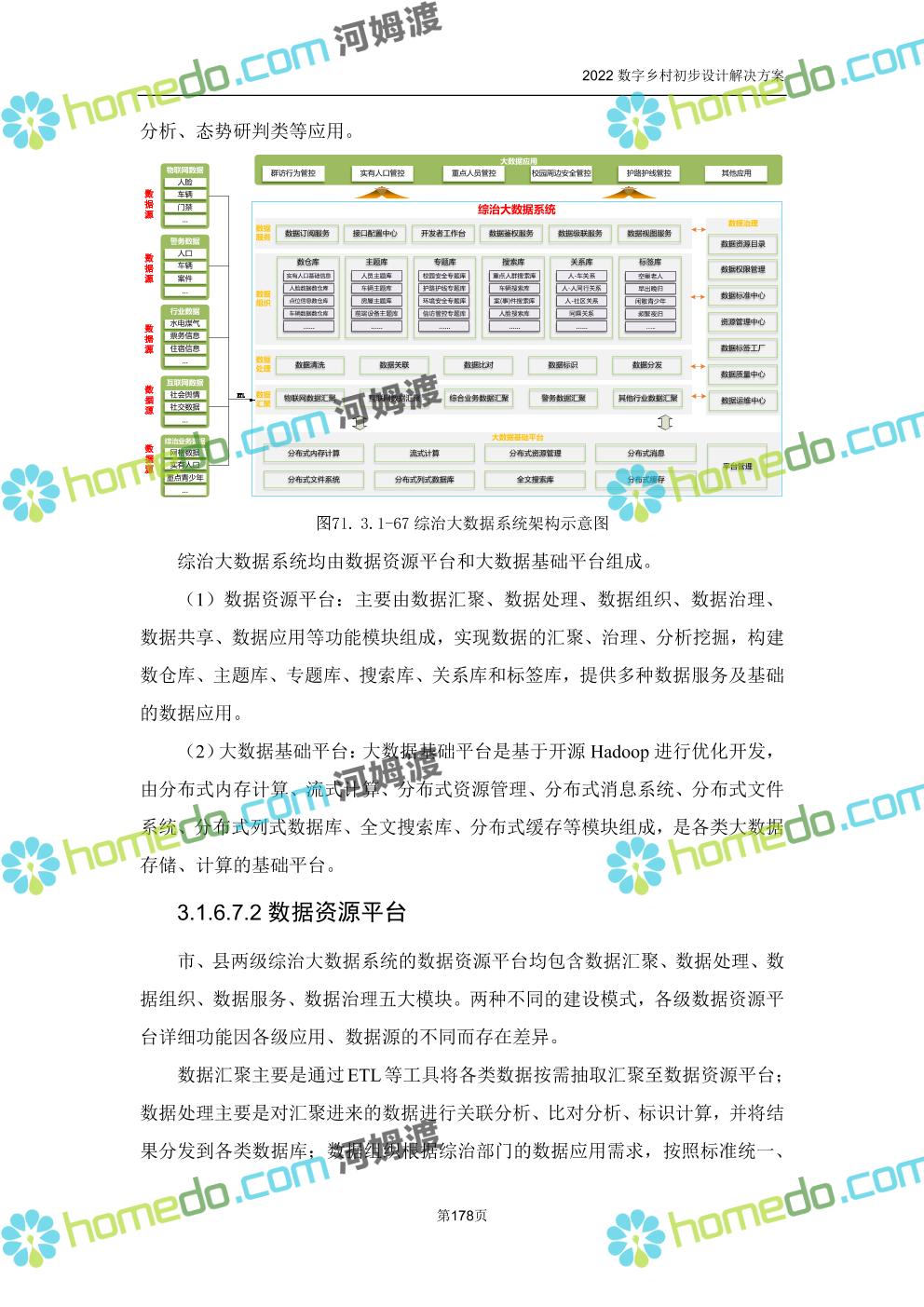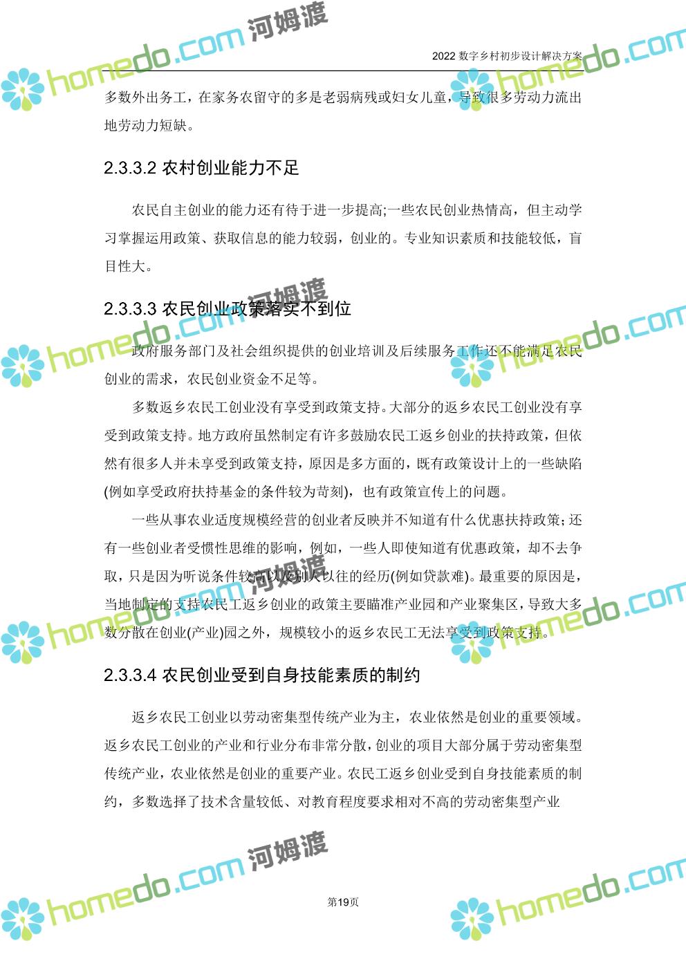 方案简介 依托全市农业农村大数据中心建设为中心,建设农业农村管理决策系统:建 设农产品全产业链监测预警系统:建设数字农业农村服务系统:建设农村人居环 境智能监测系统;建设乡村数字治理系统。 完成数字乡村信息化基础设施建设,包括前端感知设备、网络传输构建、机 房构建、数字乡村云搭建、数字乡村运营指挥中心建设。完成数字乡村管理者驾 驶舱建设,包括农业农村管理决策系统、数字乡村运营系统。完成数字乡村会客 厅建设。完成数字农业农村系统建设,完成数字农业农村服务系统建设。完成农 村人居环境智能监测系统建设。完成基础数据资源建设,完成数字乡村四大体系 建设。