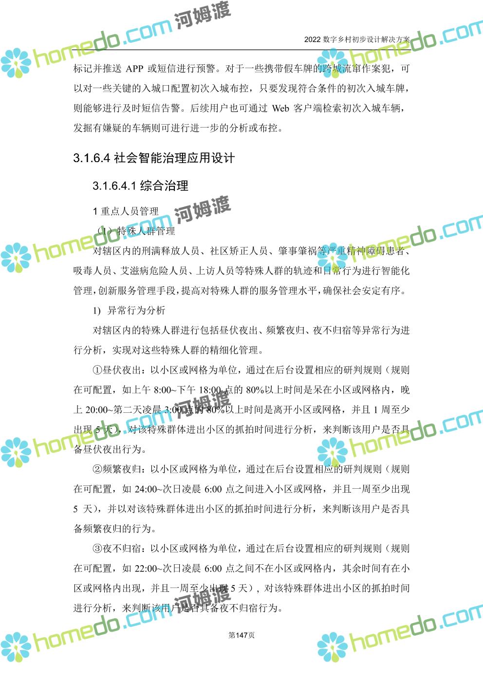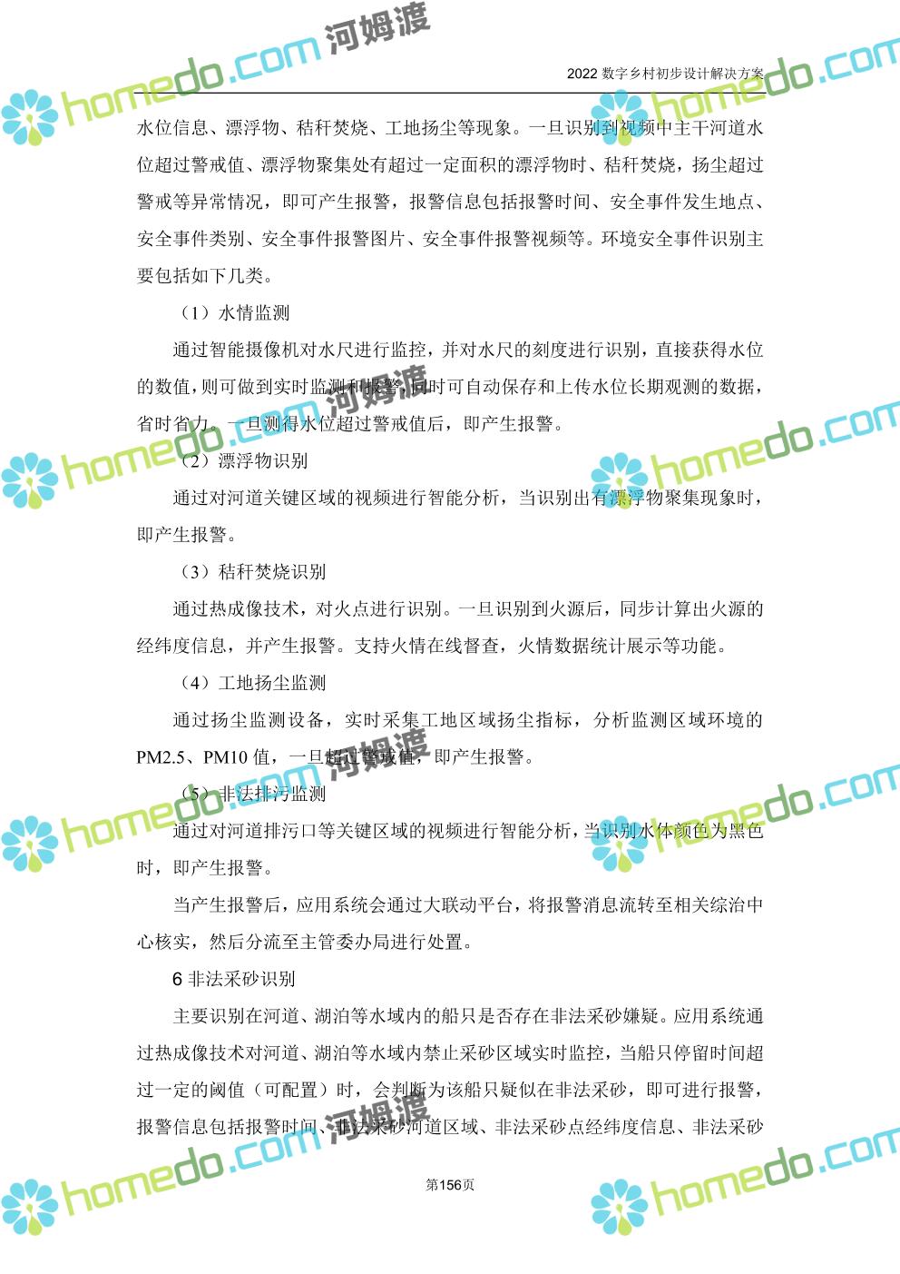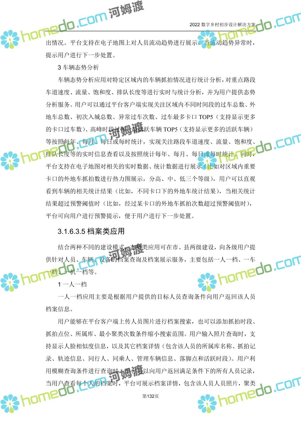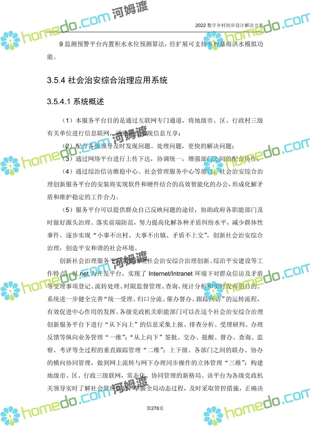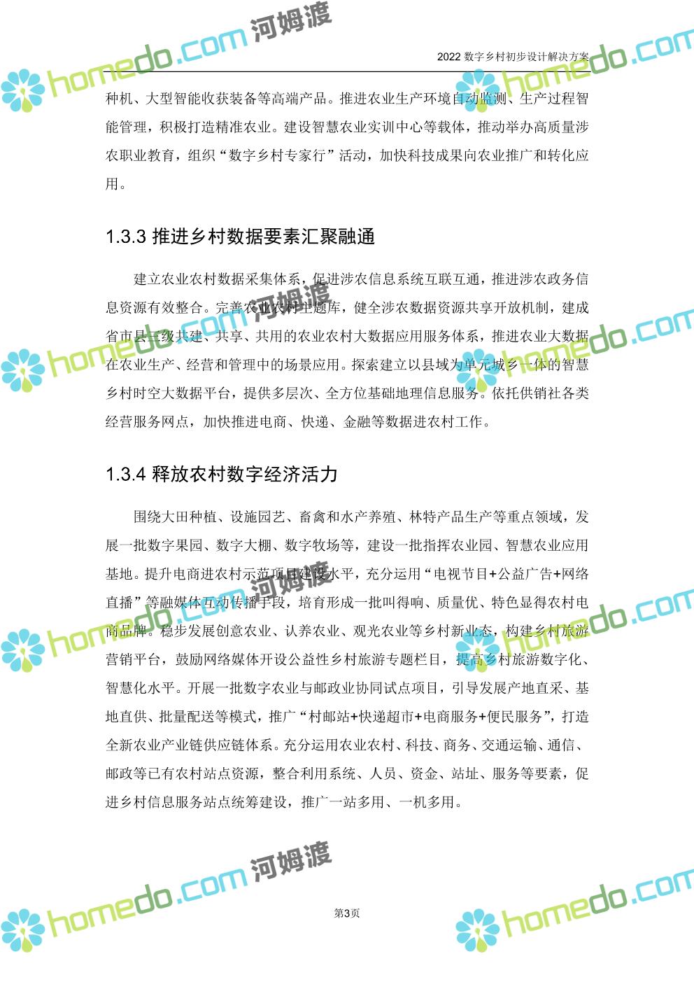 方案简介 依托全市农业农村大数据中心建设为中心,建设农业农村管理决策系统:建 设农产品全产业链监测预警系统:建设数字农业农村服务系统:建设农村人居环 境智能监测系统;建设乡村数字治理系统。 完成数字乡村信息化基础设施建设,包括前端感知设备、网络传输构建、机 房构建、数字乡村云搭建、数字乡村运营指挥中心建设。完成数字乡村管理者驾 驶舱建设,包括农业农村管理决策系统、数字乡村运营系统。完成数字乡村会客 厅建设。完成数字农业农村系统建设,完成数字农业农村服务系统建设。完成农 村人居环境智能监测系统建设。完成基础数据资源建设,完成数字乡村四大体系 建设。