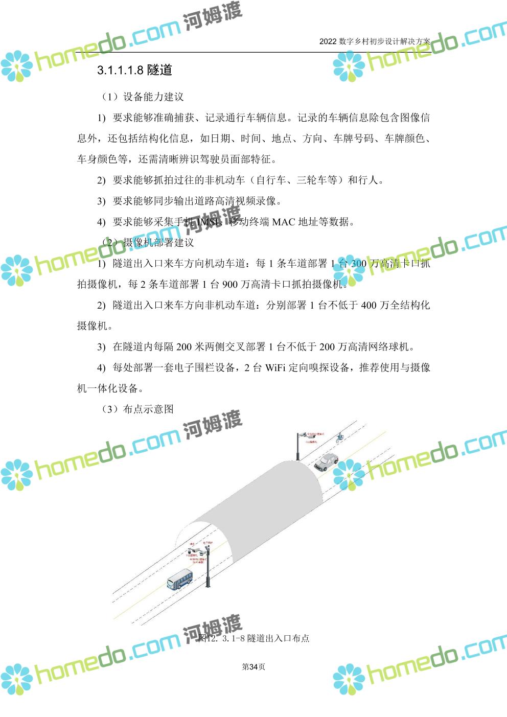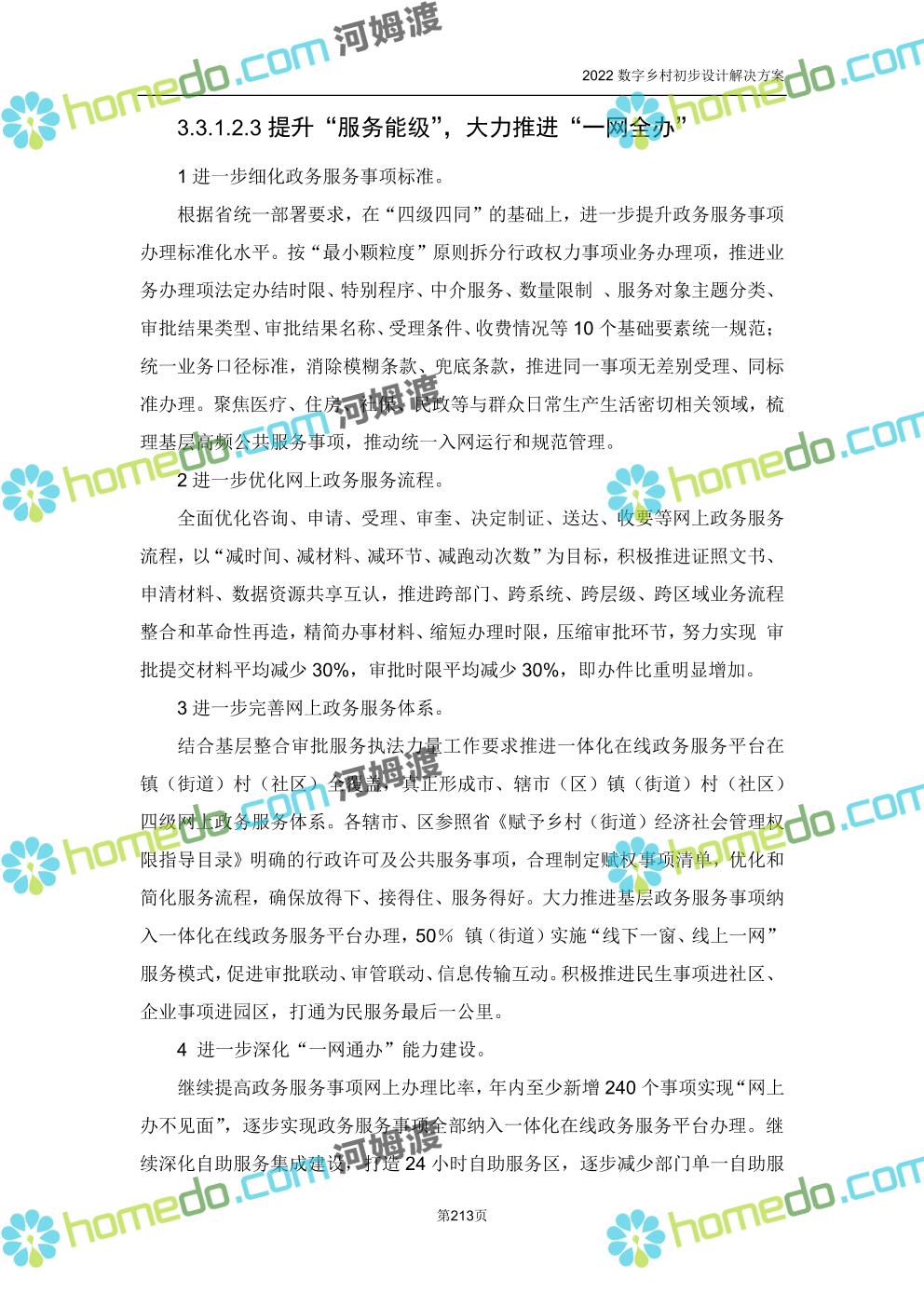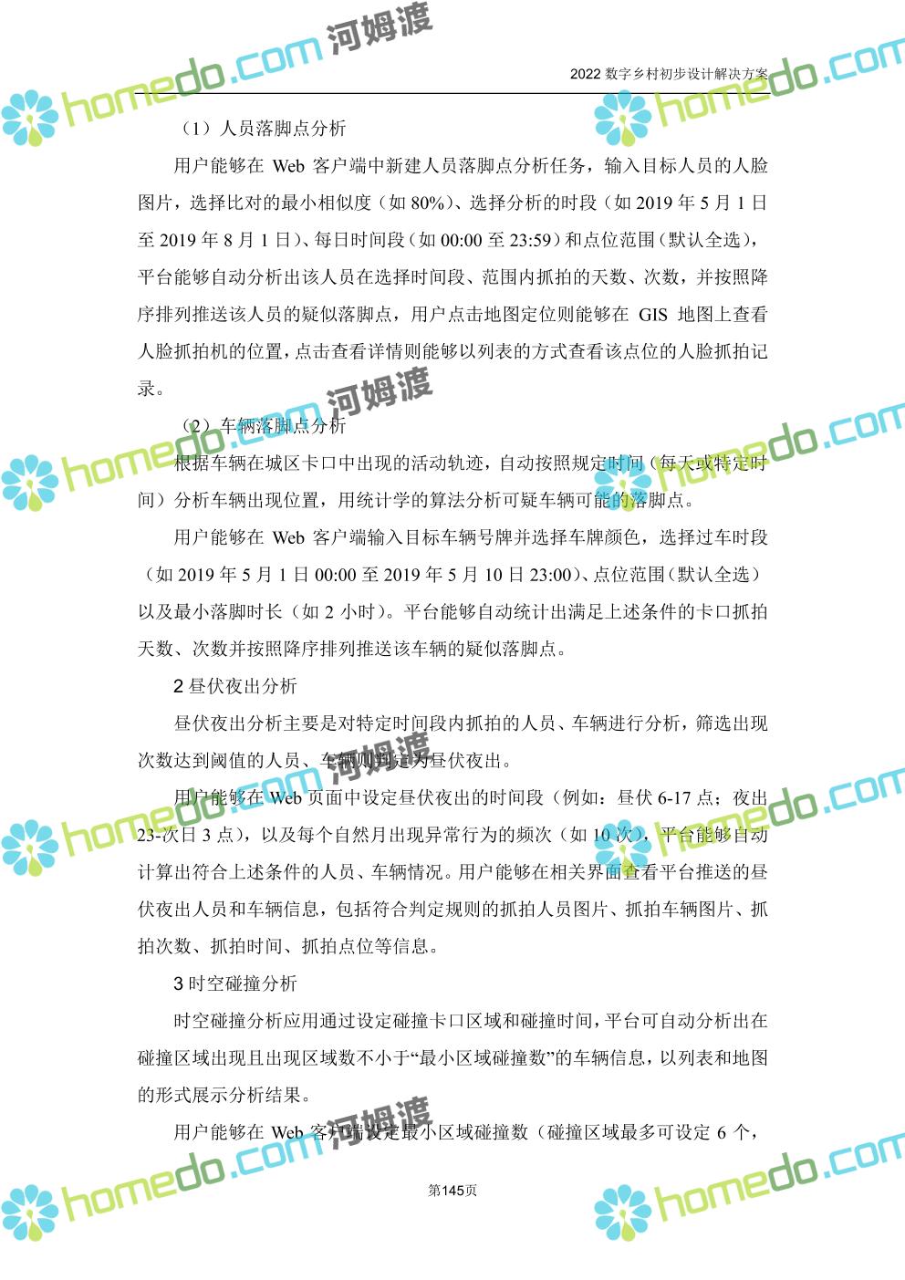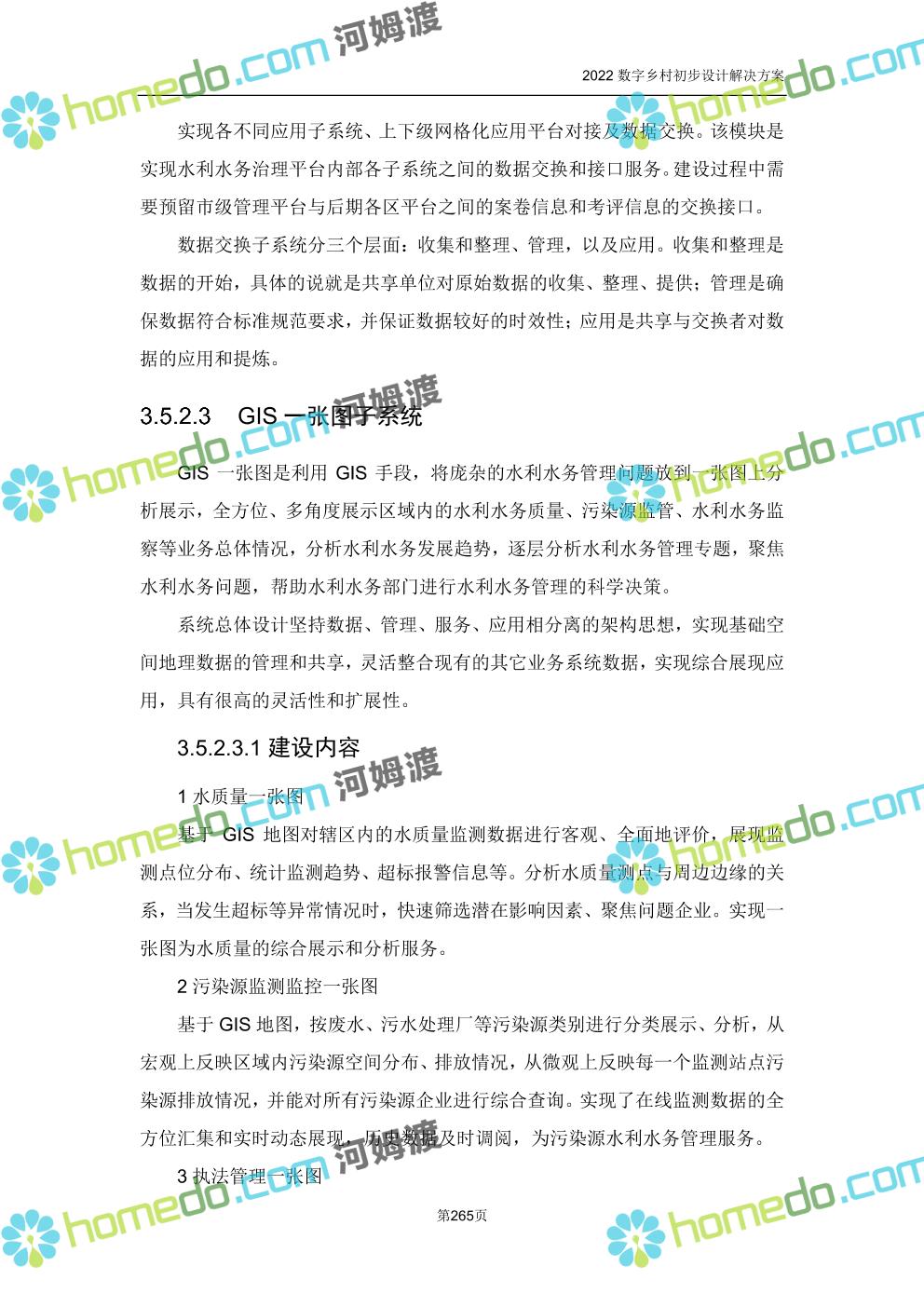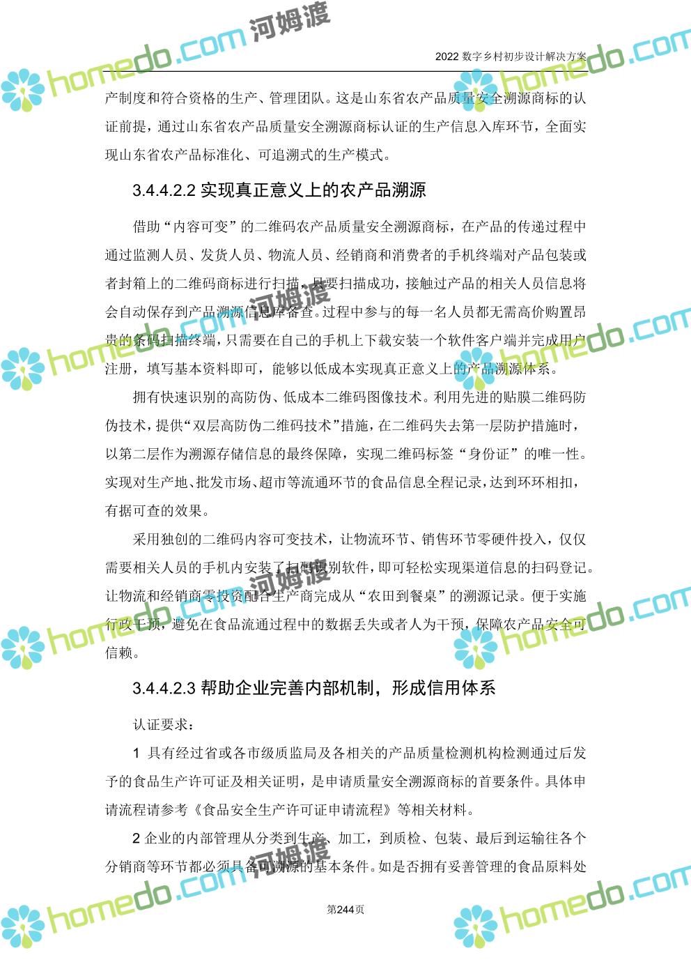方案简介 依托全市农业农村大数据中心建设为中心,建设农业农村管理决策系统:建 设农产品全产业链监测预警系统:建设数字农业农村服务系统:建设农村人居环 境智能监测系统;建设乡村数字治理系统。 完成数字乡村信息化基础设施建设,包括前端感知设备、网络传输构建、机 房构建、数字乡村云搭建、数字乡村运营指挥中心建设。完成数字乡村管理者驾 驶舱建设,包括农业农村管理决策系统、数字乡村运营系统。完成数字乡村会客 厅建设。完成数字农业农村系统建设,完成数字农业农村服务系统建设。完成农 村人居环境智能监测系统建设。完成基础数据资源建设,完成数字乡村四大体系 建设。