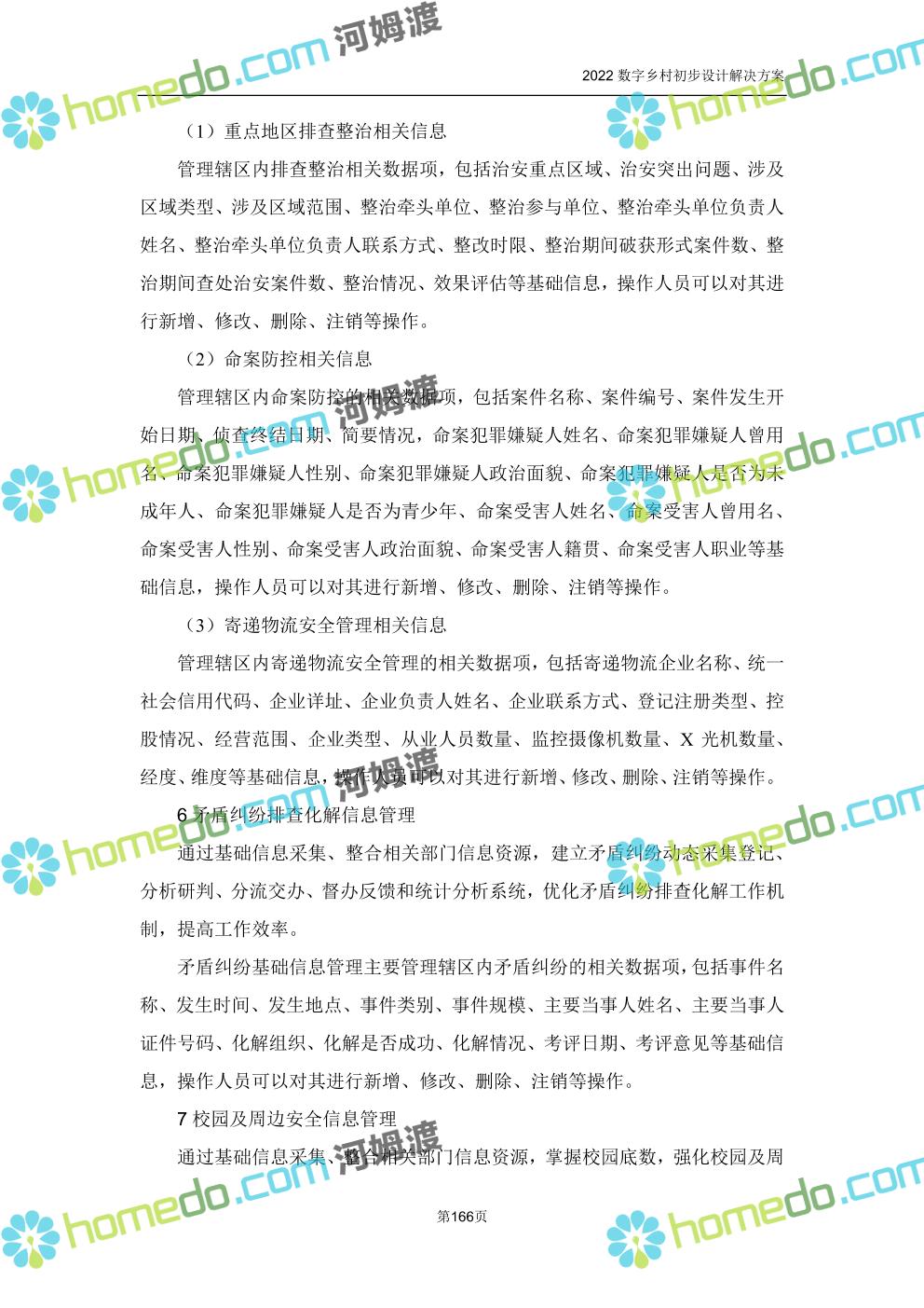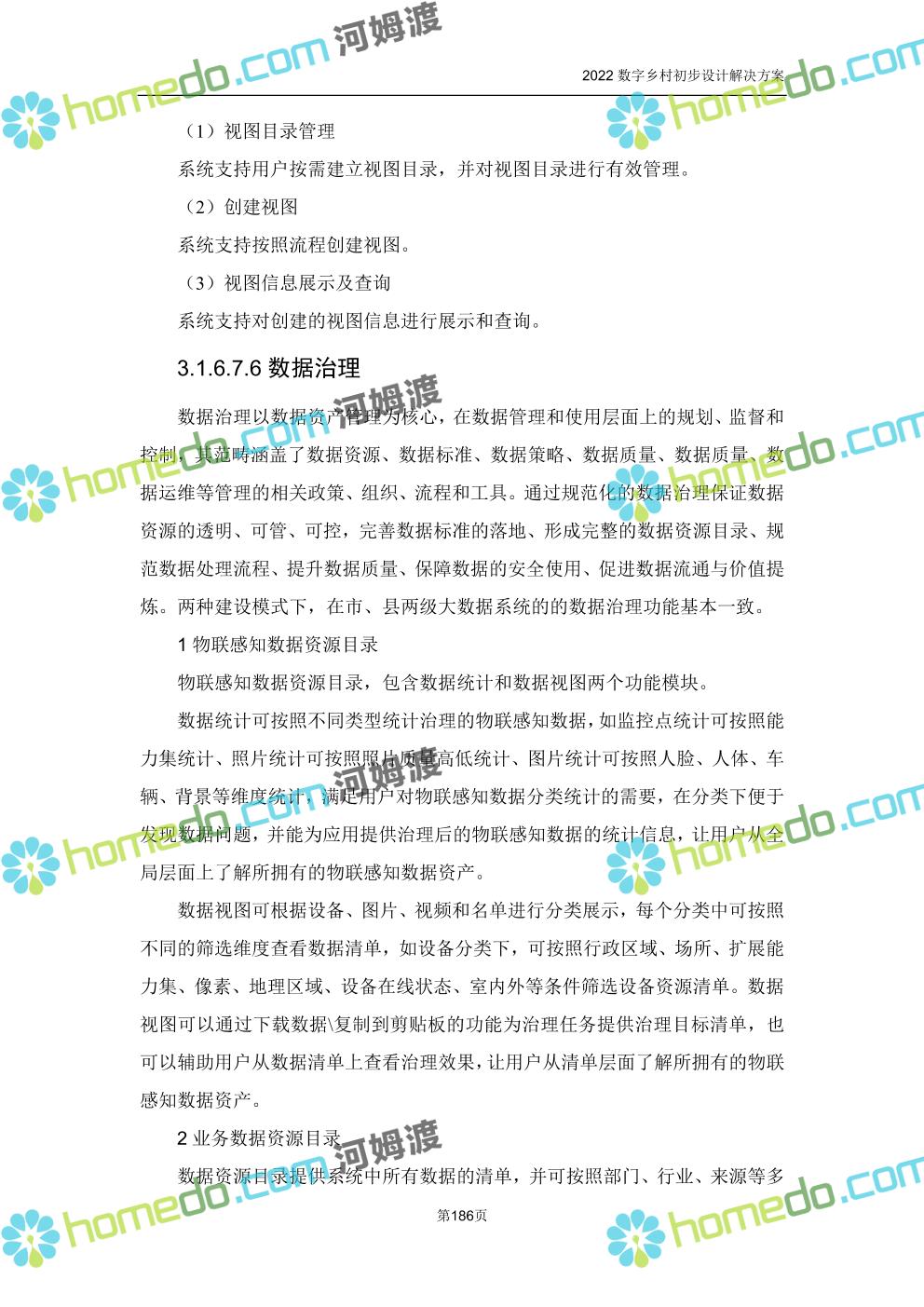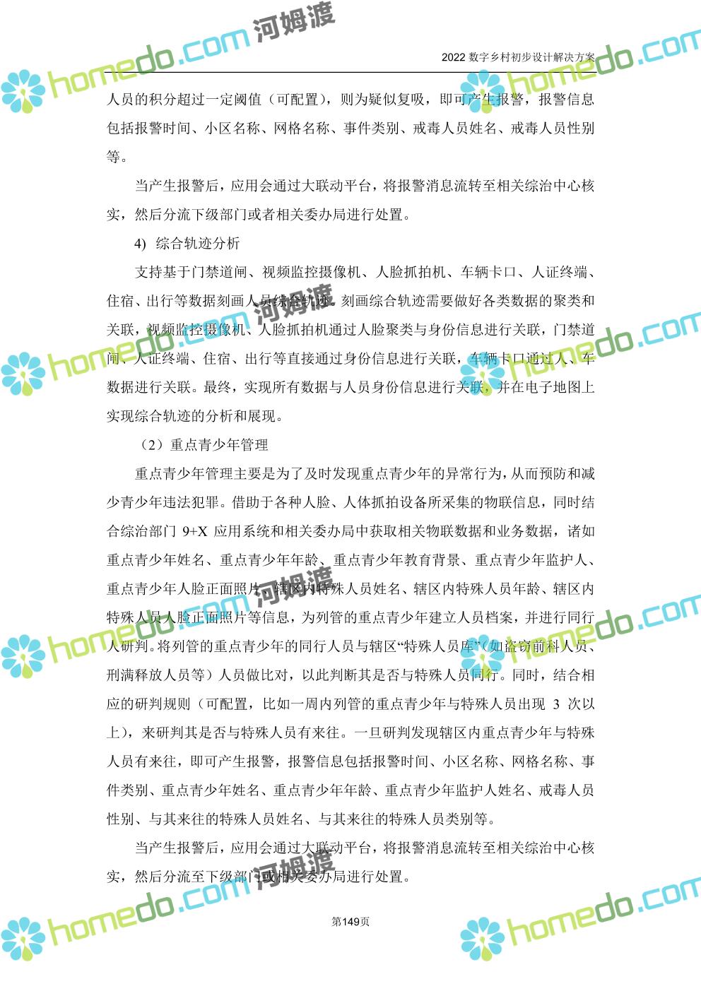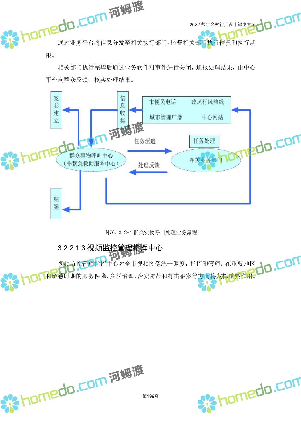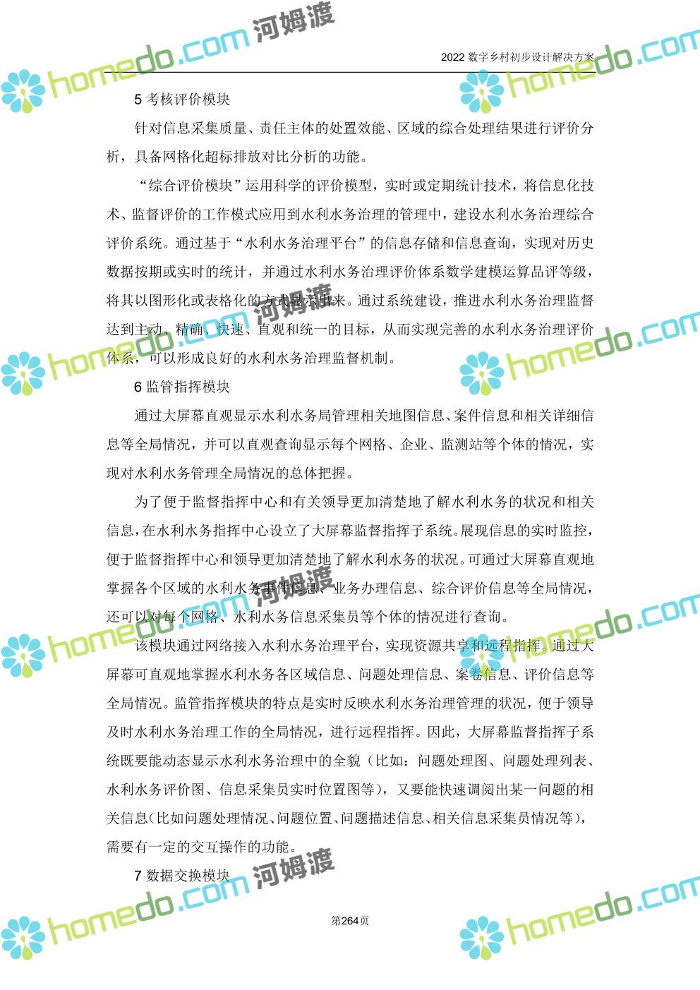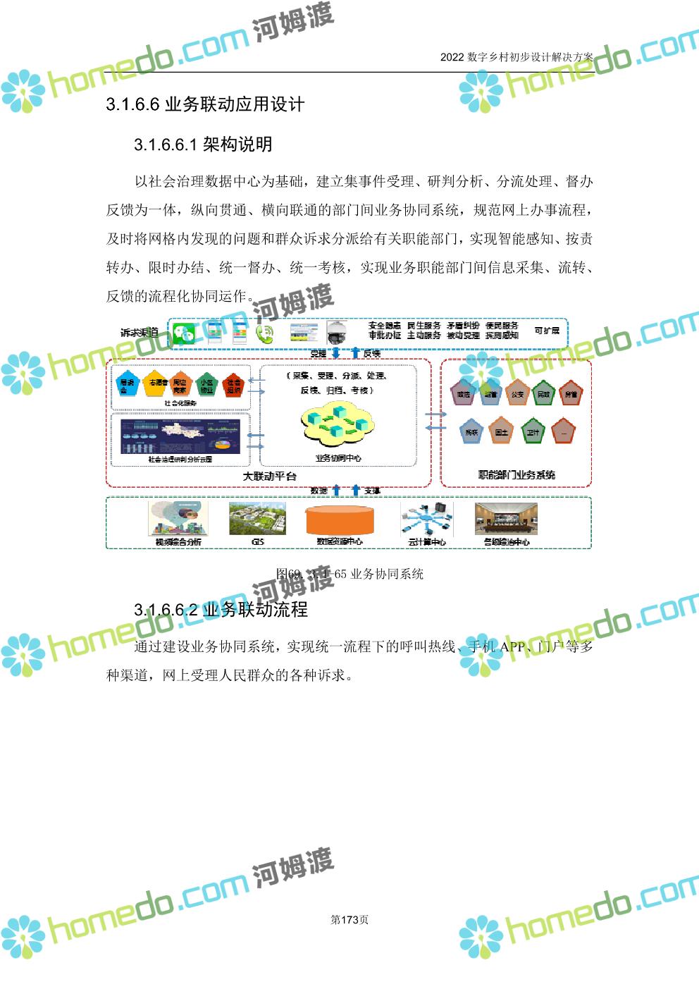方案简介 依托全市农业农村大数据中心建设为中心,建设农业农村管理决策系统:建 设农产品全产业链监测预警系统:建设数字农业农村服务系统:建设农村人居环 境智能监测系统;建设乡村数字治理系统。 完成数字乡村信息化基础设施建设,包括前端感知设备、网络传输构建、机 房构建、数字乡村云搭建、数字乡村运营指挥中心建设。完成数字乡村管理者驾 驶舱建设,包括农业农村管理决策系统、数字乡村运营系统。完成数字乡村会客 厅建设。完成数字农业农村系统建设,完成数字农业农村服务系统建设。完成农 村人居环境智能监测系统建设。完成基础数据资源建设,完成数字乡村四大体系 建设。