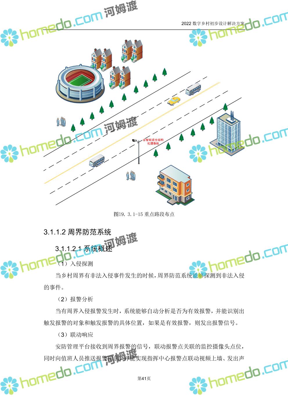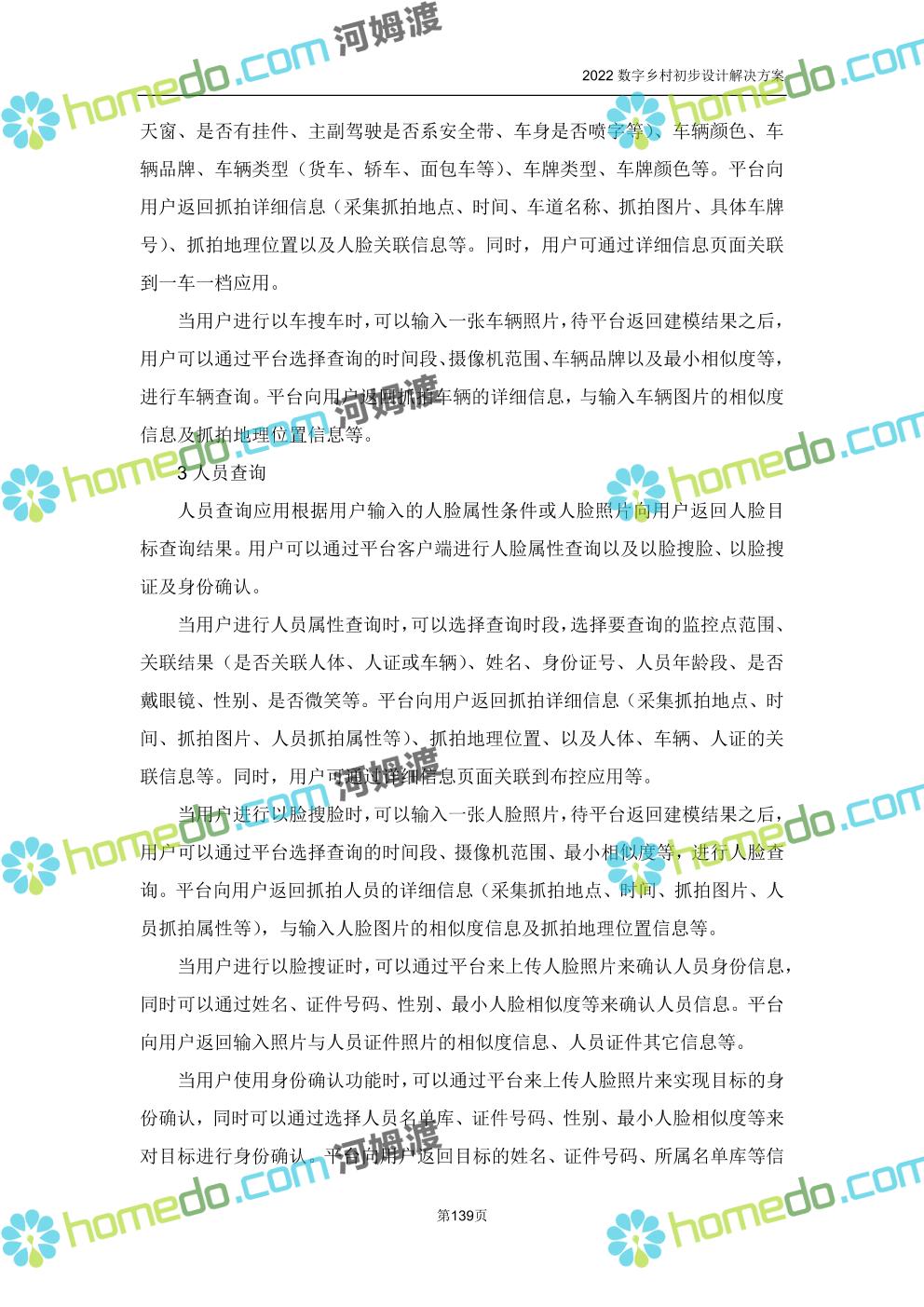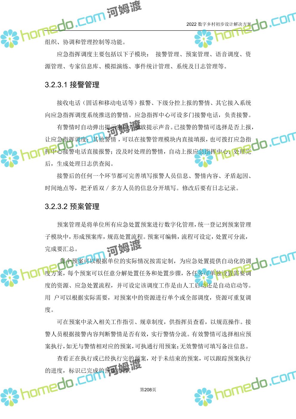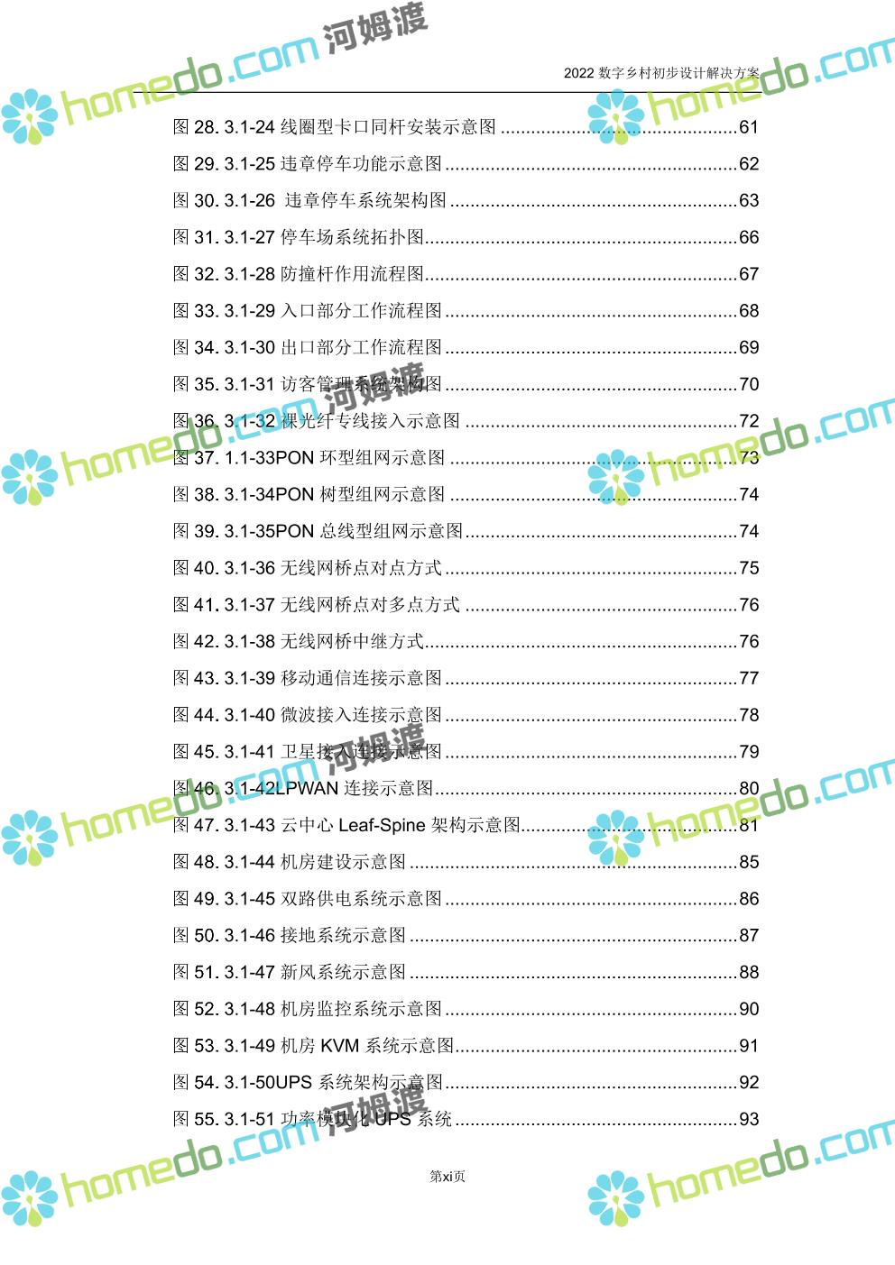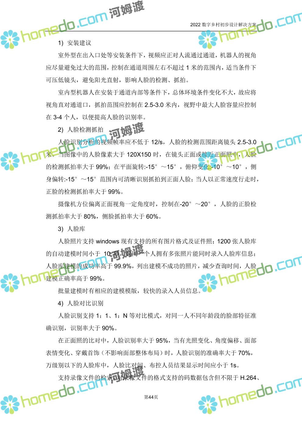 方案简介 依托全市农业农村大数据中心建设为中心,建设农业农村管理决策系统:建 设农产品全产业链监测预警系统:建设数字农业农村服务系统:建设农村人居环 境智能监测系统;建设乡村数字治理系统。 完成数字乡村信息化基础设施建设,包括前端感知设备、网络传输构建、机 房构建、数字乡村云搭建、数字乡村运营指挥中心建设。完成数字乡村管理者驾 驶舱建设,包括农业农村管理决策系统、数字乡村运营系统。完成数字乡村会客 厅建设。完成数字农业农村系统建设,完成数字农业农村服务系统建设。完成农 村人居环境智能监测系统建设。完成基础数据资源建设,完成数字乡村四大体系 建设。