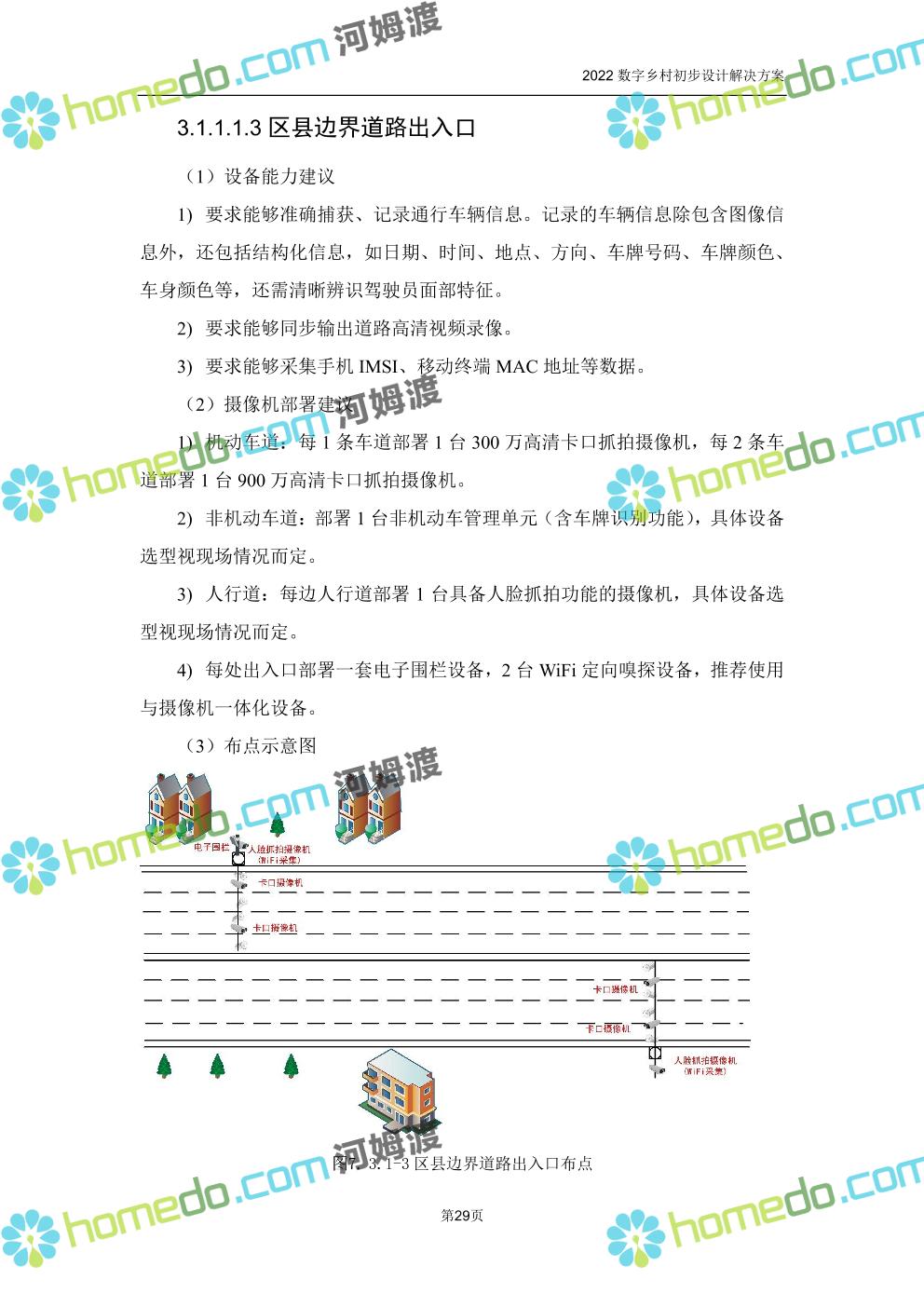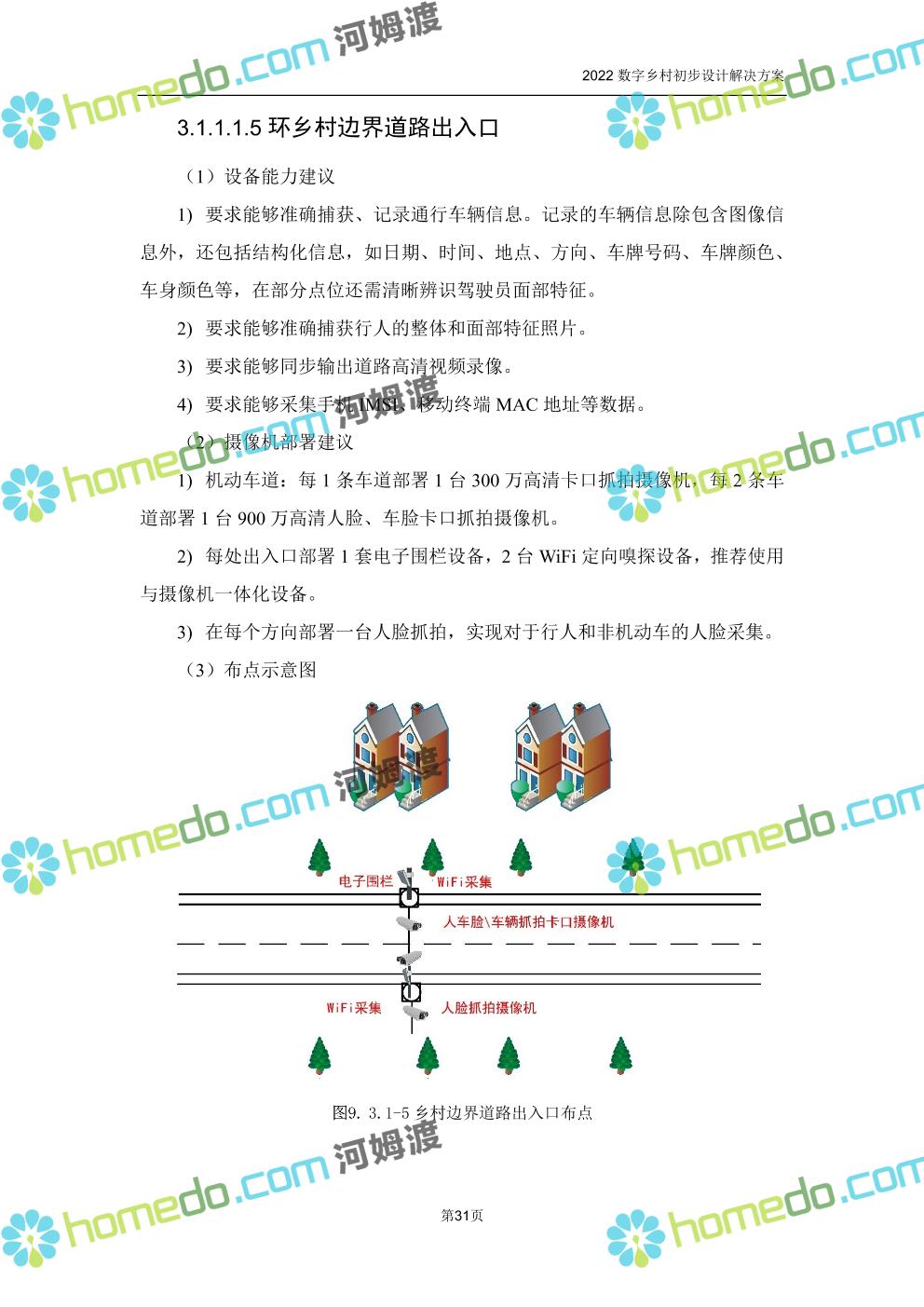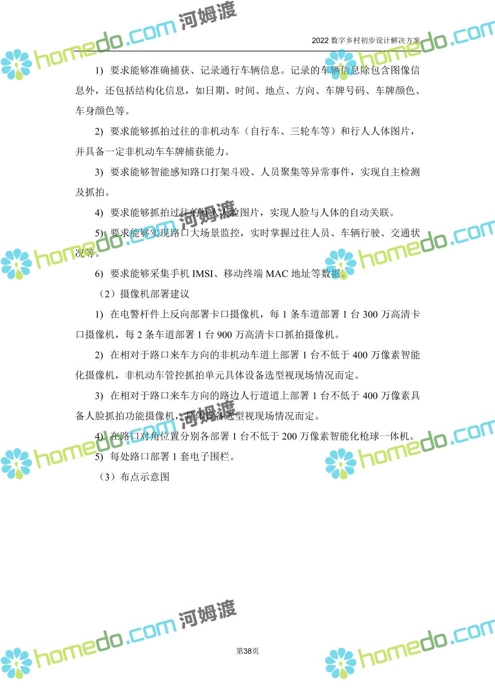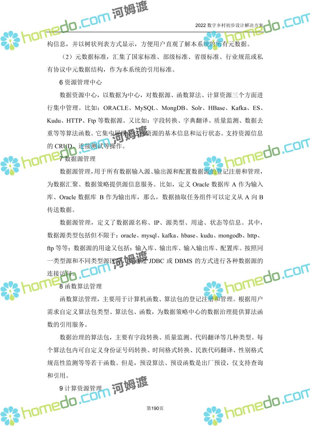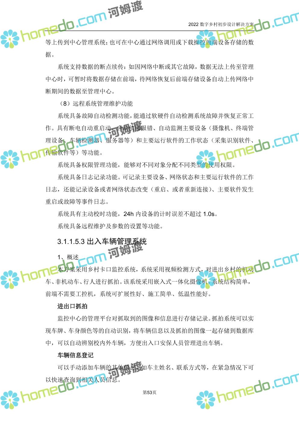 方案简介 依托全市农业农村大数据中心建设为中心,建设农业农村管理决策系统:建 设农产品全产业链监测预警系统:建设数字农业农村服务系统:建设农村人居环 境智能监测系统;建设乡村数字治理系统。 完成数字乡村信息化基础设施建设,包括前端感知设备、网络传输构建、机 房构建、数字乡村云搭建、数字乡村运营指挥中心建设。完成数字乡村管理者驾 驶舱建设,包括农业农村管理决策系统、数字乡村运营系统。完成数字乡村会客 厅建设。完成数字农业农村系统建设,完成数字农业农村服务系统建设。完成农 村人居环境智能监测系统建设。完成基础数据资源建设,完成数字乡村四大体系 建设。