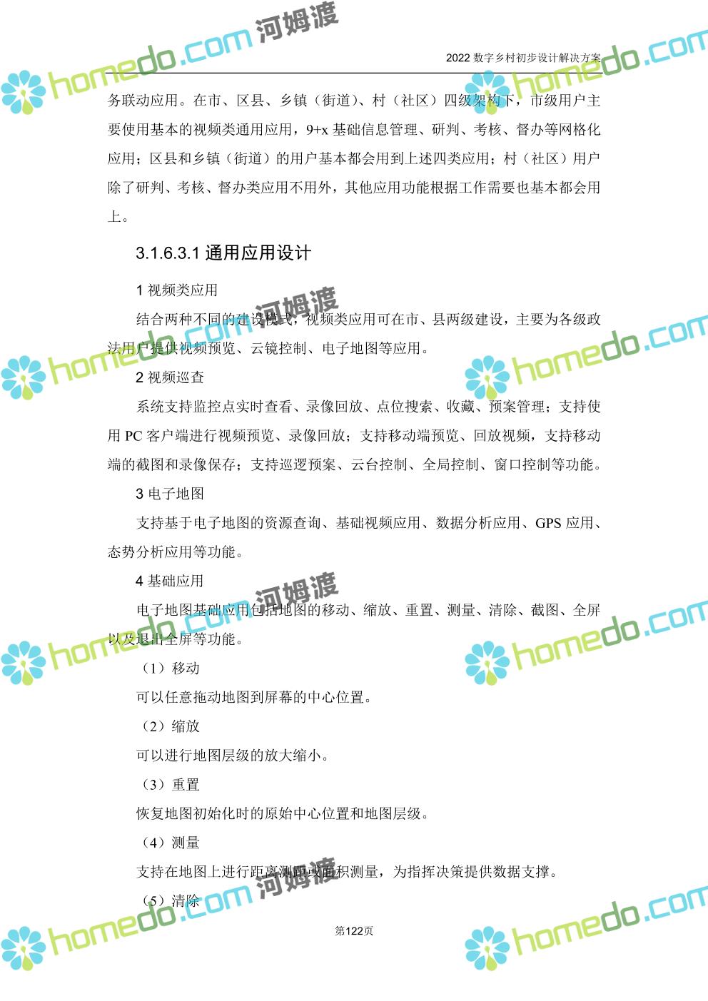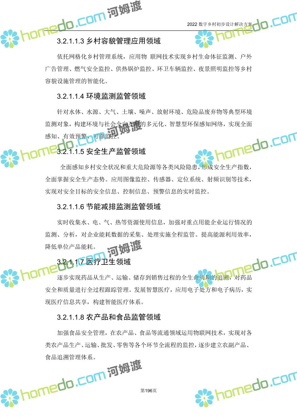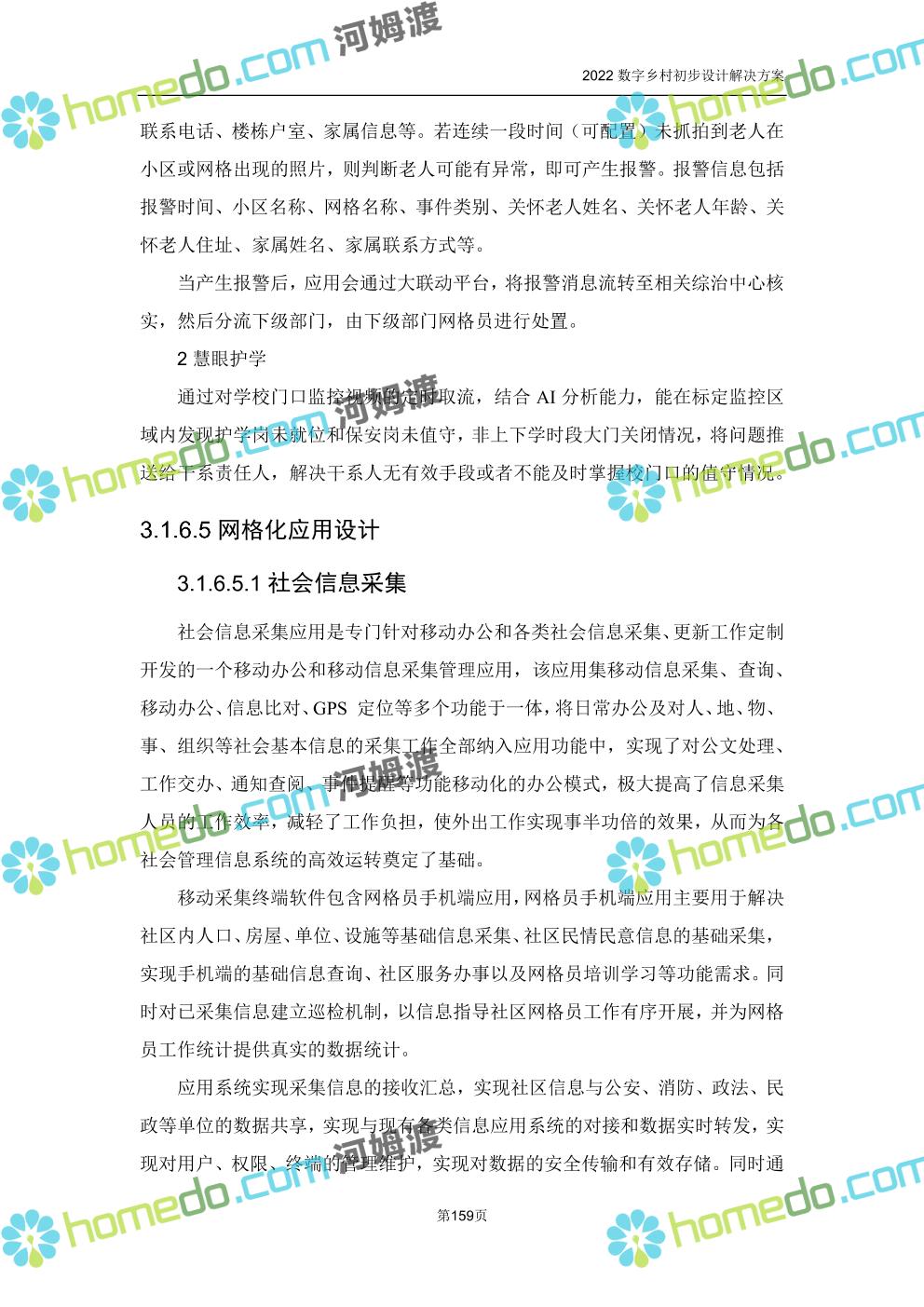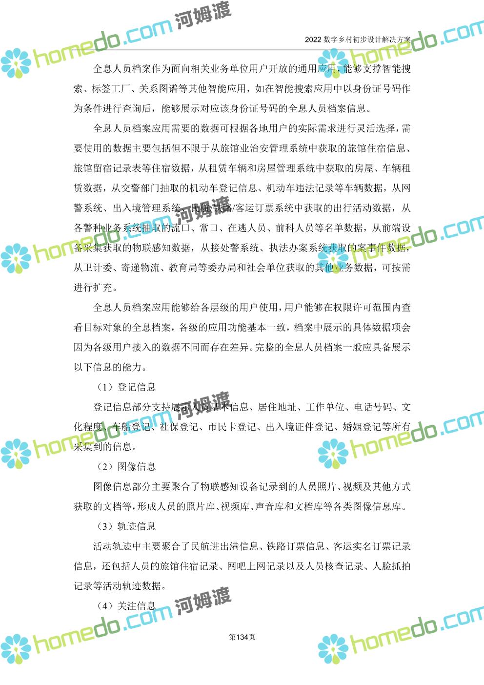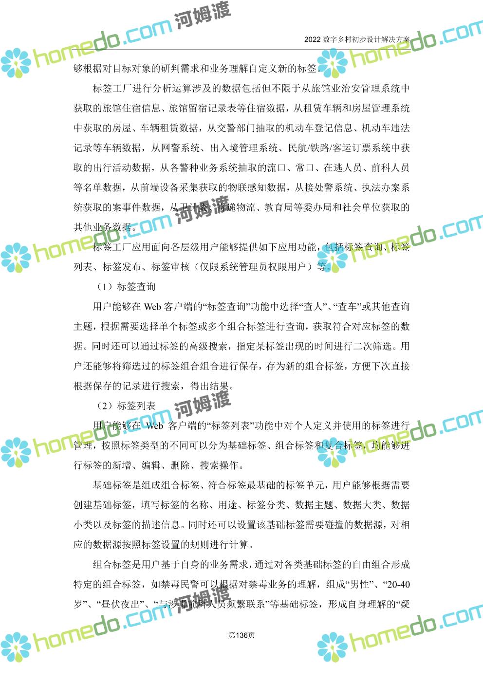 方案简介 依托全市农业农村大数据中心建设为中心,建设农业农村管理决策系统:建 设农产品全产业链监测预警系统:建设数字农业农村服务系统:建设农村人居环 境智能监测系统;建设乡村数字治理系统。 完成数字乡村信息化基础设施建设,包括前端感知设备、网络传输构建、机 房构建、数字乡村云搭建、数字乡村运营指挥中心建设。完成数字乡村管理者驾 驶舱建设,包括农业农村管理决策系统、数字乡村运营系统。完成数字乡村会客 厅建设。完成数字农业农村系统建设,完成数字农业农村服务系统建设。完成农 村人居环境智能监测系统建设。完成基础数据资源建设,完成数字乡村四大体系 建设。
