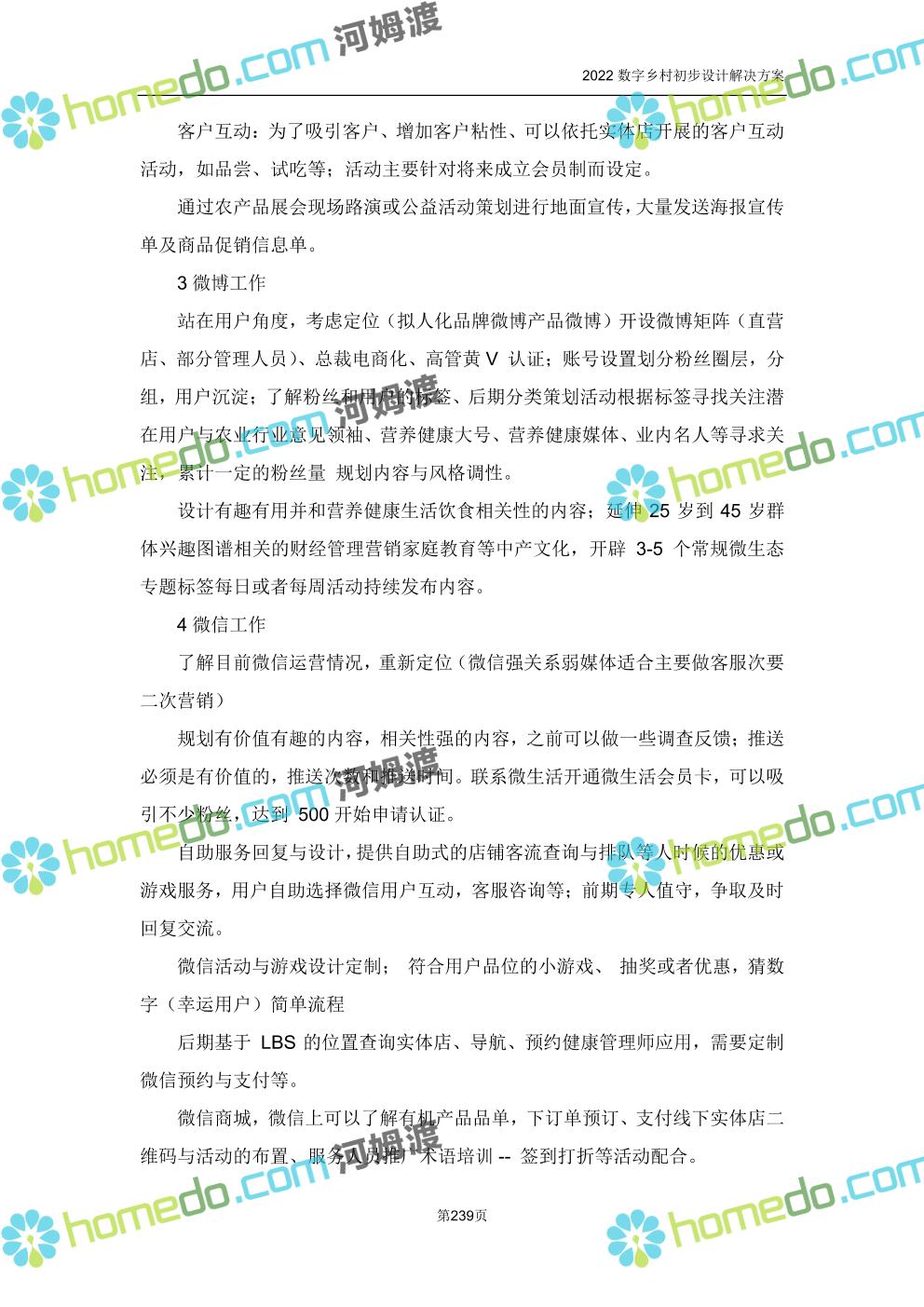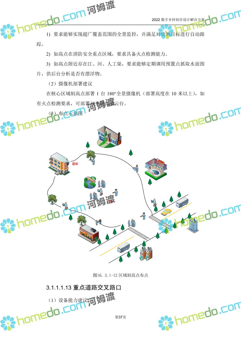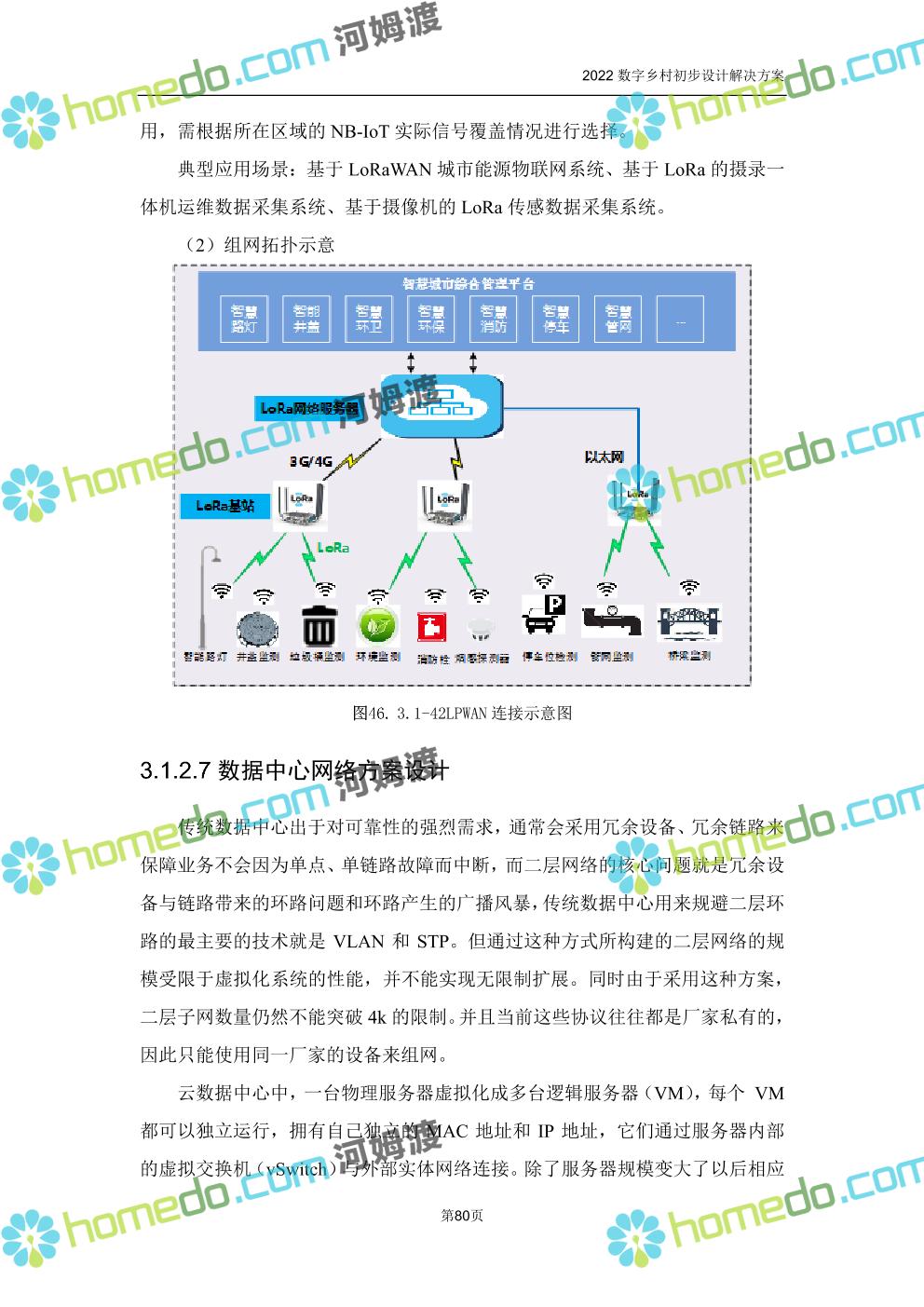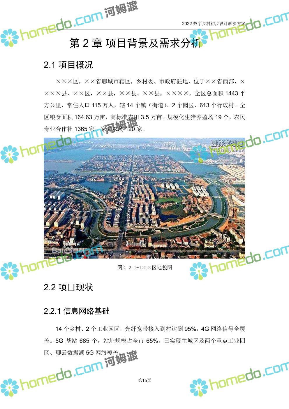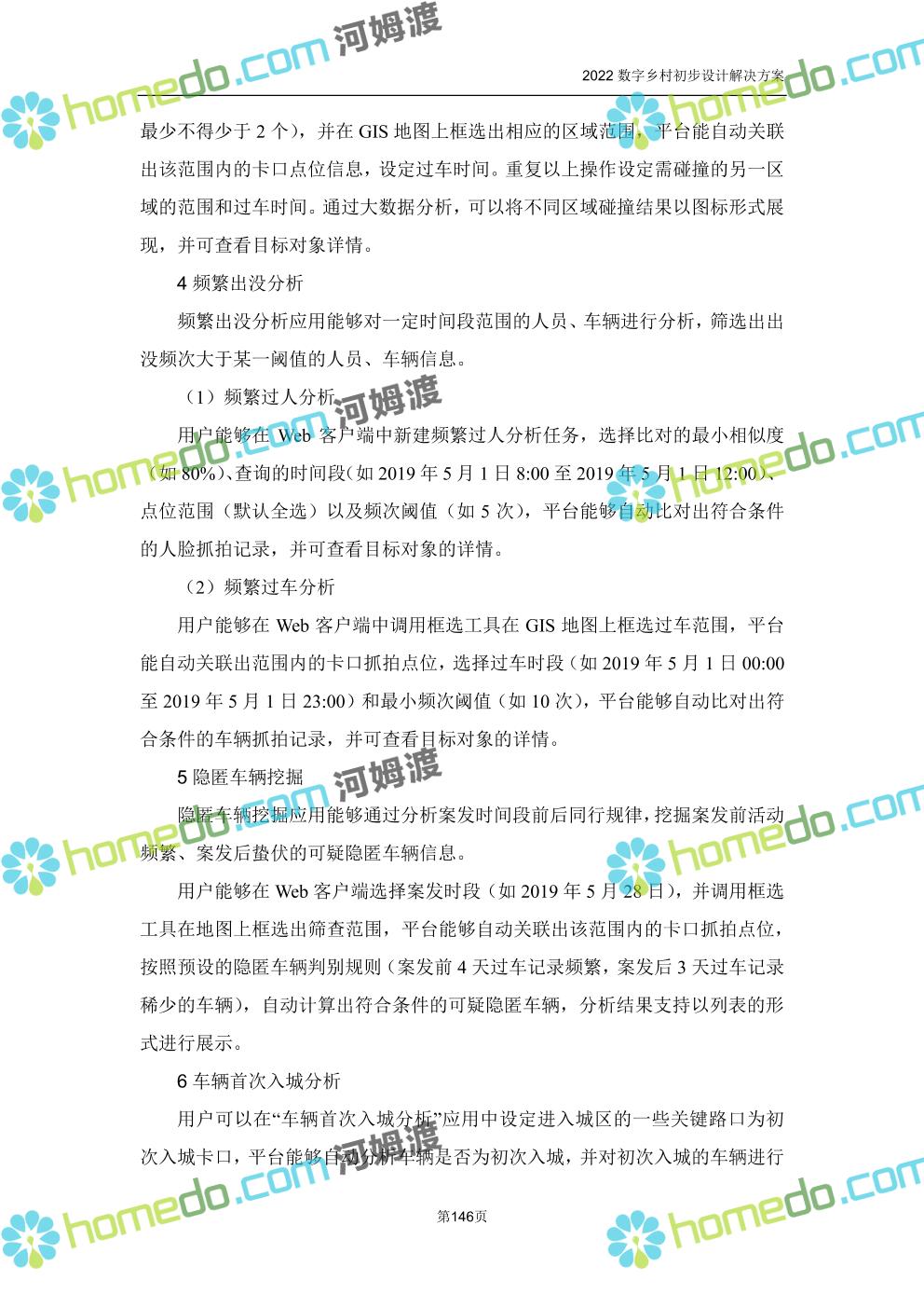 方案简介 依托全市农业农村大数据中心建设为中心,建设农业农村管理决策系统:建 设农产品全产业链监测预警系统:建设数字农业农村服务系统:建设农村人居环 境智能监测系统;建设乡村数字治理系统。 完成数字乡村信息化基础设施建设,包括前端感知设备、网络传输构建、机 房构建、数字乡村云搭建、数字乡村运营指挥中心建设。完成数字乡村管理者驾 驶舱建设,包括农业农村管理决策系统、数字乡村运营系统。完成数字乡村会客 厅建设。完成数字农业农村系统建设,完成数字农业农村服务系统建设。完成农 村人居环境智能监测系统建设。完成基础数据资源建设,完成数字乡村四大体系 建设。