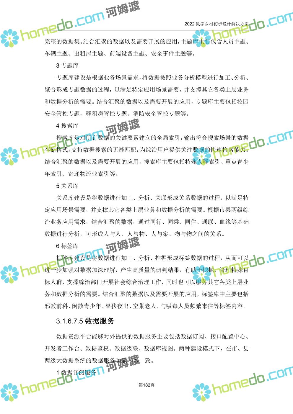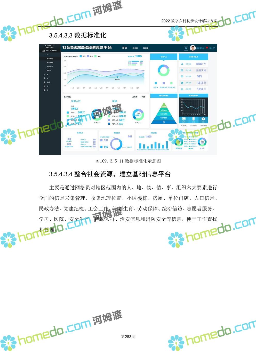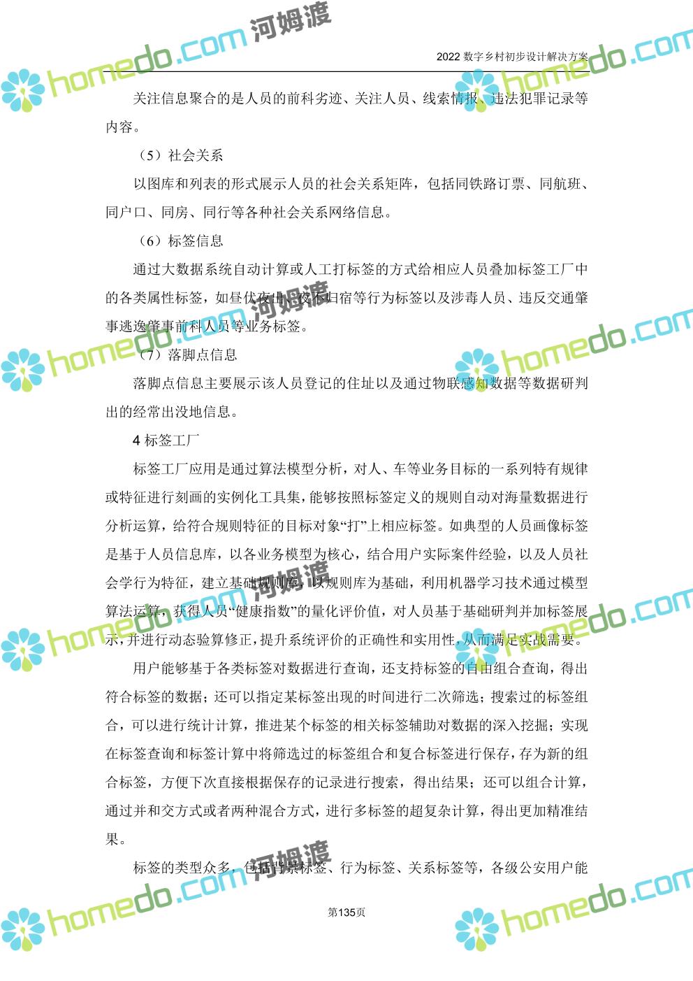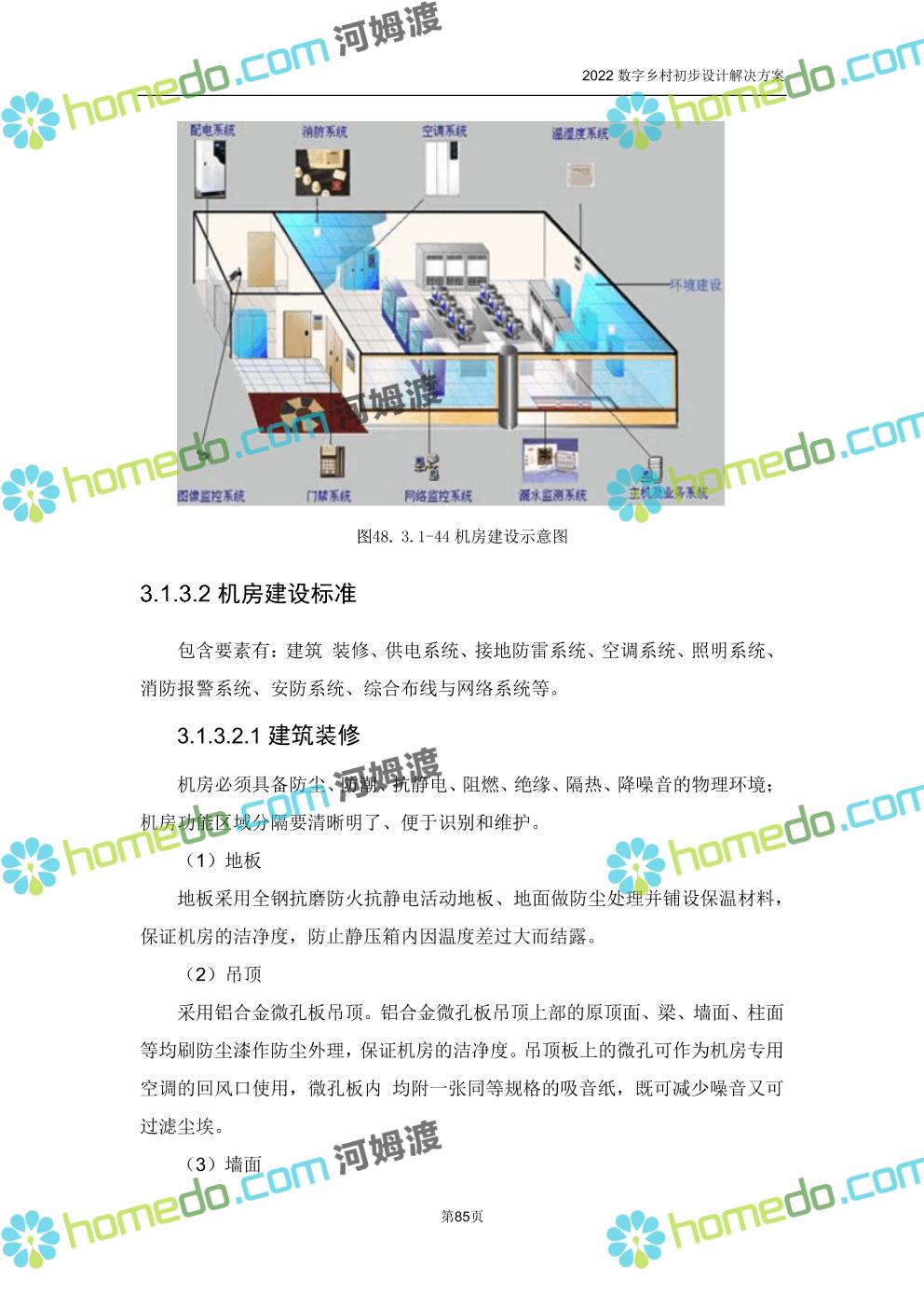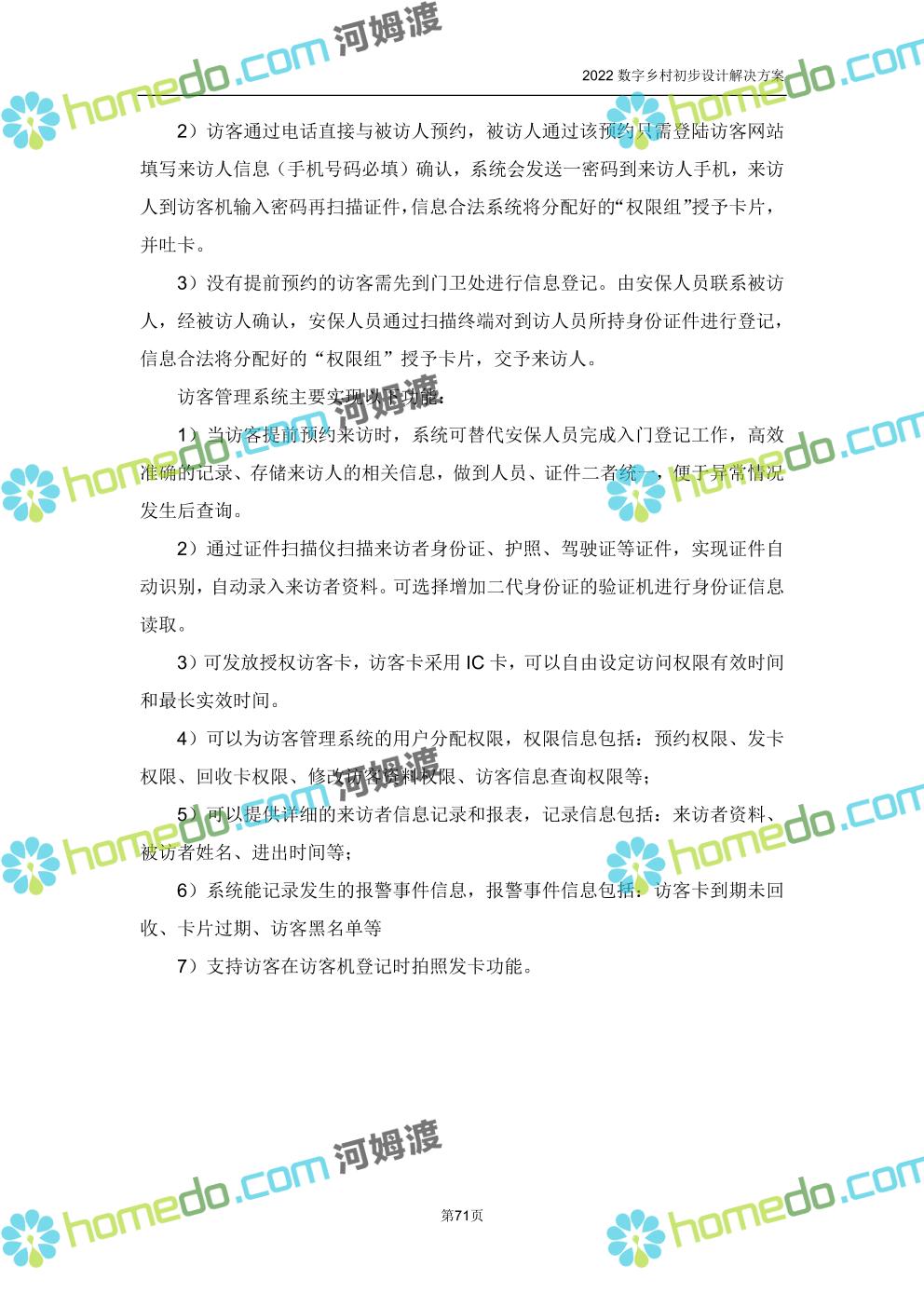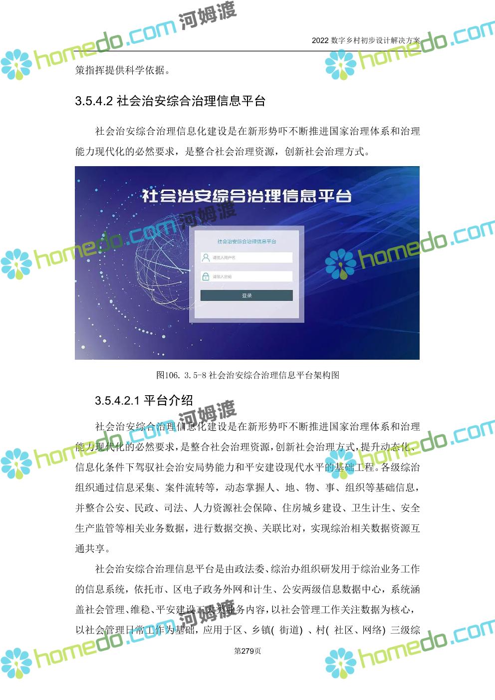 方案简介 依托全市农业农村大数据中心建设为中心,建设农业农村管理决策系统:建 设农产品全产业链监测预警系统:建设数字农业农村服务系统:建设农村人居环 境智能监测系统;建设乡村数字治理系统。 完成数字乡村信息化基础设施建设,包括前端感知设备、网络传输构建、机 房构建、数字乡村云搭建、数字乡村运营指挥中心建设。完成数字乡村管理者驾 驶舱建设,包括农业农村管理决策系统、数字乡村运营系统。完成数字乡村会客 厅建设。完成数字农业农村系统建设,完成数字农业农村服务系统建设。完成农 村人居环境智能监测系统建设。完成基础数据资源建设,完成数字乡村四大体系 建设。