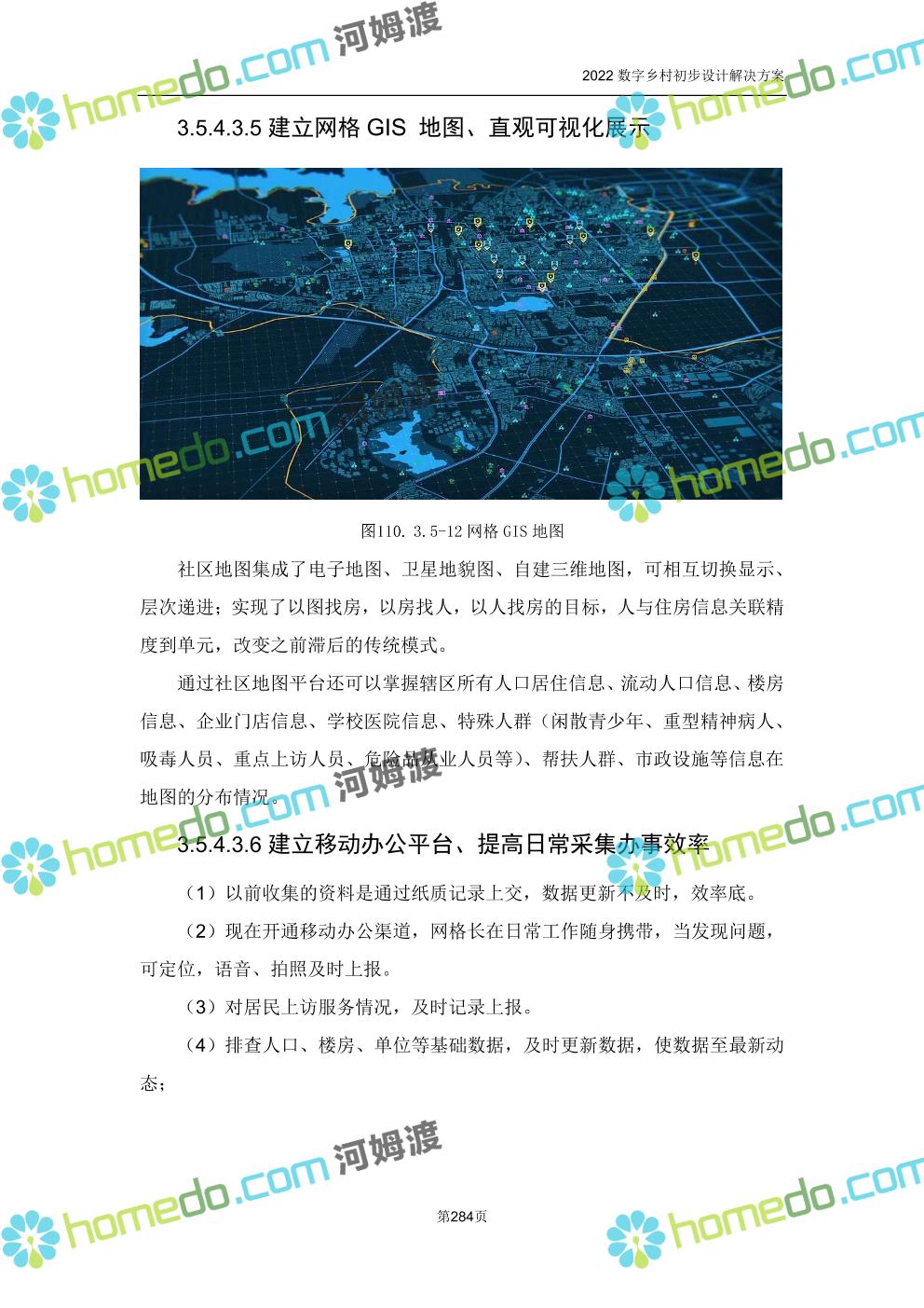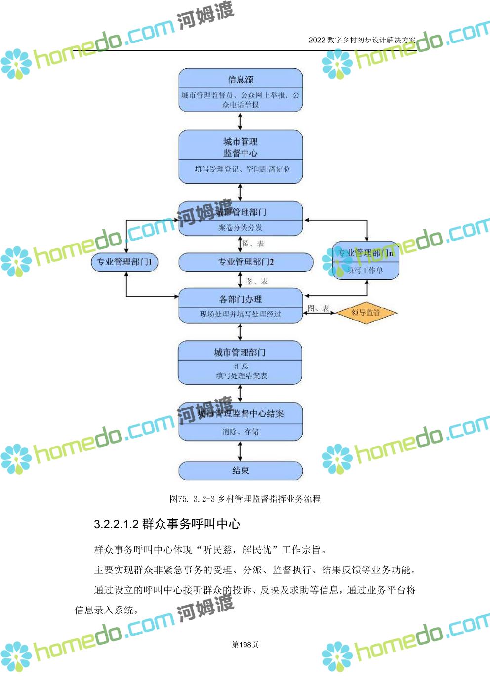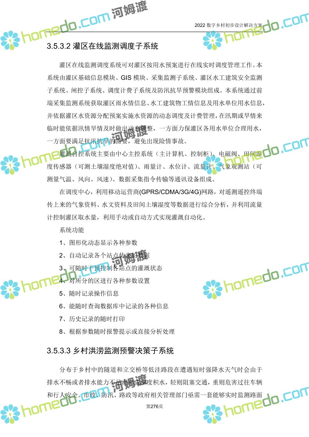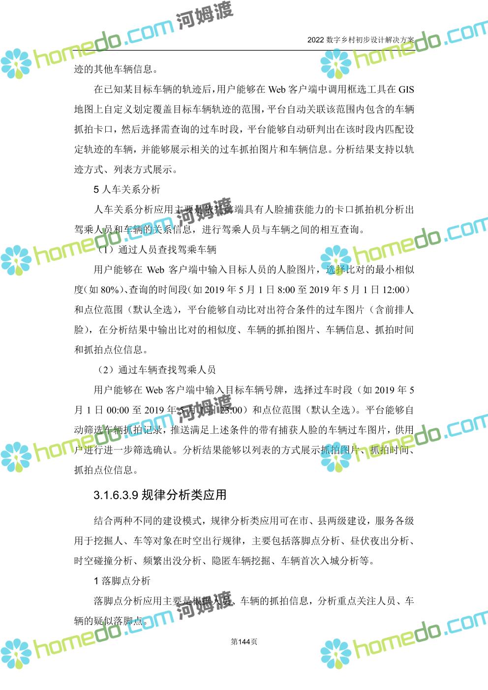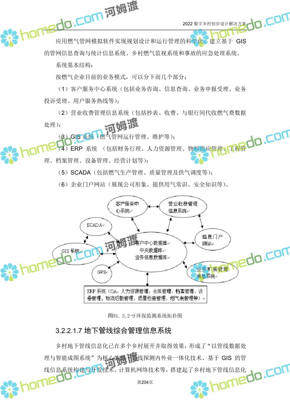 方案简介 依托全市农业农村大数据中心建设为中心,建设农业农村管理决策系统:建 设农产品全产业链监测预警系统:建设数字农业农村服务系统:建设农村人居环 境智能监测系统;建设乡村数字治理系统。 完成数字乡村信息化基础设施建设,包括前端感知设备、网络传输构建、机 房构建、数字乡村云搭建、数字乡村运营指挥中心建设。完成数字乡村管理者驾 驶舱建设,包括农业农村管理决策系统、数字乡村运营系统。完成数字乡村会客 厅建设。完成数字农业农村系统建设,完成数字农业农村服务系统建设。完成农 村人居环境智能监测系统建设。完成基础数据资源建设,完成数字乡村四大体系 建设。