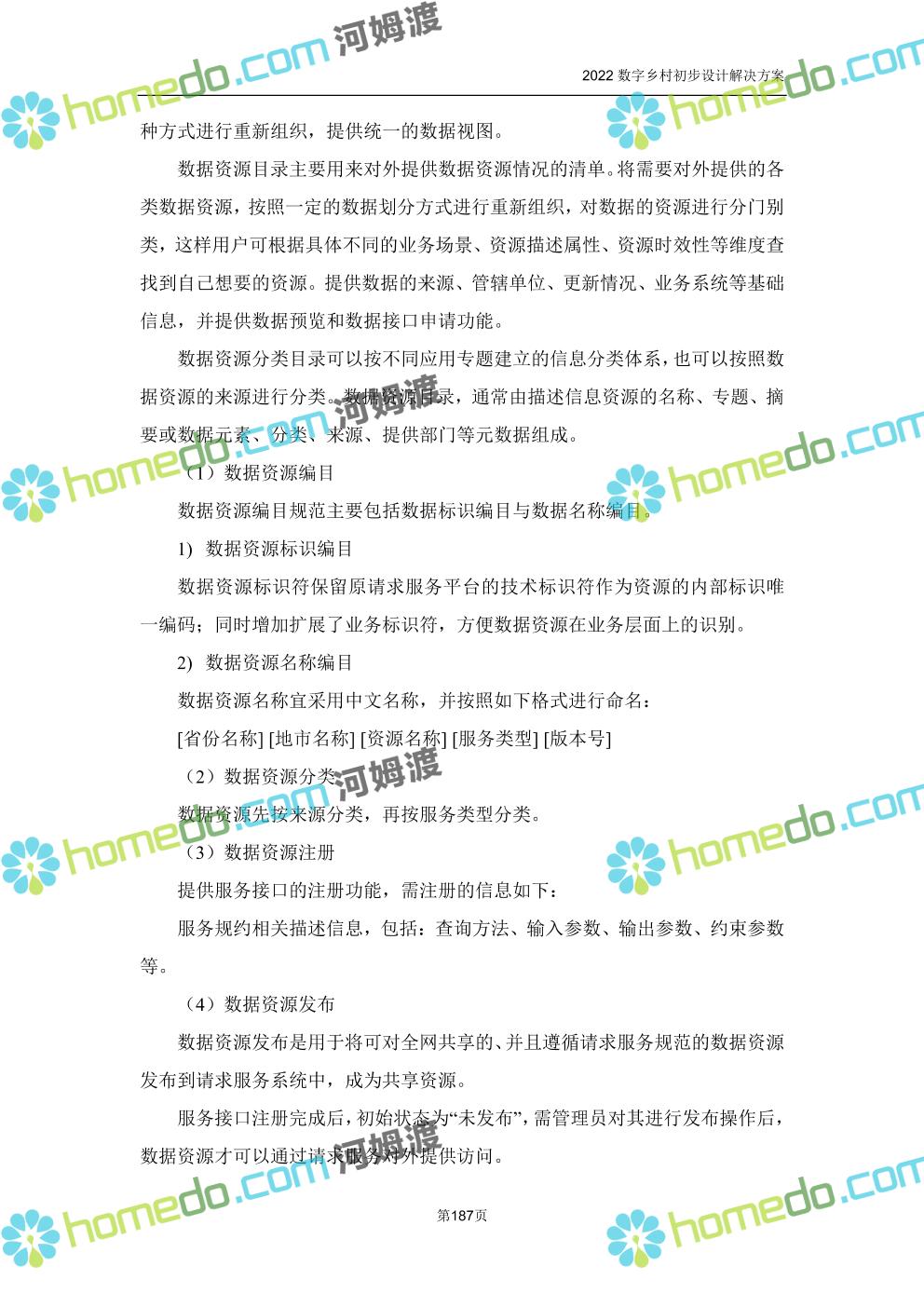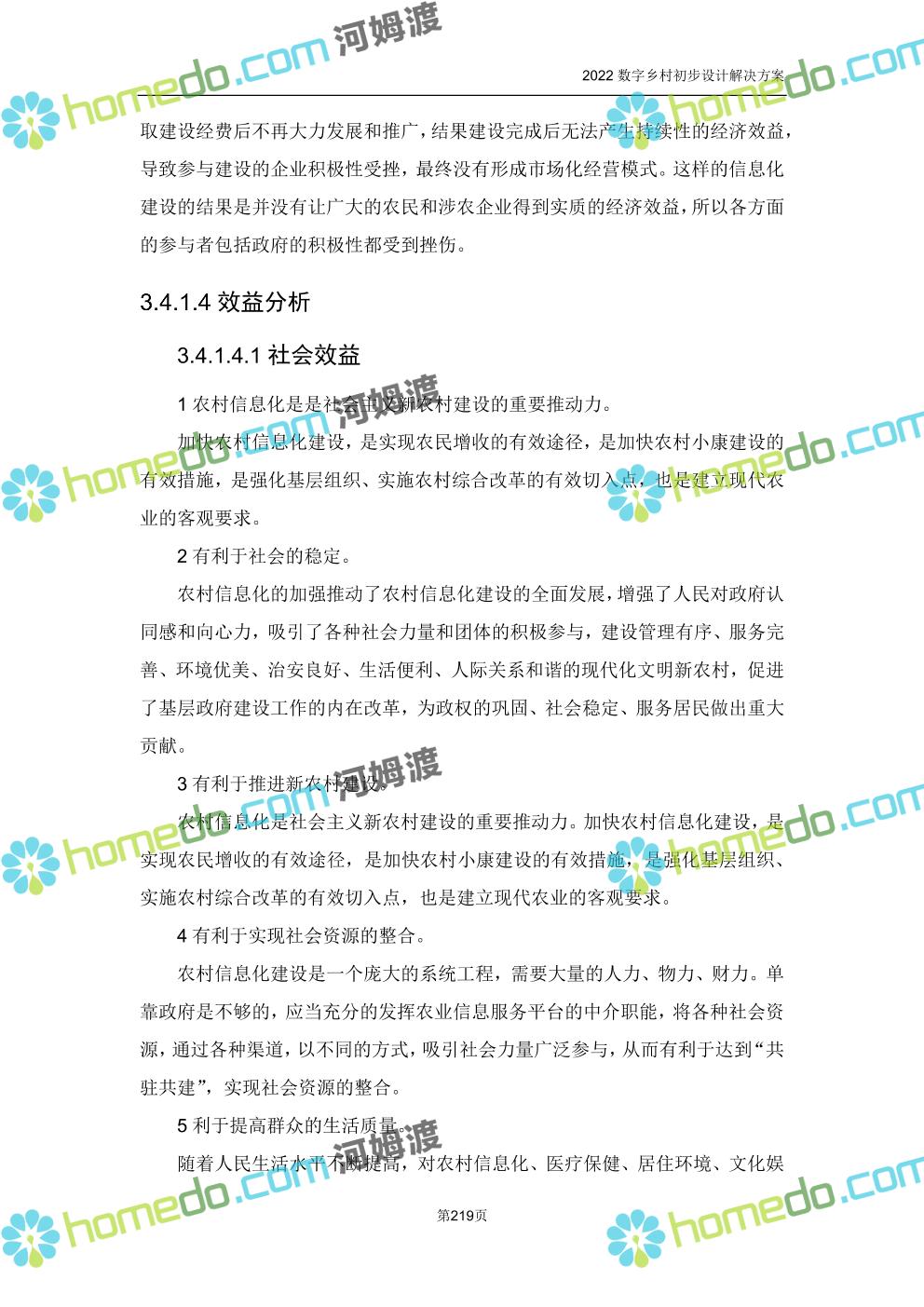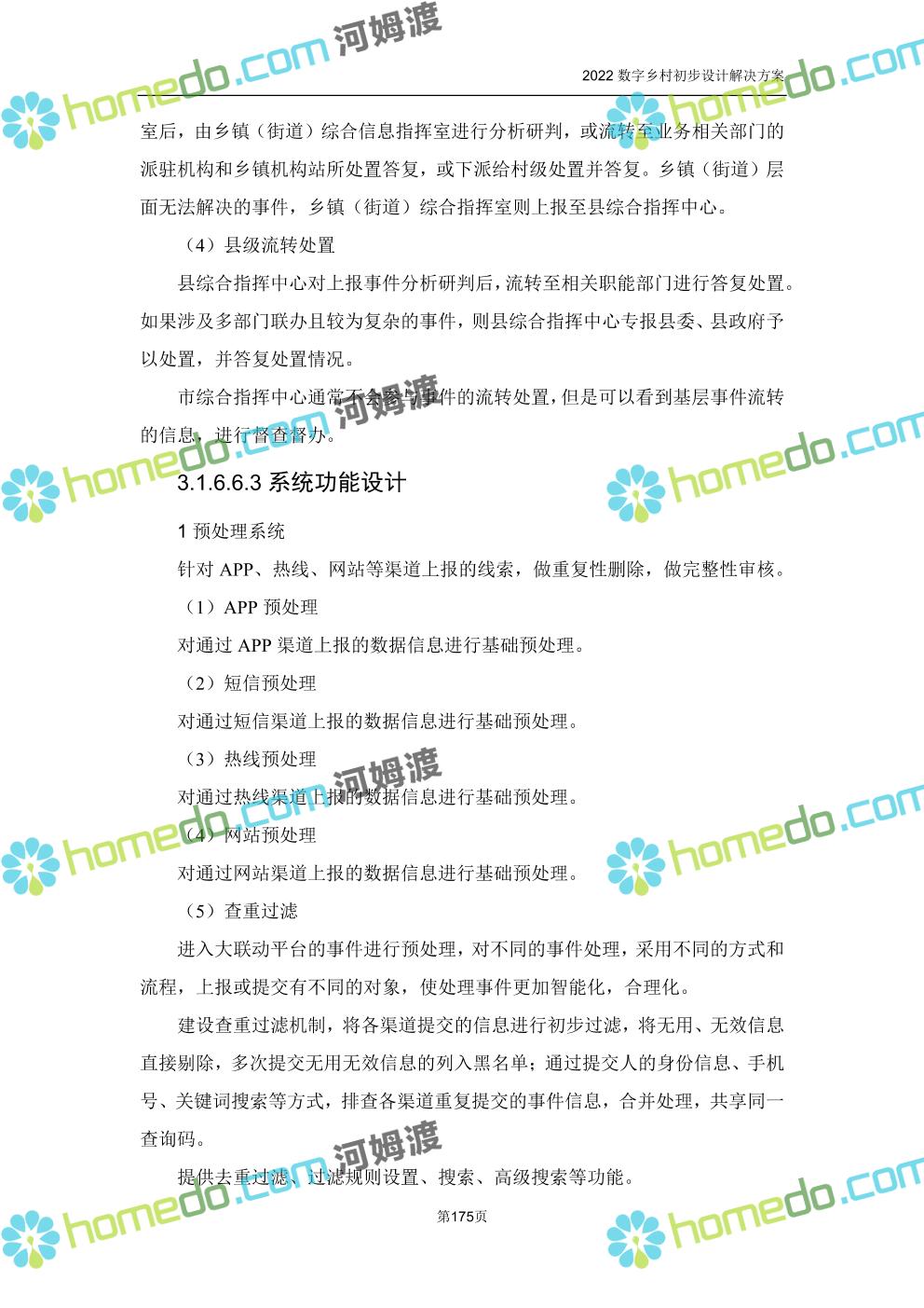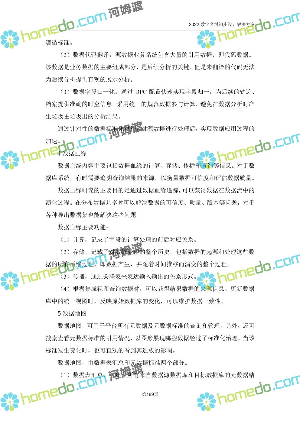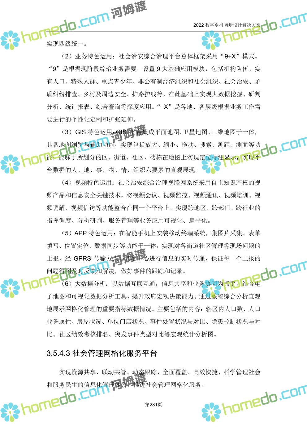 方案简介 依托全市农业农村大数据中心建设为中心,建设农业农村管理决策系统:建 设农产品全产业链监测预警系统:建设数字农业农村服务系统:建设农村人居环 境智能监测系统;建设乡村数字治理系统。 完成数字乡村信息化基础设施建设,包括前端感知设备、网络传输构建、机 房构建、数字乡村云搭建、数字乡村运营指挥中心建设。完成数字乡村管理者驾 驶舱建设,包括农业农村管理决策系统、数字乡村运营系统。完成数字乡村会客 厅建设。完成数字农业农村系统建设,完成数字农业农村服务系统建设。完成农 村人居环境智能监测系统建设。完成基础数据资源建设,完成数字乡村四大体系 建设。