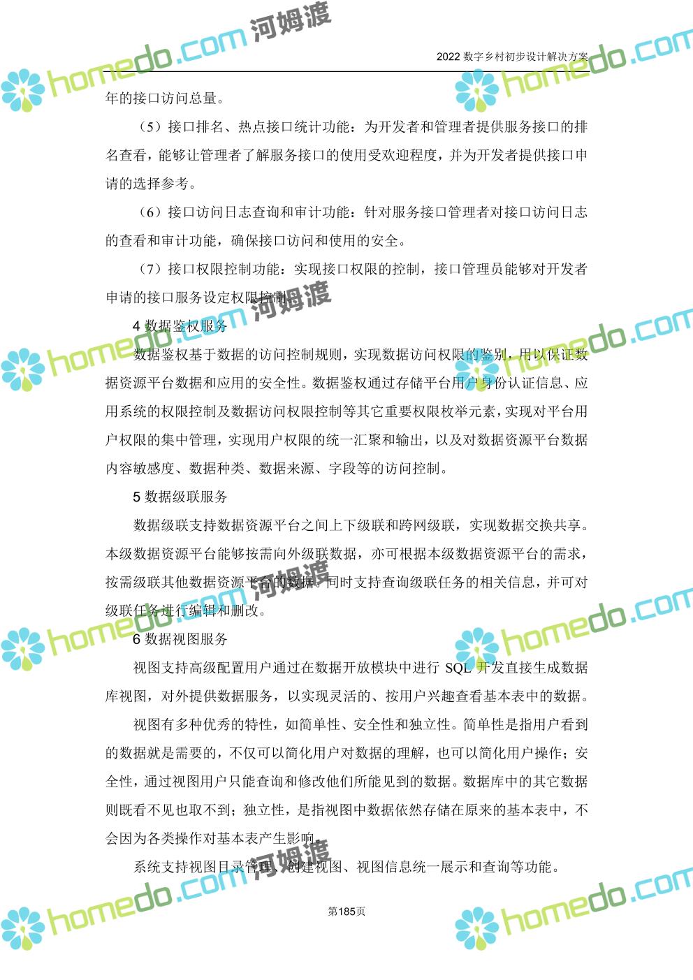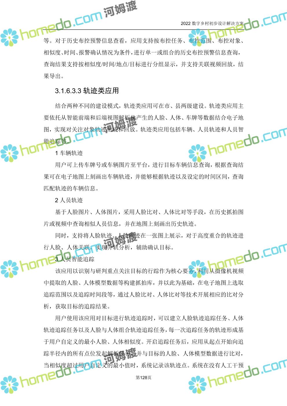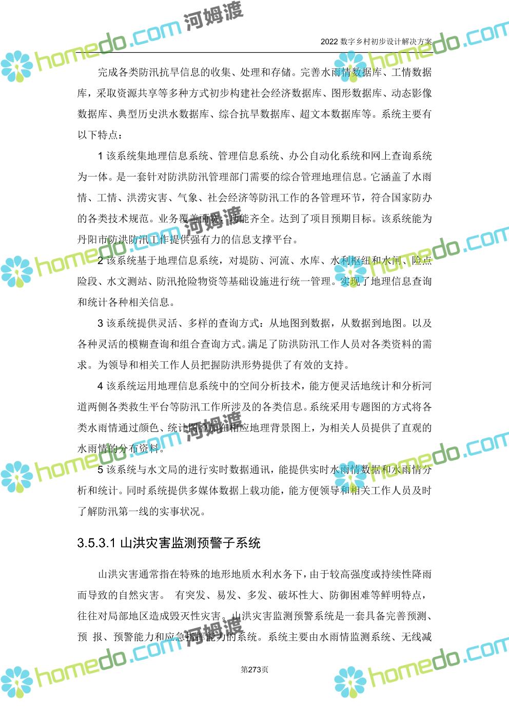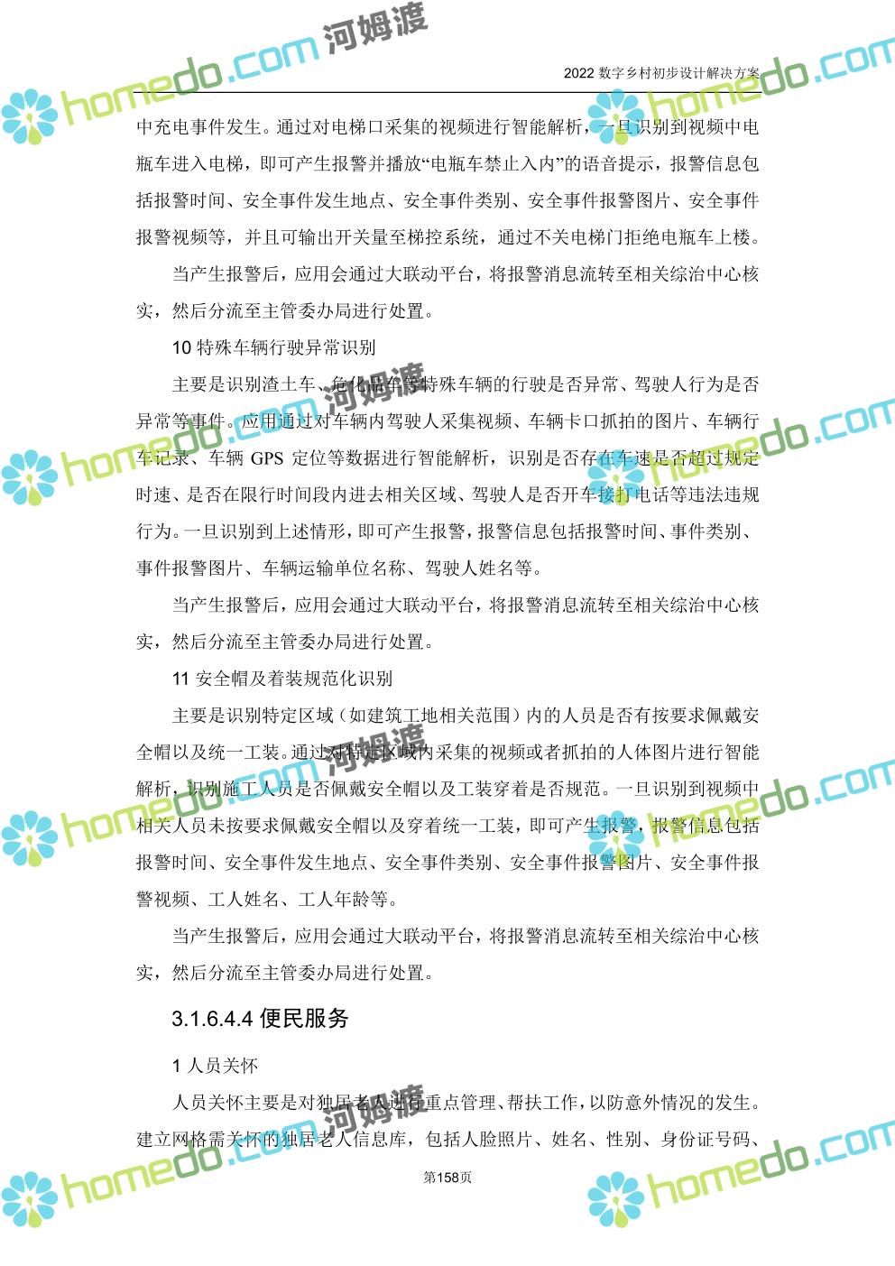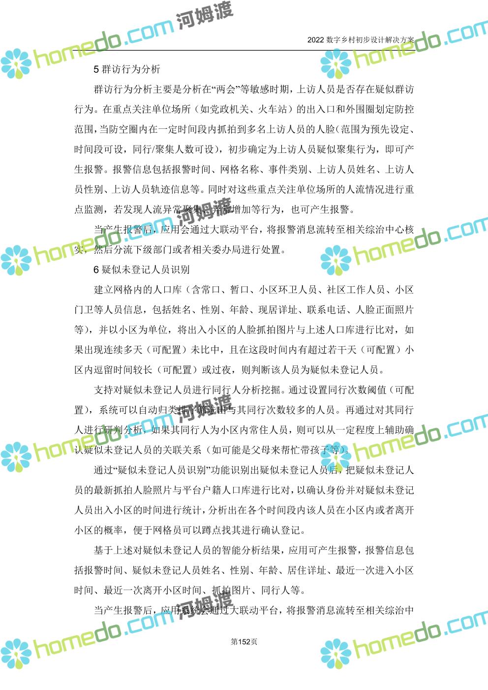 方案简介 依托全市农业农村大数据中心建设为中心,建设农业农村管理决策系统:建 设农产品全产业链监测预警系统:建设数字农业农村服务系统:建设农村人居环 境智能监测系统;建设乡村数字治理系统。 完成数字乡村信息化基础设施建设,包括前端感知设备、网络传输构建、机 房构建、数字乡村云搭建、数字乡村运营指挥中心建设。完成数字乡村管理者驾 驶舱建设,包括农业农村管理决策系统、数字乡村运营系统。完成数字乡村会客 厅建设。完成数字农业农村系统建设,完成数字农业农村服务系统建设。完成农 村人居环境智能监测系统建设。完成基础数据资源建设,完成数字乡村四大体系 建设。