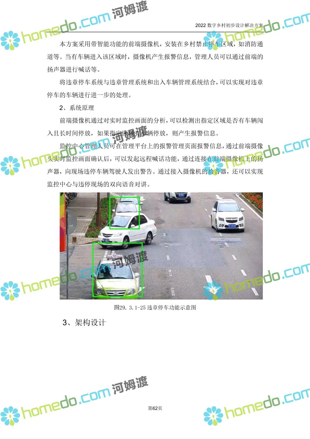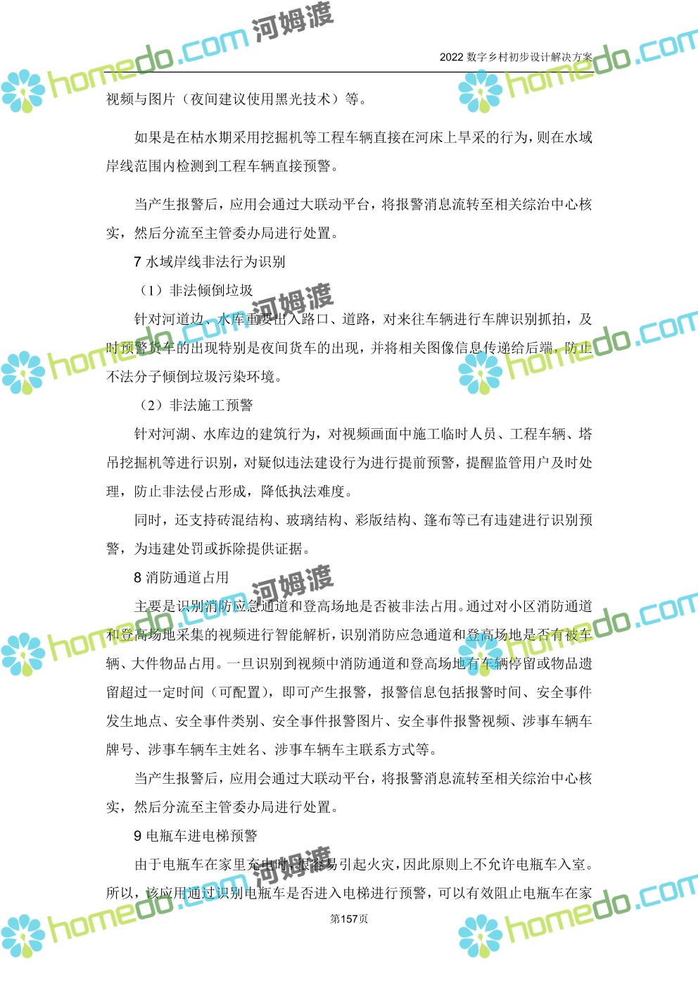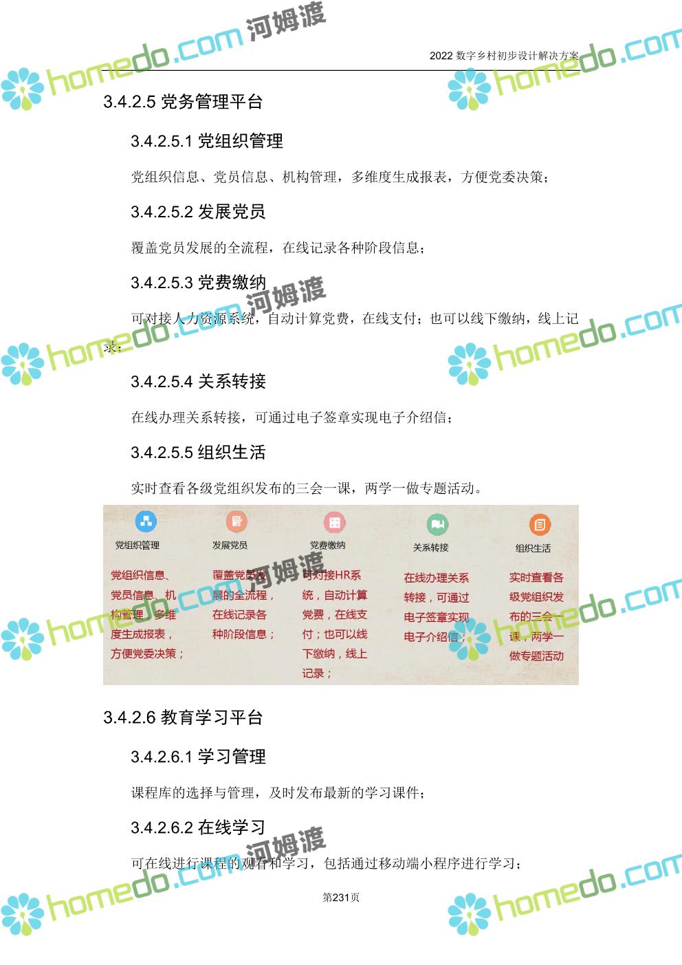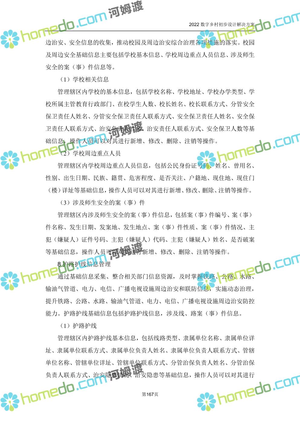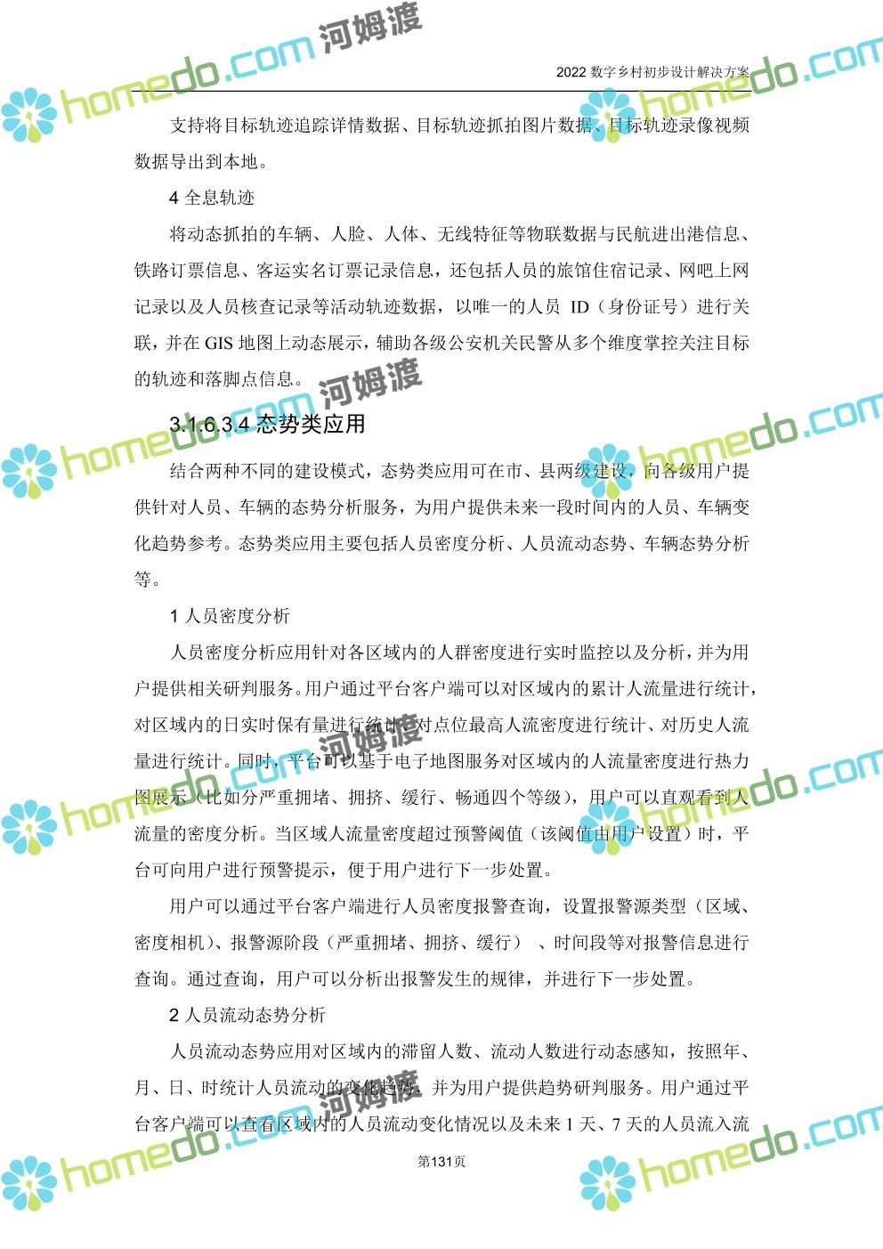 方案简介 依托全市农业农村大数据中心建设为中心,建设农业农村管理决策系统:建 设农产品全产业链监测预警系统:建设数字农业农村服务系统:建设农村人居环 境智能监测系统;建设乡村数字治理系统。 完成数字乡村信息化基础设施建设,包括前端感知设备、网络传输构建、机 房构建、数字乡村云搭建、数字乡村运营指挥中心建设。完成数字乡村管理者驾 驶舱建设,包括农业农村管理决策系统、数字乡村运营系统。完成数字乡村会客 厅建设。完成数字农业农村系统建设,完成数字农业农村服务系统建设。完成农 村人居环境智能监测系统建设。完成基础数据资源建设,完成数字乡村四大体系 建设。