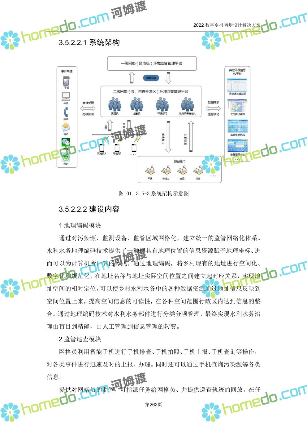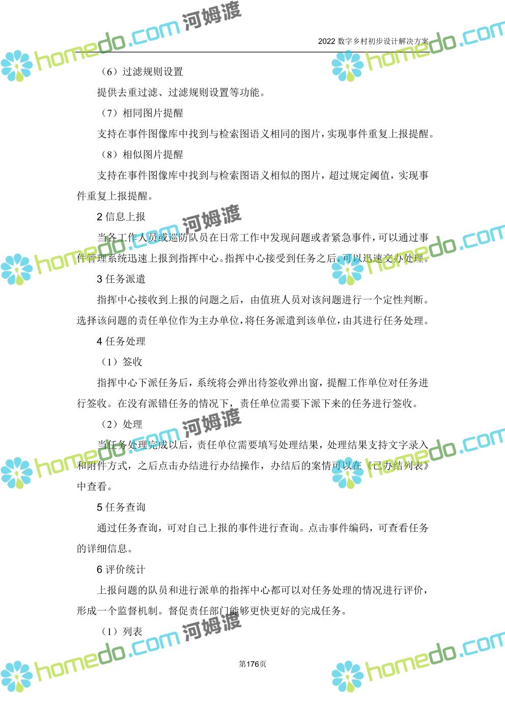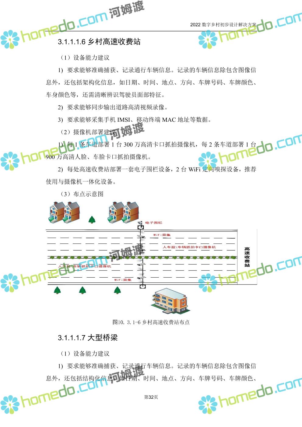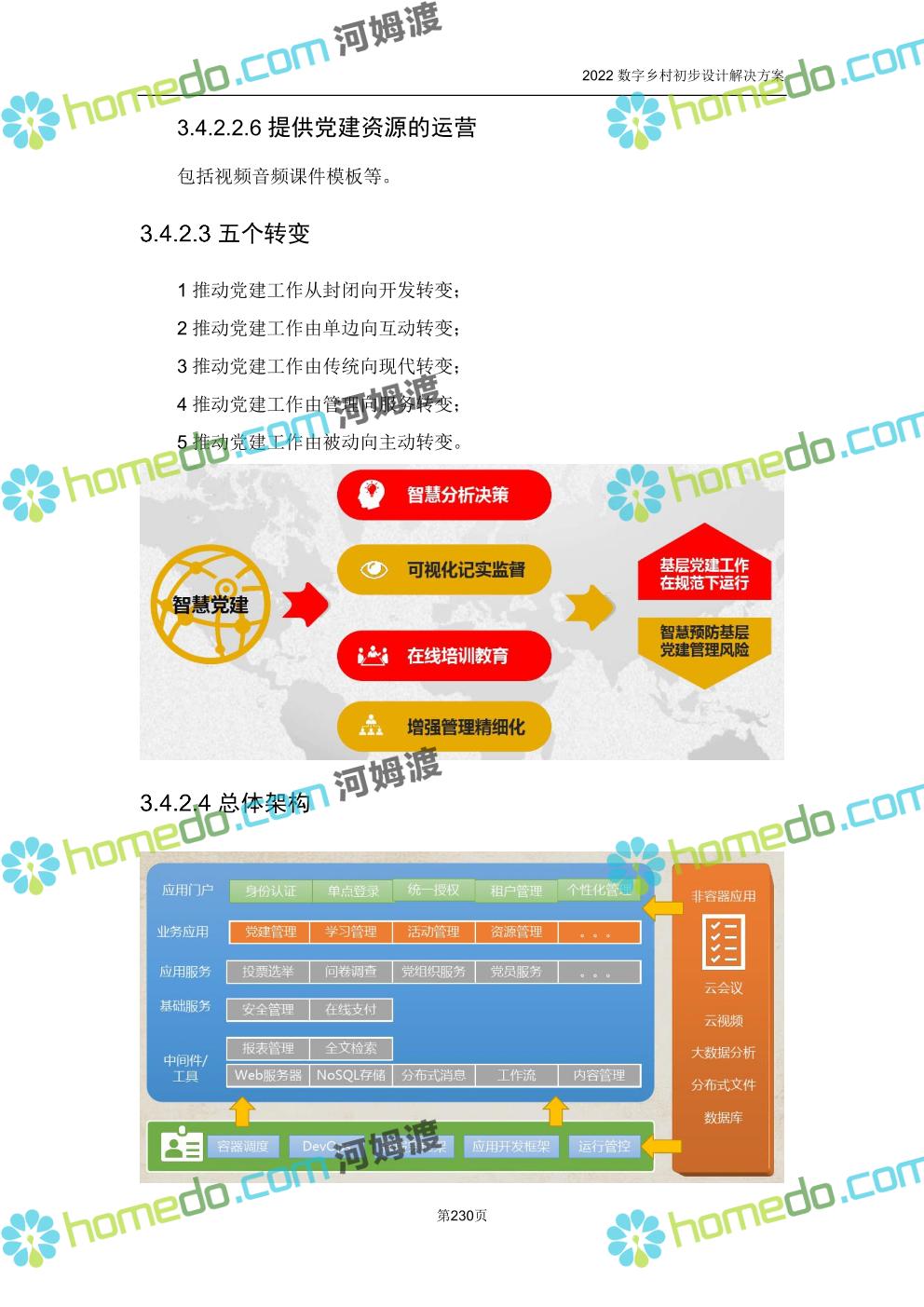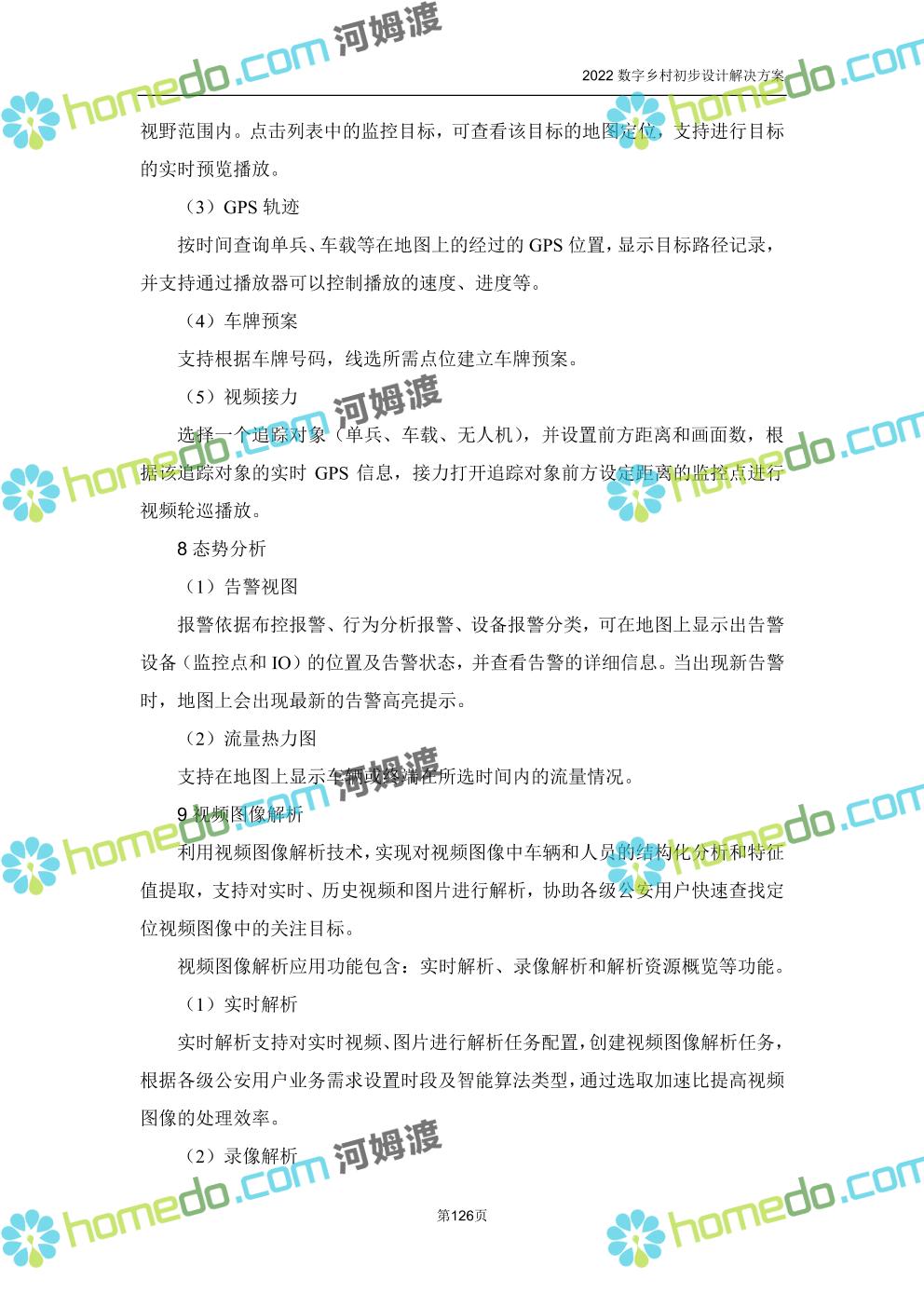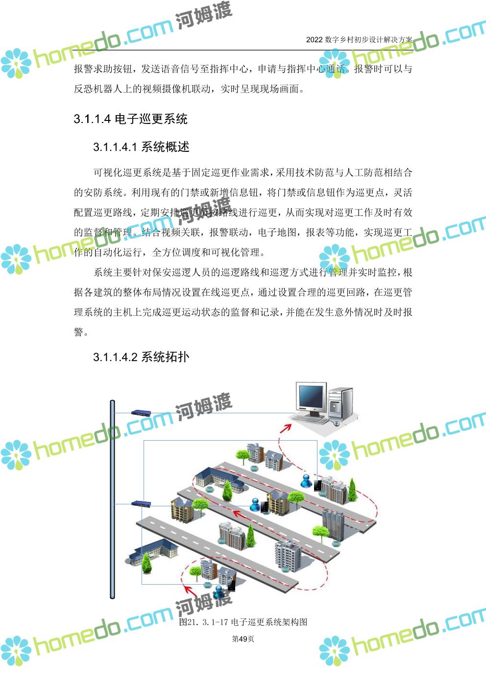 方案简介 依托全市农业农村大数据中心建设为中心,建设农业农村管理决策系统:建 设农产品全产业链监测预警系统:建设数字农业农村服务系统:建设农村人居环 境智能监测系统;建设乡村数字治理系统。 完成数字乡村信息化基础设施建设,包括前端感知设备、网络传输构建、机 房构建、数字乡村云搭建、数字乡村运营指挥中心建设。完成数字乡村管理者驾 驶舱建设,包括农业农村管理决策系统、数字乡村运营系统。完成数字乡村会客 厅建设。完成数字农业农村系统建设,完成数字农业农村服务系统建设。完成农 村人居环境智能监测系统建设。完成基础数据资源建设,完成数字乡村四大体系 建设。