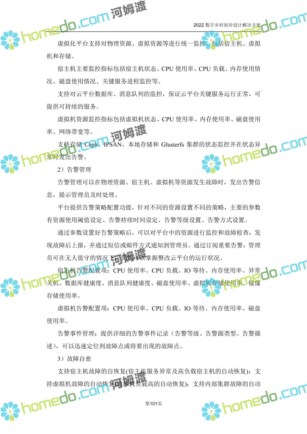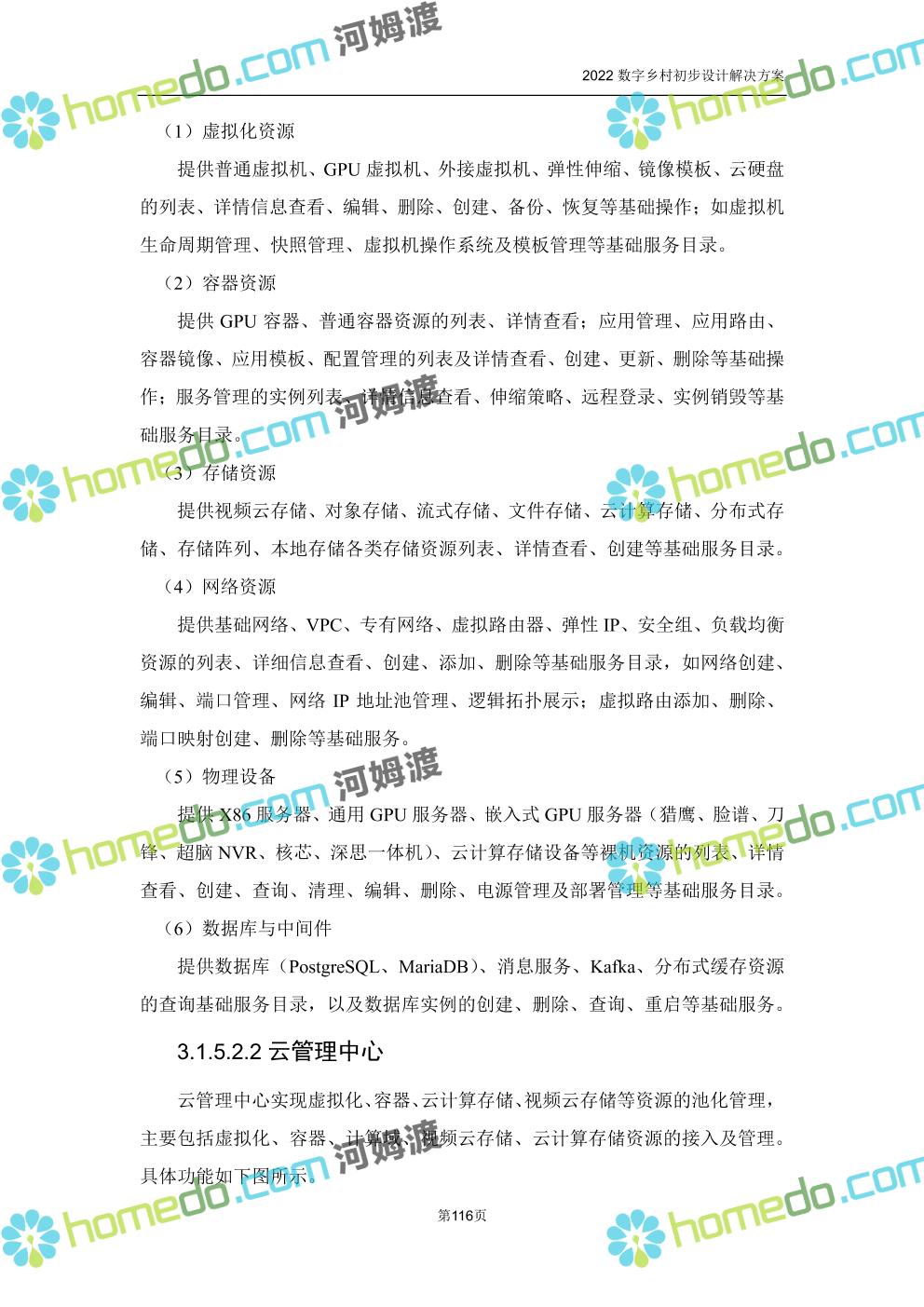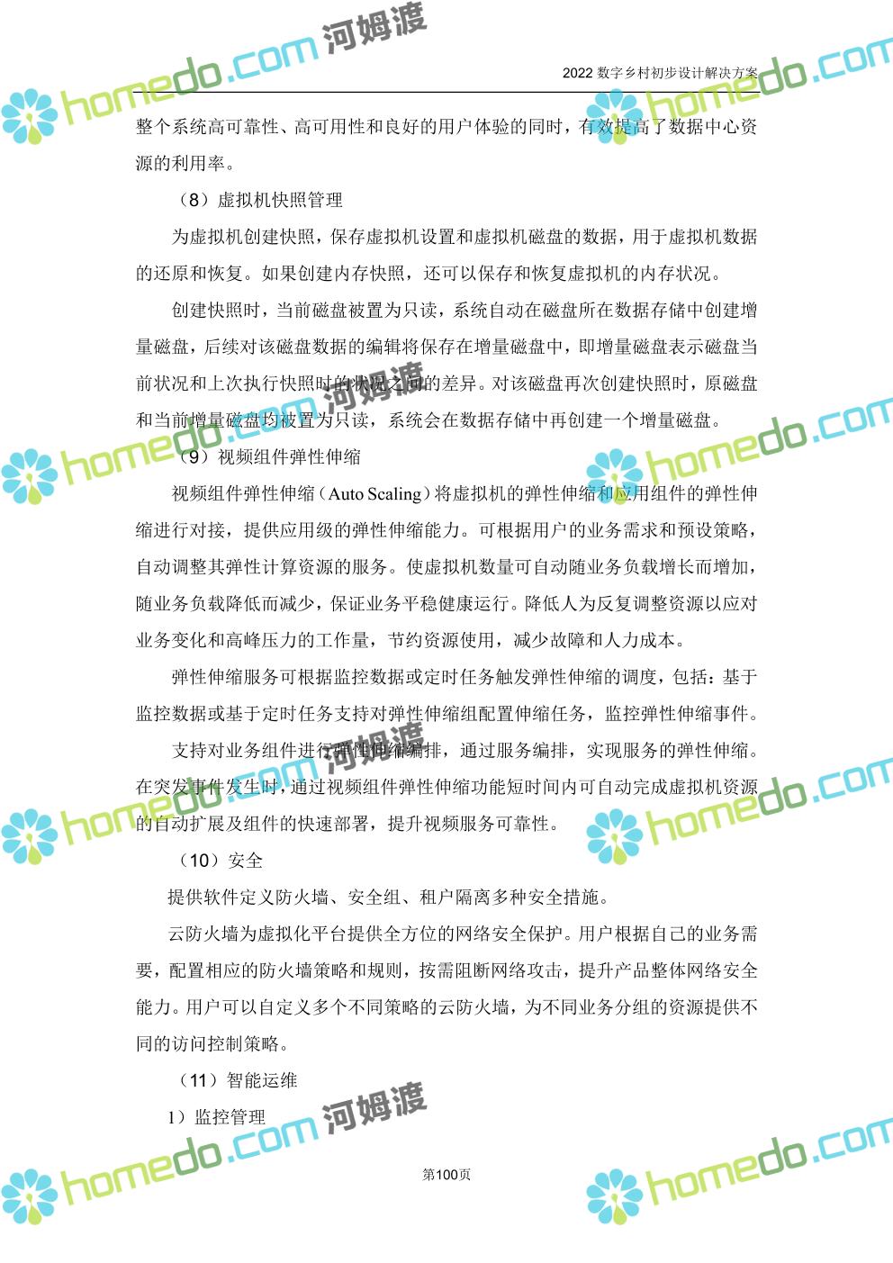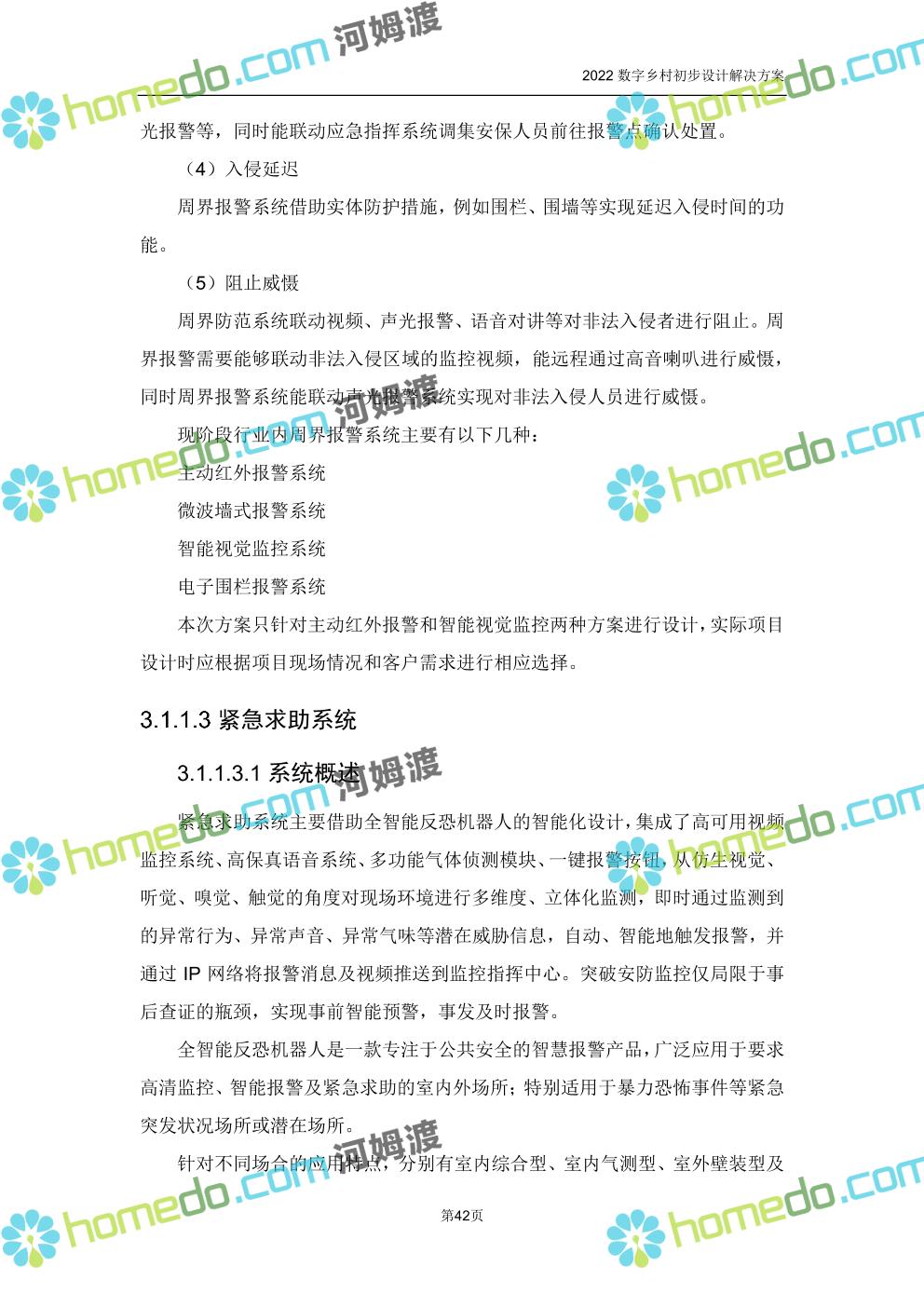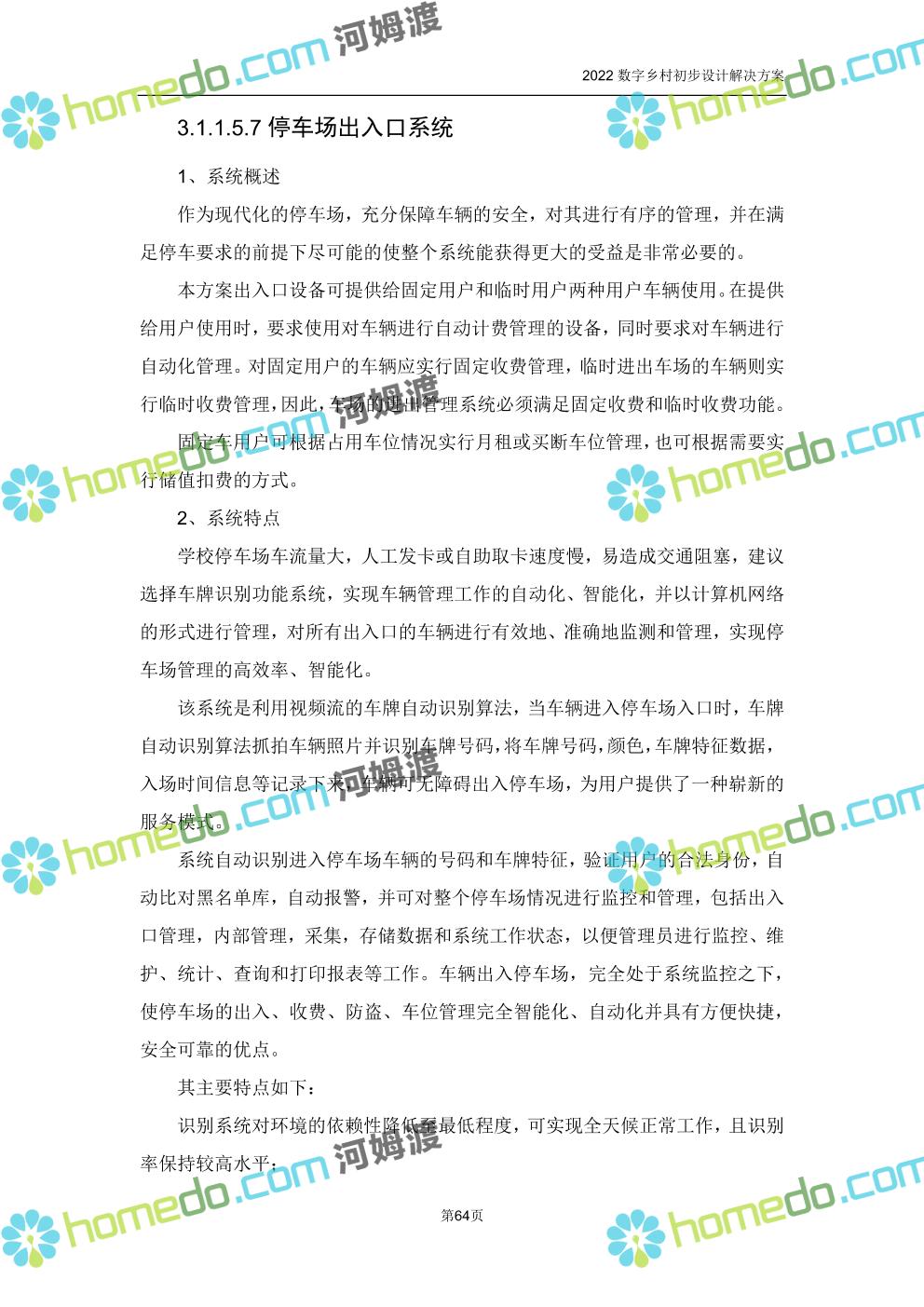 方案简介 依托全市农业农村大数据中心建设为中心,建设农业农村管理决策系统:建 设农产品全产业链监测预警系统:建设数字农业农村服务系统:建设农村人居环 境智能监测系统;建设乡村数字治理系统。 完成数字乡村信息化基础设施建设,包括前端感知设备、网络传输构建、机 房构建、数字乡村云搭建、数字乡村运营指挥中心建设。完成数字乡村管理者驾 驶舱建设,包括农业农村管理决策系统、数字乡村运营系统。完成数字乡村会客 厅建设。完成数字农业农村系统建设,完成数字农业农村服务系统建设。完成农 村人居环境智能监测系统建设。完成基础数据资源建设,完成数字乡村四大体系 建设。