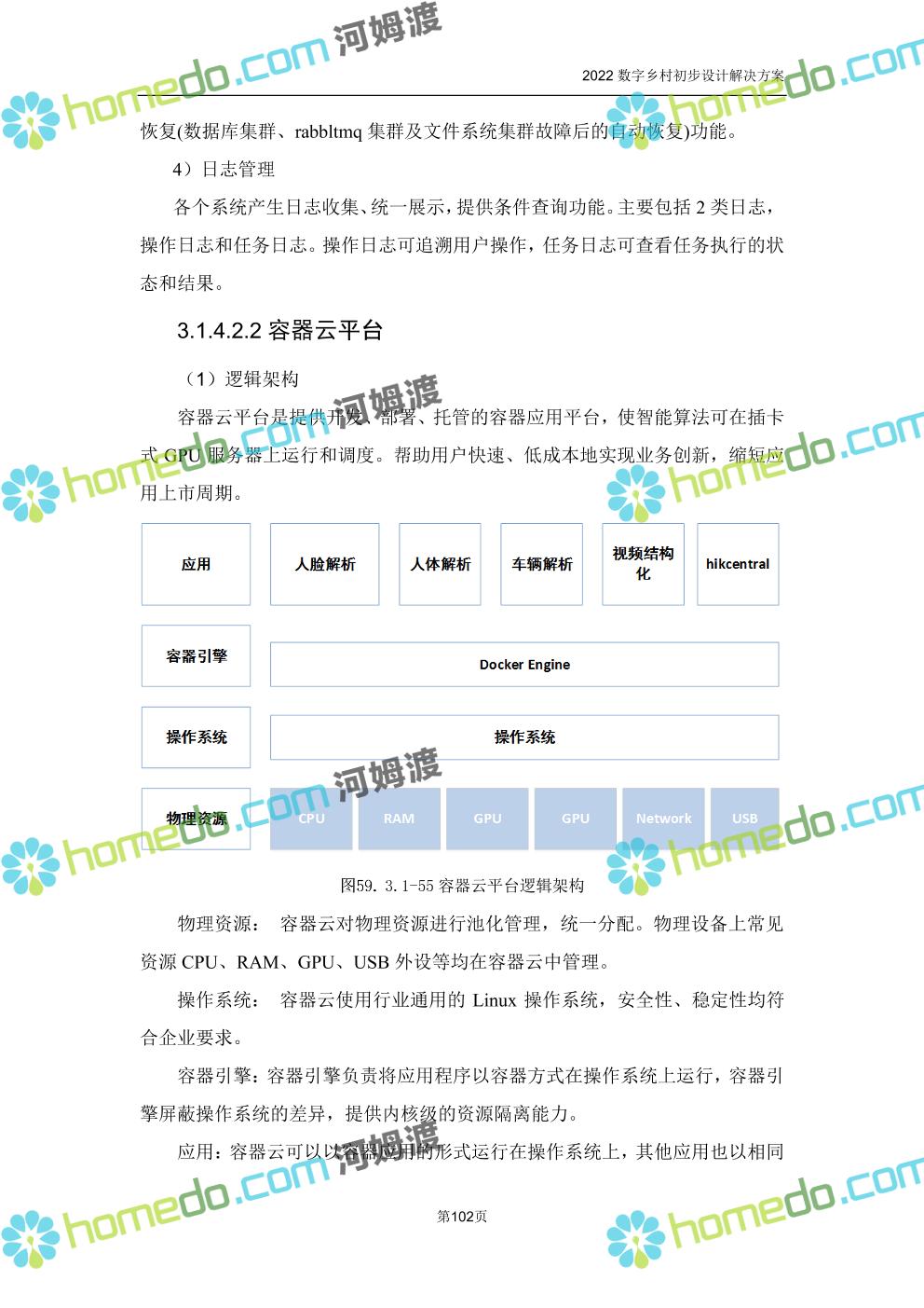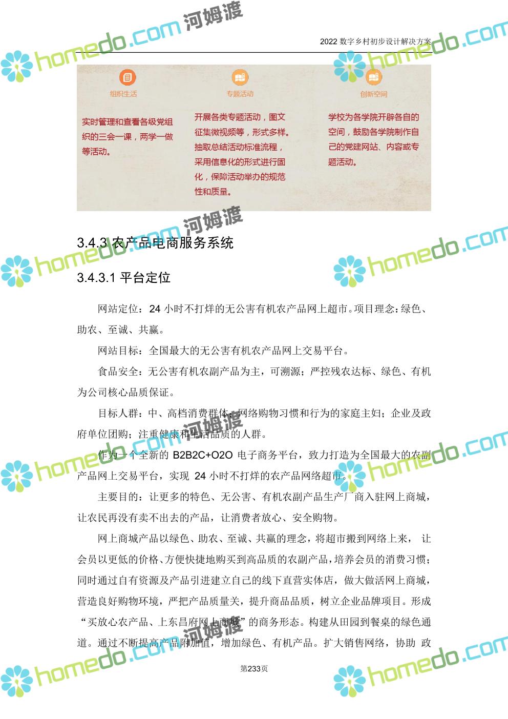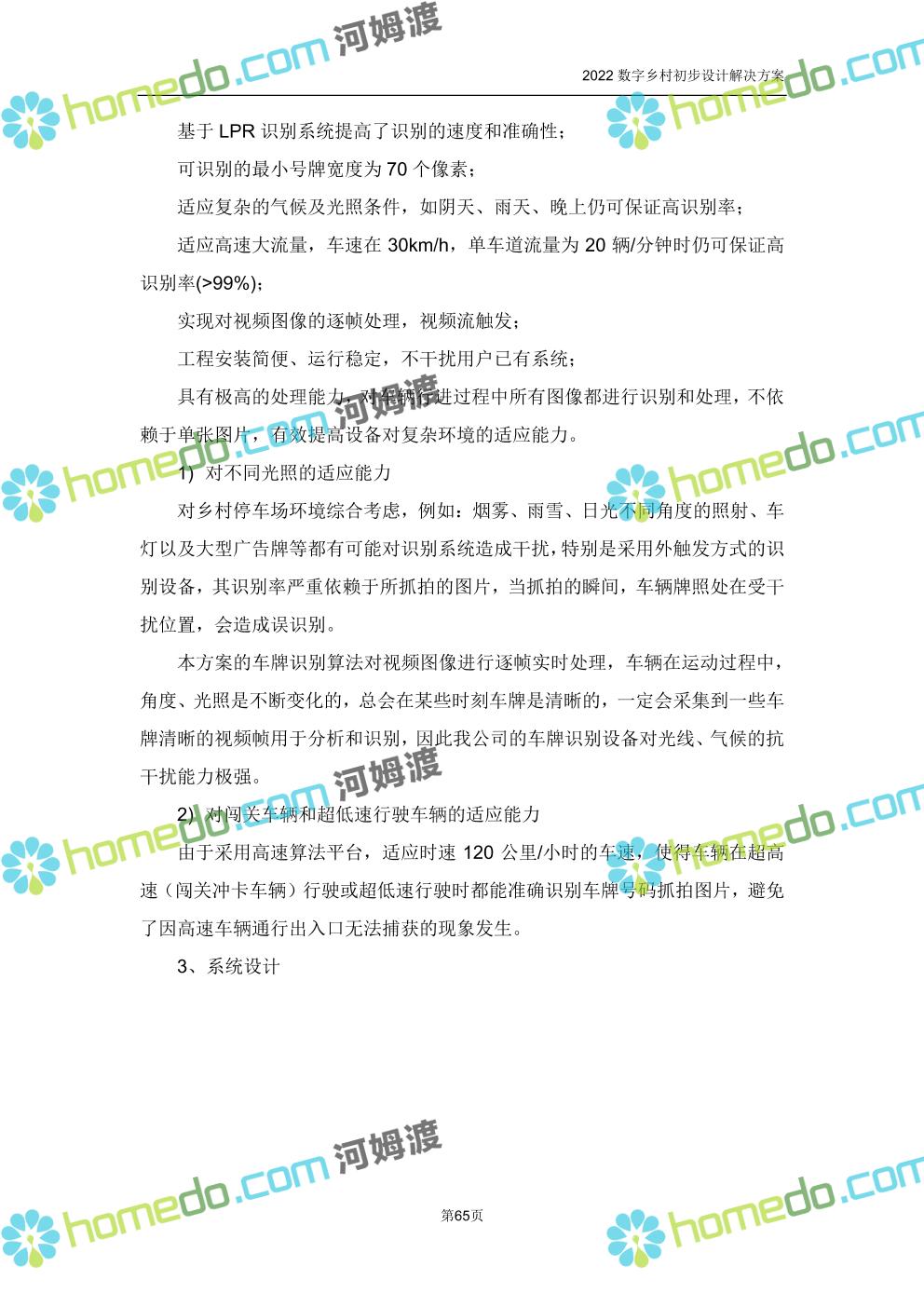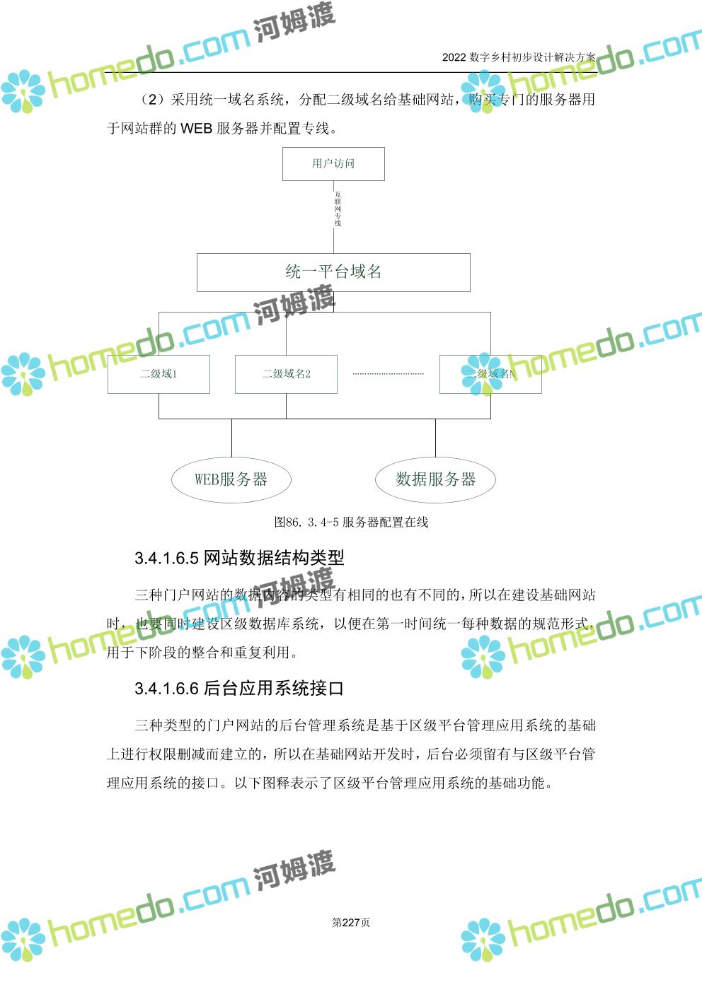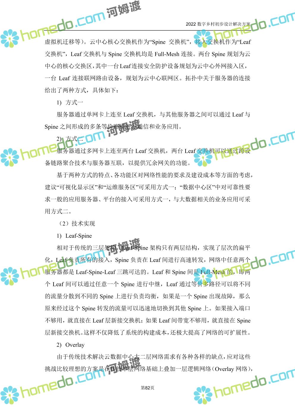 方案简介 依托全市农业农村大数据中心建设为中心,建设农业农村管理决策系统:建 设农产品全产业链监测预警系统:建设数字农业农村服务系统:建设农村人居环 境智能监测系统;建设乡村数字治理系统。 完成数字乡村信息化基础设施建设,包括前端感知设备、网络传输构建、机 房构建、数字乡村云搭建、数字乡村运营指挥中心建设。完成数字乡村管理者驾 驶舱建设,包括农业农村管理决策系统、数字乡村运营系统。完成数字乡村会客 厅建设。完成数字农业农村系统建设,完成数字农业农村服务系统建设。完成农 村人居环境智能监测系统建设。完成基础数据资源建设,完成数字乡村四大体系 建设。