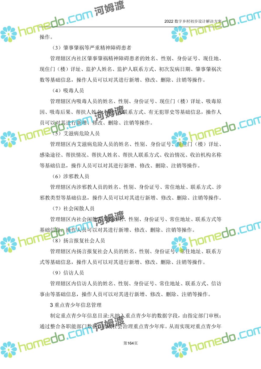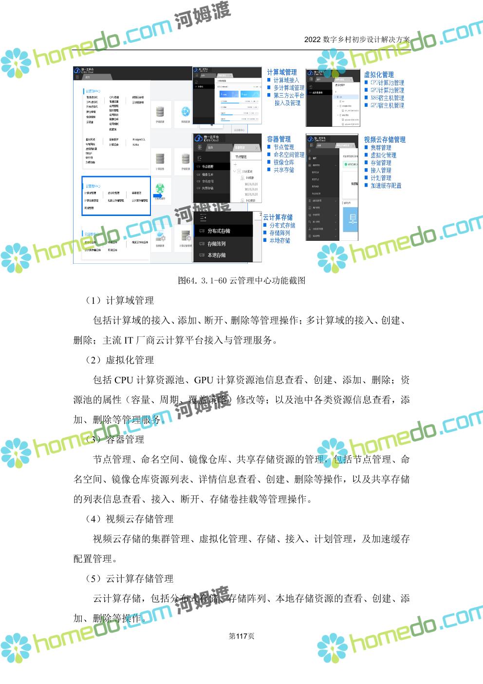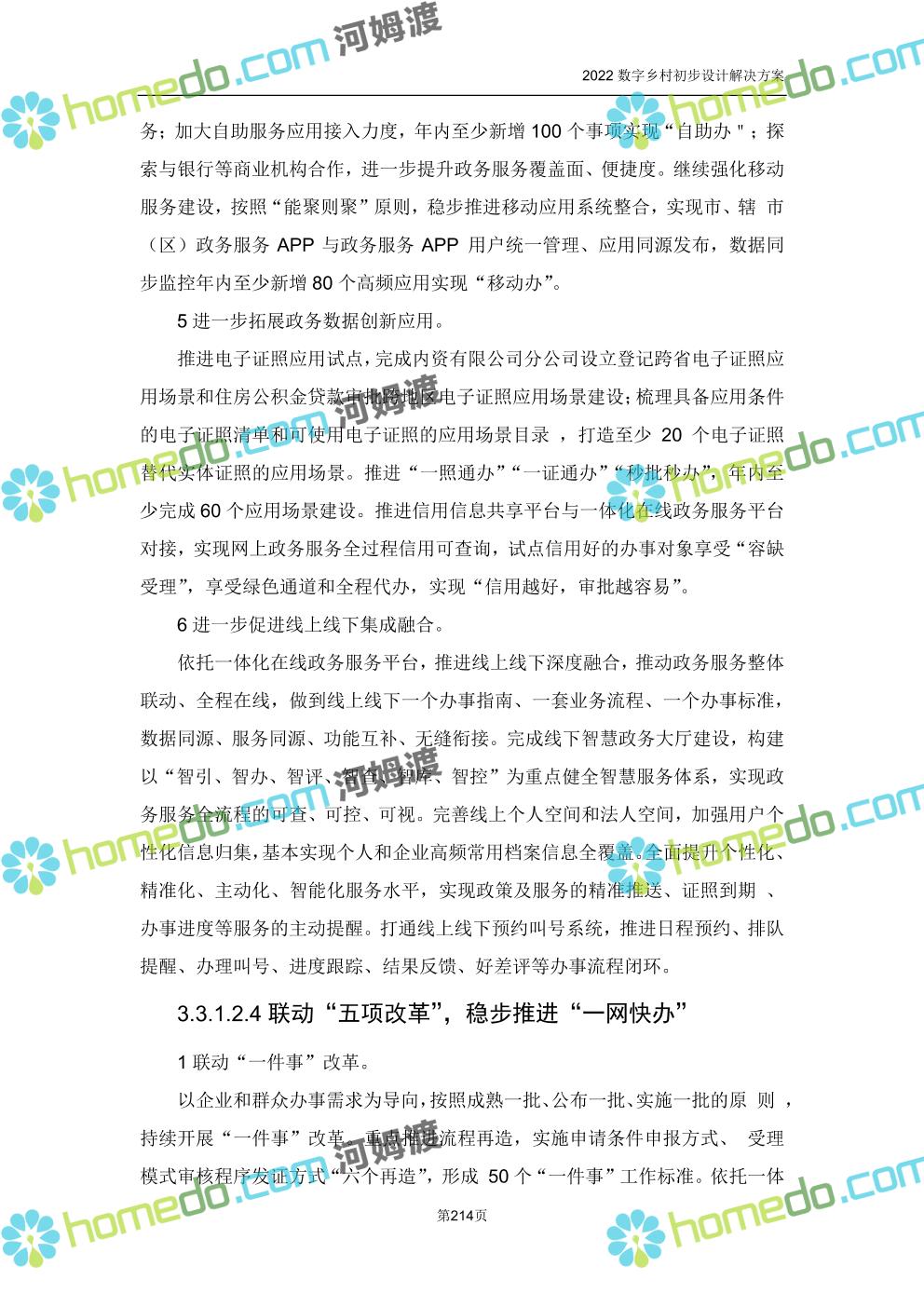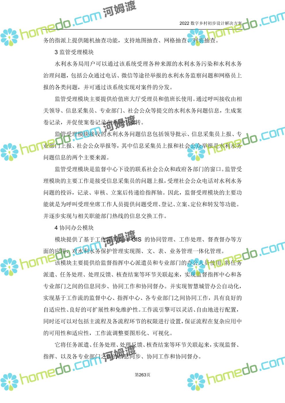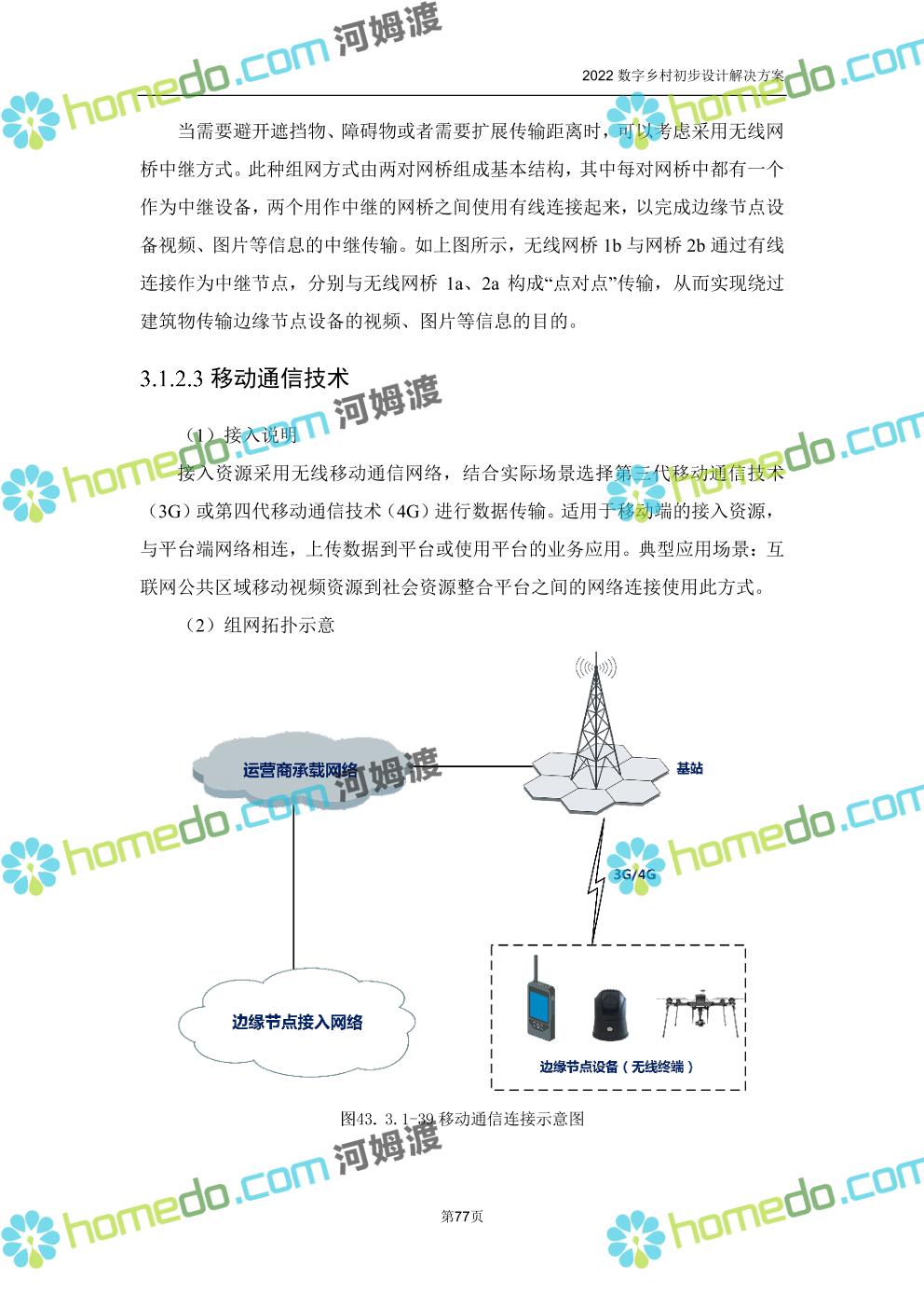 方案简介 依托全市农业农村大数据中心建设为中心,建设农业农村管理决策系统:建 设农产品全产业链监测预警系统:建设数字农业农村服务系统:建设农村人居环 境智能监测系统;建设乡村数字治理系统。 完成数字乡村信息化基础设施建设,包括前端感知设备、网络传输构建、机 房构建、数字乡村云搭建、数字乡村运营指挥中心建设。完成数字乡村管理者驾 驶舱建设,包括农业农村管理决策系统、数字乡村运营系统。完成数字乡村会客 厅建设。完成数字农业农村系统建设,完成数字农业农村服务系统建设。完成农 村人居环境智能监测系统建设。完成基础数据资源建设,完成数字乡村四大体系 建设。
