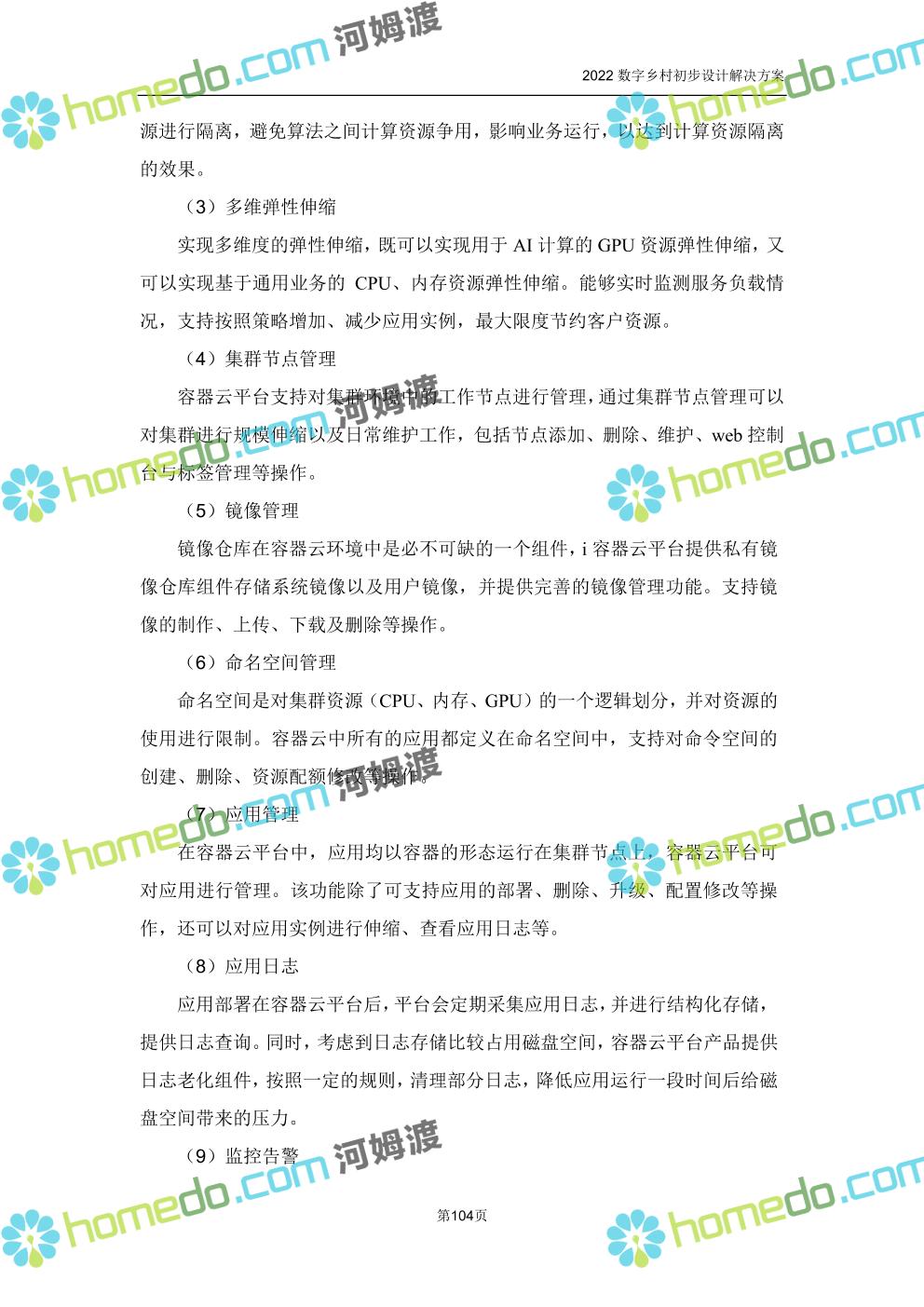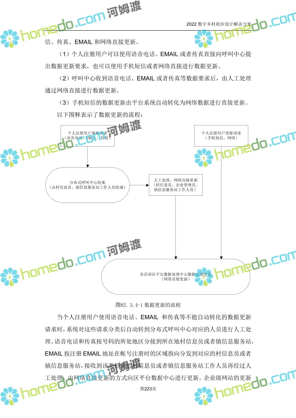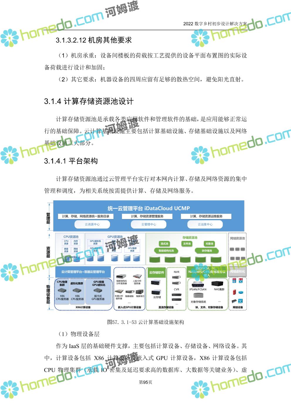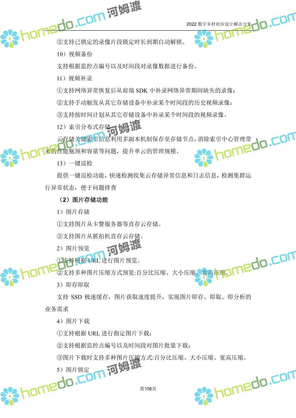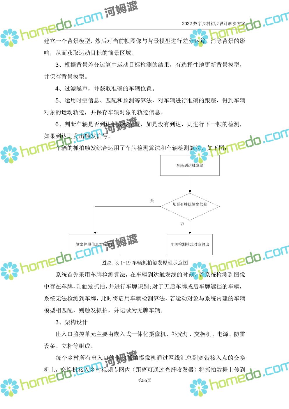 方案简介 依托全市农业农村大数据中心建设为中心,建设农业农村管理决策系统:建 设农产品全产业链监测预警系统:建设数字农业农村服务系统:建设农村人居环 境智能监测系统;建设乡村数字治理系统。 完成数字乡村信息化基础设施建设,包括前端感知设备、网络传输构建、机 房构建、数字乡村云搭建、数字乡村运营指挥中心建设。完成数字乡村管理者驾 驶舱建设,包括农业农村管理决策系统、数字乡村运营系统。完成数字乡村会客 厅建设。完成数字农业农村系统建设,完成数字农业农村服务系统建设。完成农 村人居环境智能监测系统建设。完成基础数据资源建设,完成数字乡村四大体系 建设。