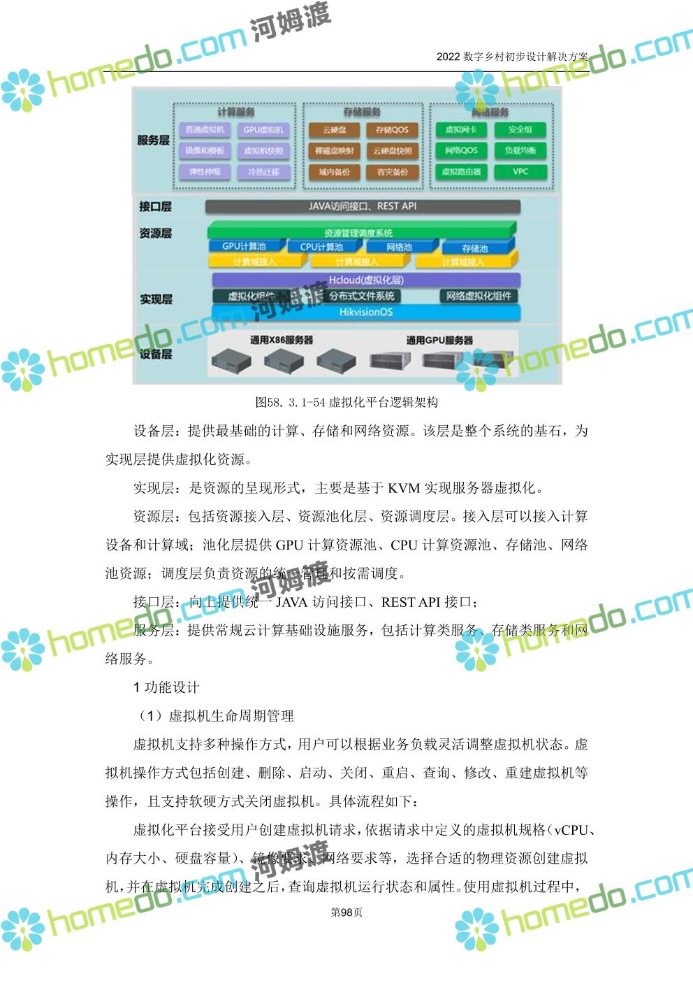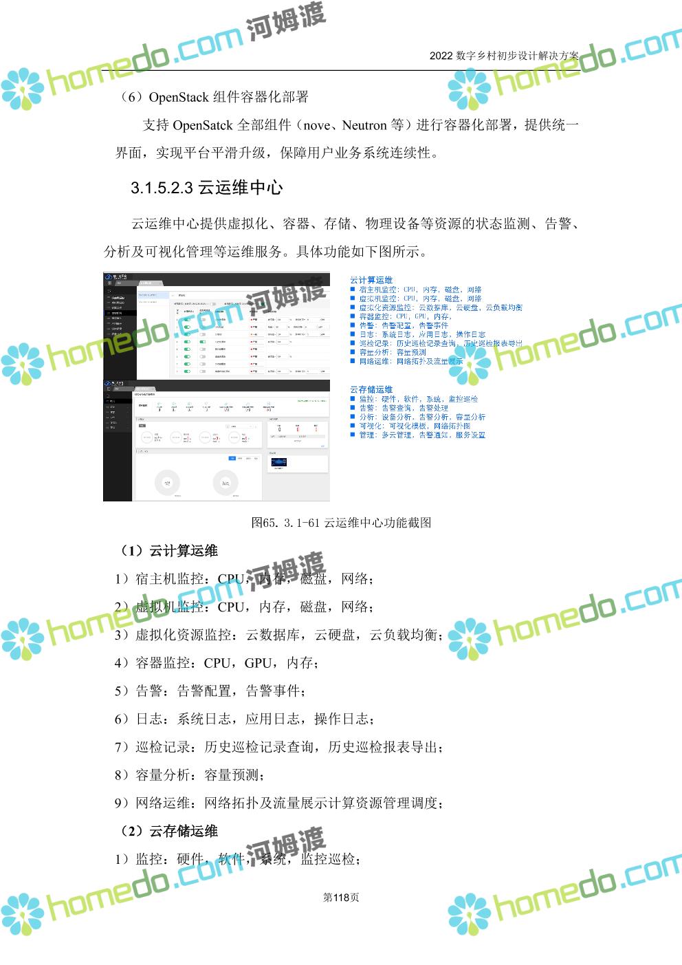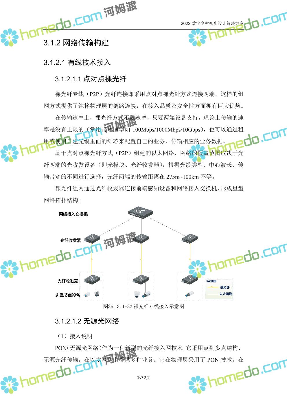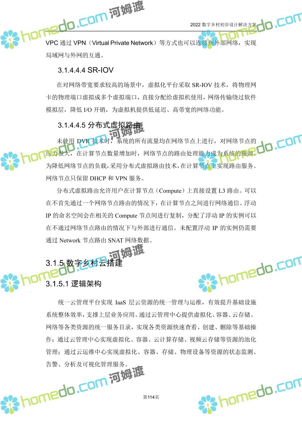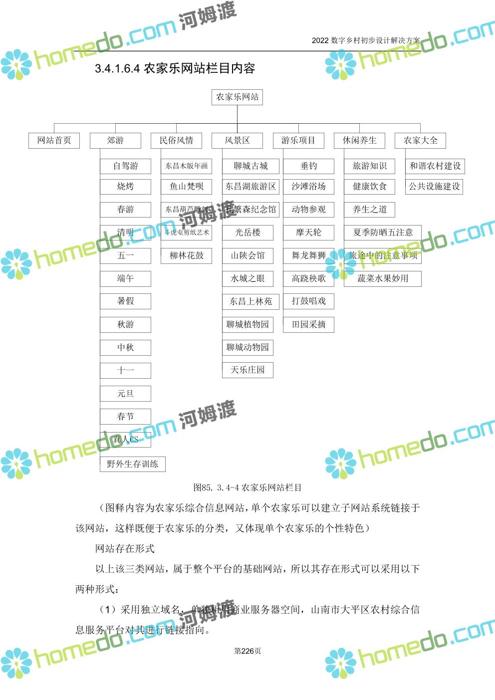方案简介 依托全市农业农村大数据中心建设为中心,建设农业农村管理决策系统:建 设农产品全产业链监测预警系统:建设数字农业农村服务系统:建设农村人居环 境智能监测系统;建设乡村数字治理系统。 完成数字乡村信息化基础设施建设,包括前端感知设备、网络传输构建、机 房构建、数字乡村云搭建、数字乡村运营指挥中心建设。完成数字乡村管理者驾 驶舱建设,包括农业农村管理决策系统、数字乡村运营系统。完成数字乡村会客 厅建设。完成数字农业农村系统建设,完成数字农业农村服务系统建设。完成农 村人居环境智能监测系统建设。完成基础数据资源建设,完成数字乡村四大体系 建设。