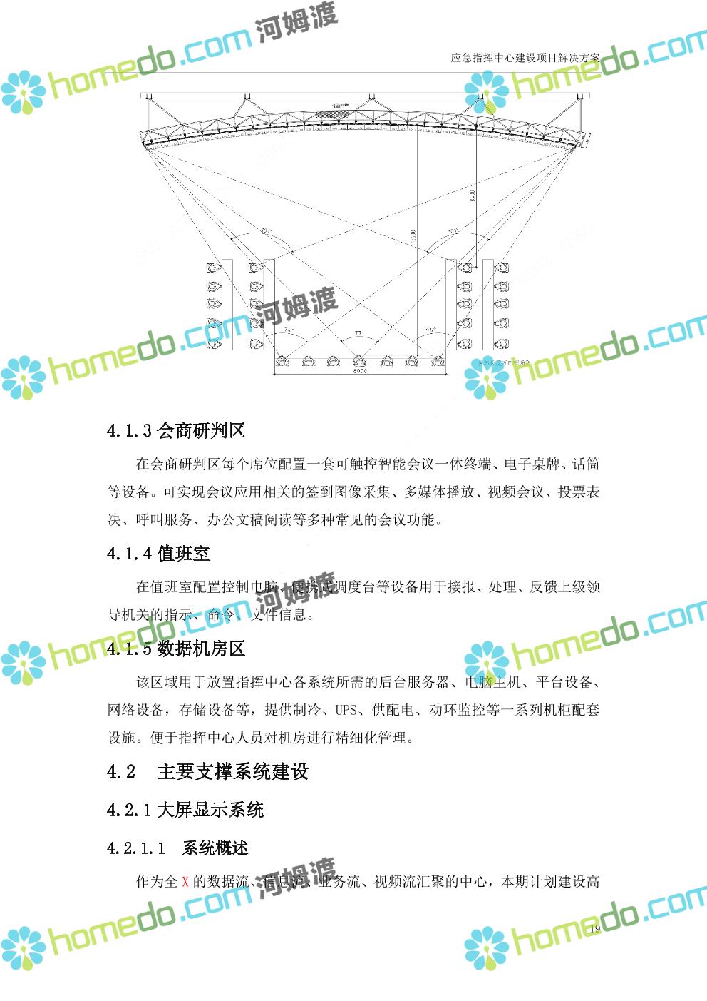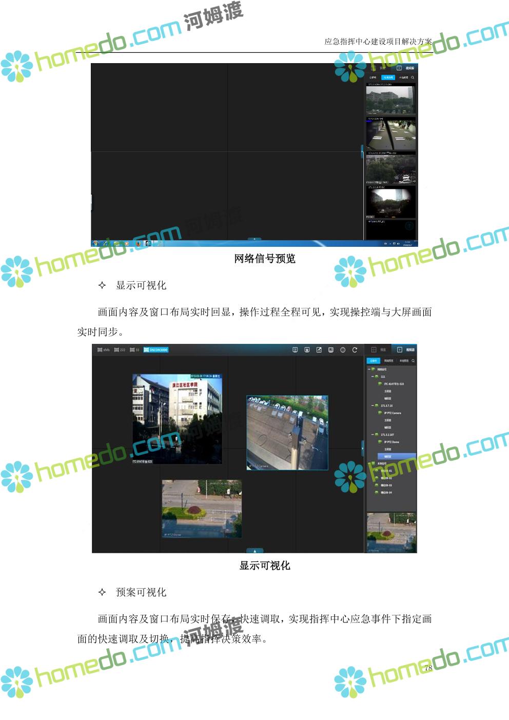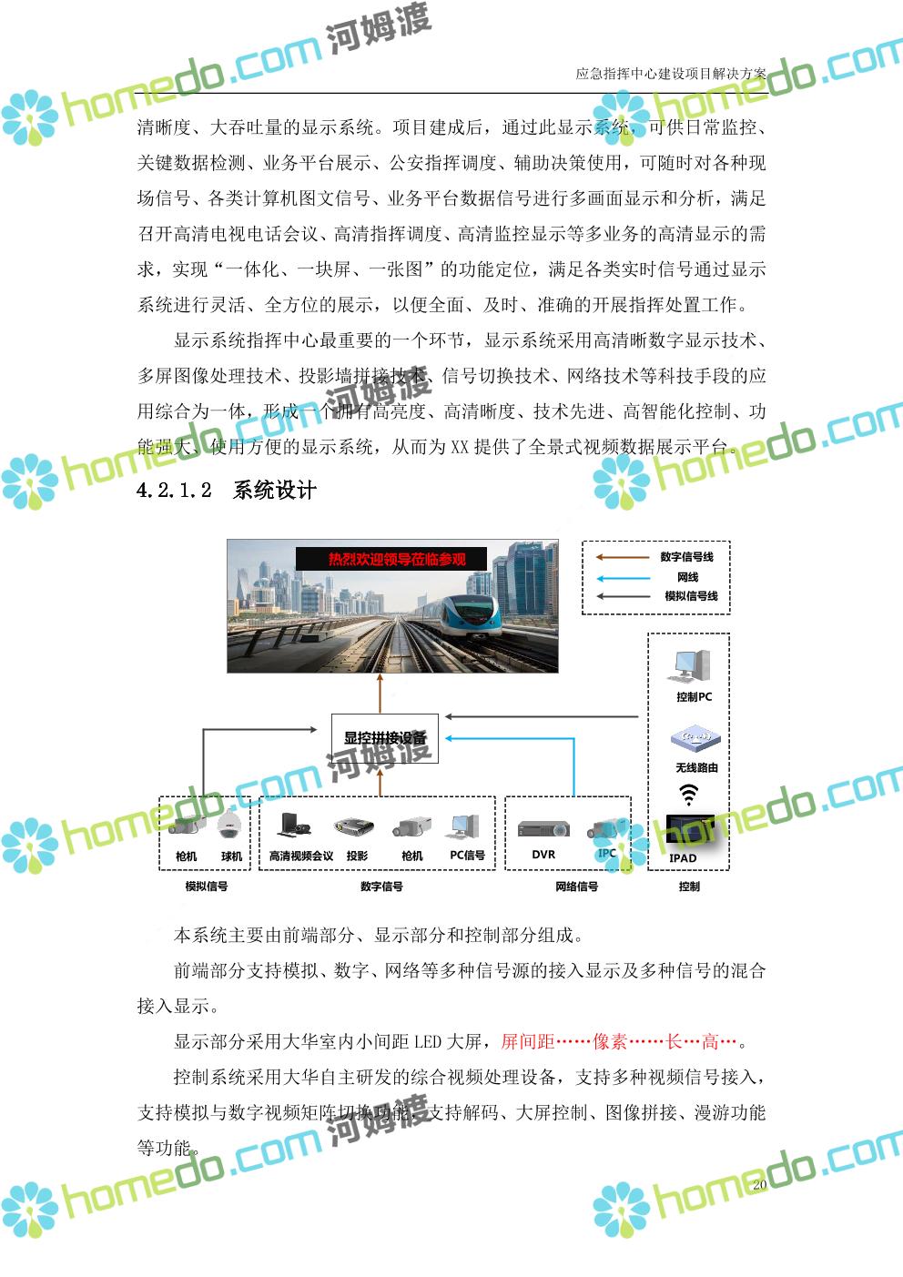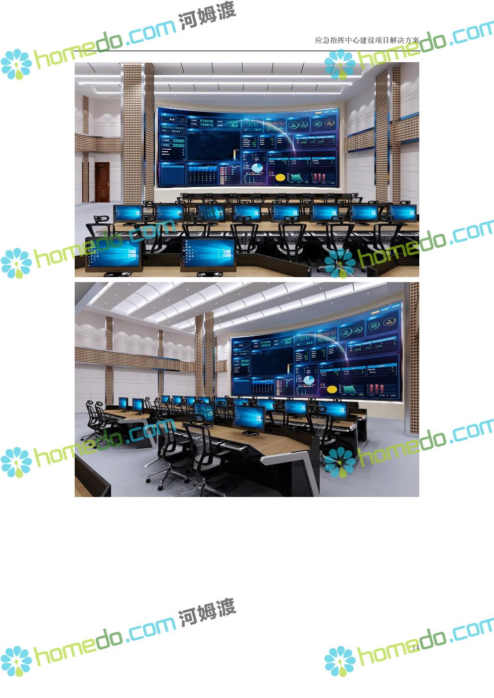 方案简介 根据指挥中心的实际需要,在指挥中心各个功能区部署大屏显示、音响扩声、融合通信、坐席管理、集中控制、视频会商、数据可视化及无纸化会议等设备,依托3G/4G、IP、PSTN等网络汇聚前端音视频资源,通过融合通信系统进行统一调度,将各类资源在指挥中心大屏展示。